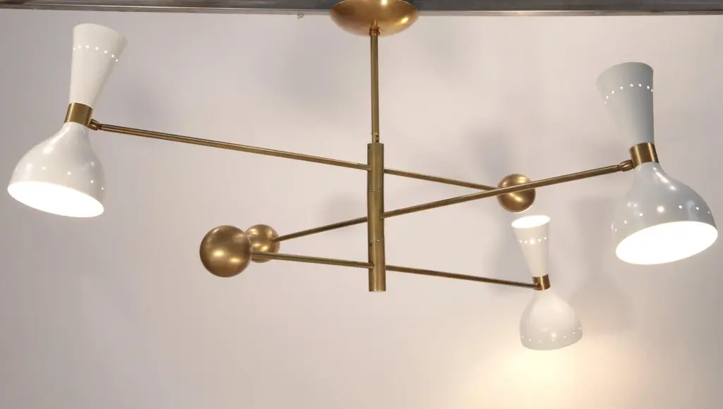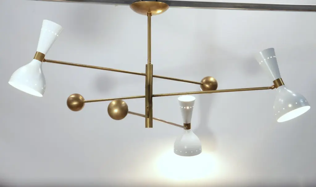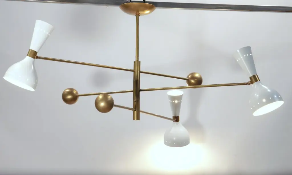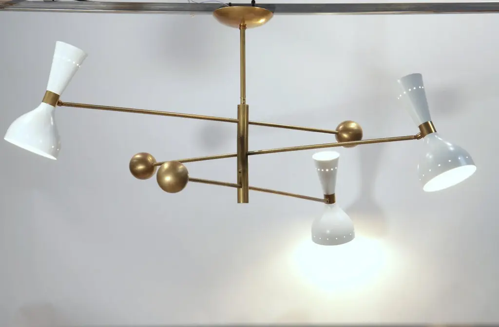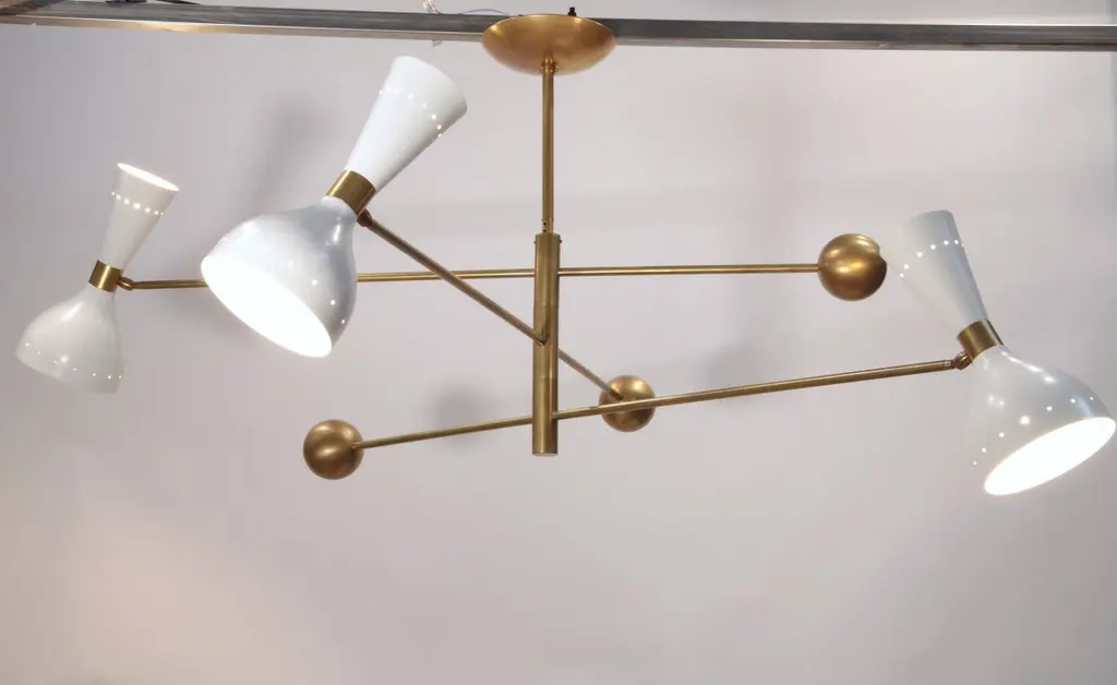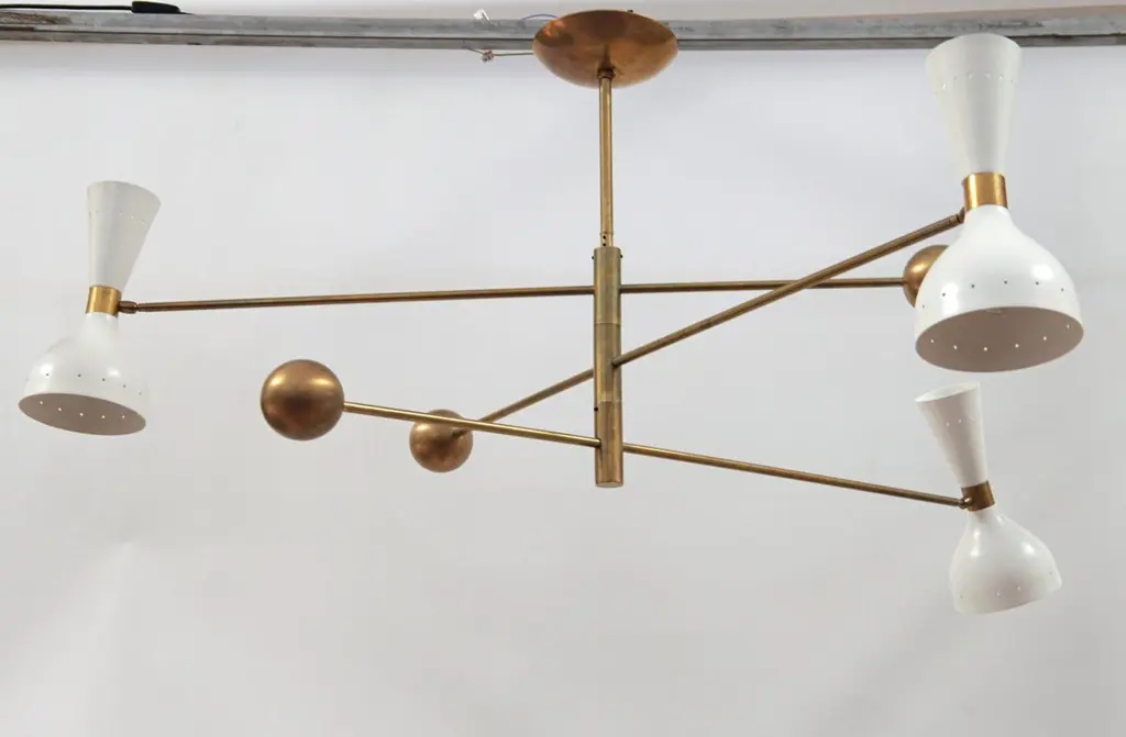 This 3-armed chandelier with twin shades is a versatile and elegant fixture perfect above a kitchen island, over a counter, dining table, or in a living room. The chandelier's three rotating arms and adjustable shades provide task lighting and customizable illumination options.The arms are balanced with a heavy cast brass sphere and rotate in an orbital movement around the stem. To ensure perfect balance, the sphere is filled with sand, reaching the point of no leverage. The hand-spun aluminum shades are lacquered with ivory powder paint and finished with an eggshell semi-matte sheen. They are connected to the arm with a pivot joint, allowing for a range of light orientations. Each shade holds two bulbs, with the larger shade fitting an E27/E26 A15 bulb for direct or task lighting, and the smaller cone holding a candelabra E14/E12 bulb for ambiance.The outline of the shades has been designed to echo the iconic 1950s pieces made by mid-century modern Italian studios Arteluce and Stilnovo, but with a unique and distinctive design that will add elegance and sophistication to any home.They can be customized with colors from the 1950s palette, such as ivory, sage and black. Other colors are available upon request.The stem features a rotating system with 180 degrees of motion on each arm, allowing for safe and easy adjustment of the chandelier's position. The standard brass finish features a beautiful noisette hazelnut patina achieved through the restorer technique of liver sulfur and uniformed with a polishing pad. Alternatively, the chandelier can be made with regular polished brass. The arms and body are crafted from natural solid brass and hand-finished.This chandelier is currently only made to order. Please contact us for any special size requirements.This fixture must only be installed by someone familiar with how the product is constructed and operated.