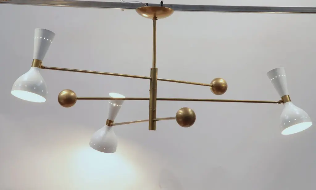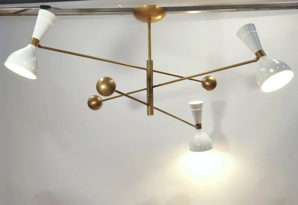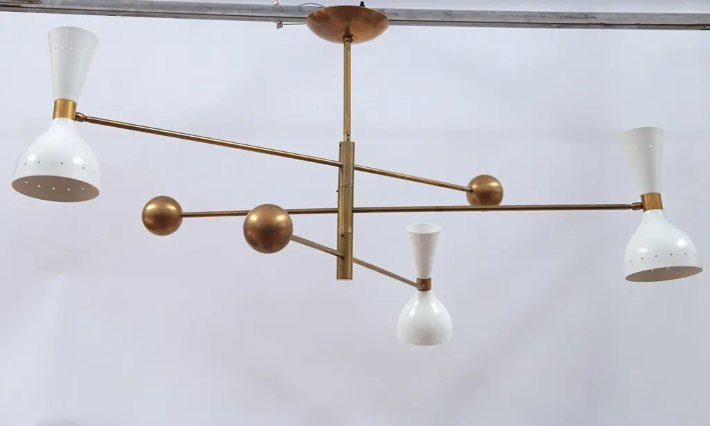 Orbitale Brass Chandelier 3 Rotating Balanced Arms, Stilnovo Style, Twin Shades