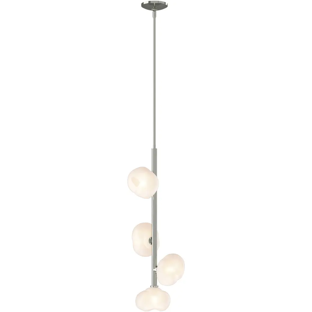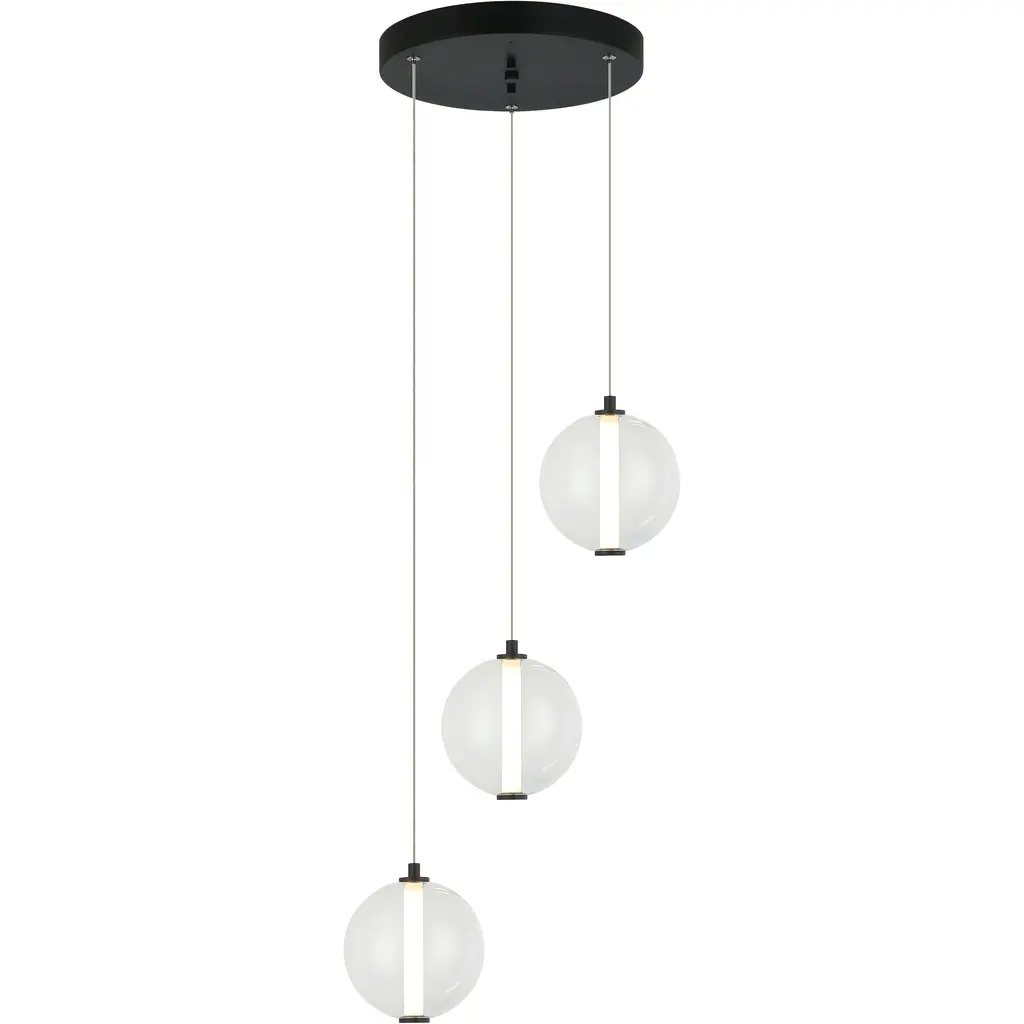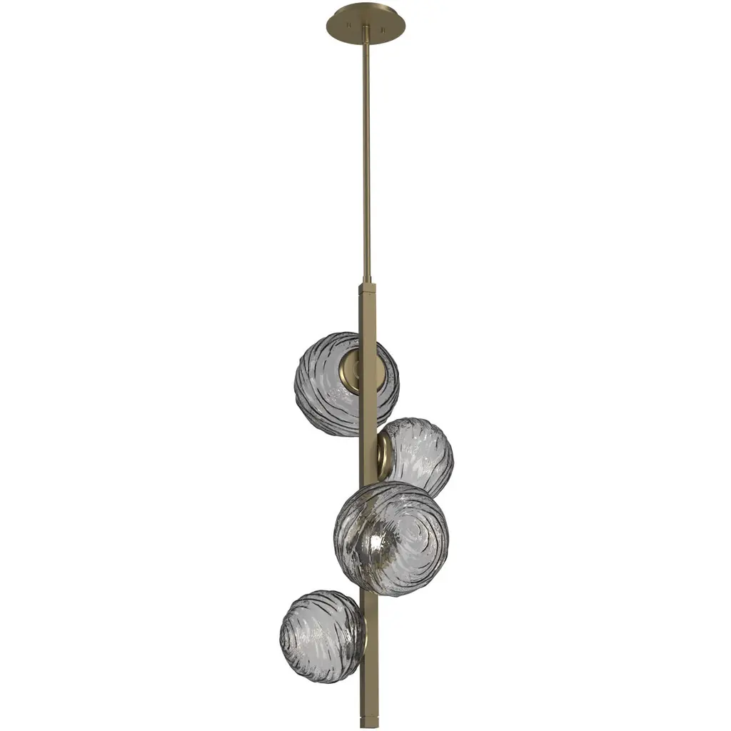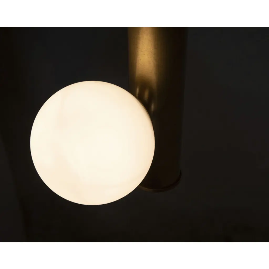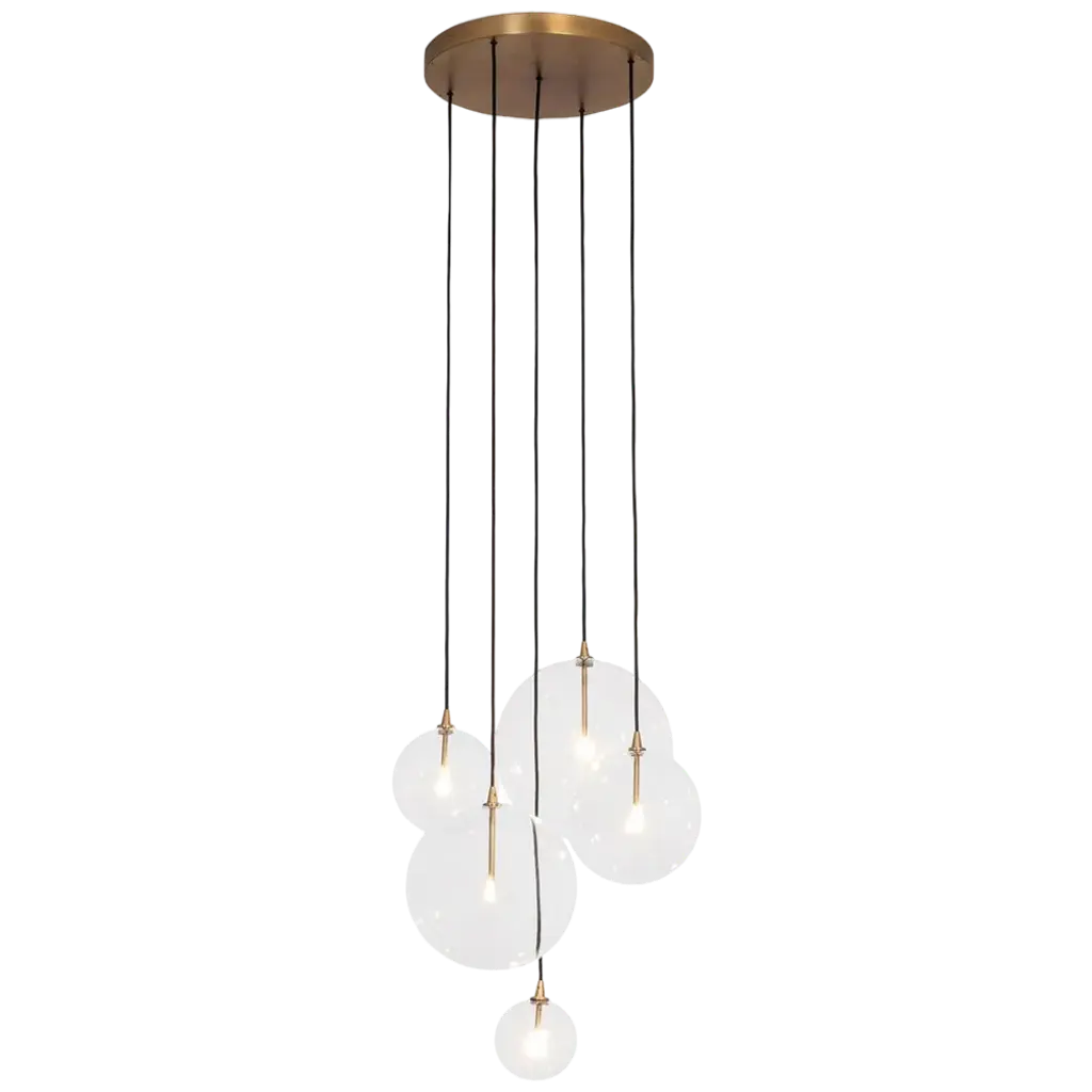Mid-century modern lines in antique brass finished metal support six glowing orbs in this retro-futurist take on a classic chandelier.