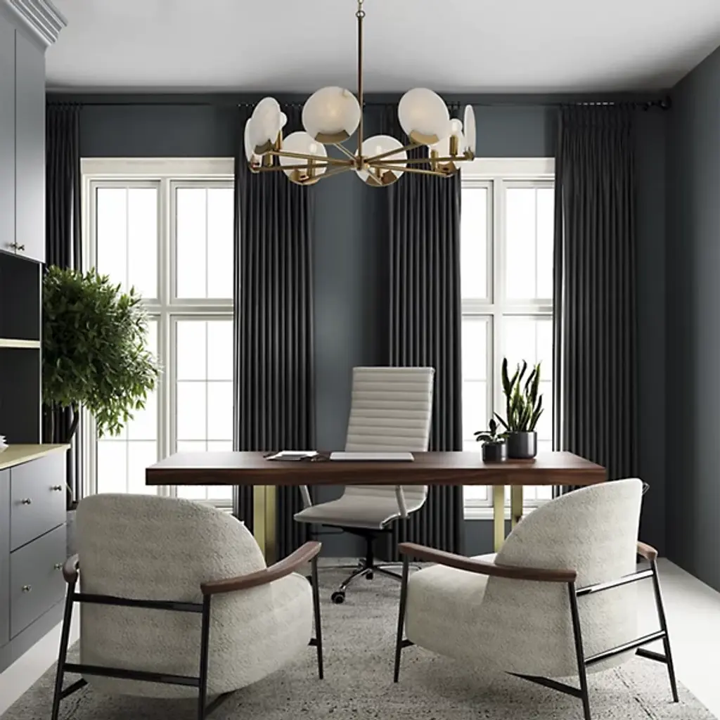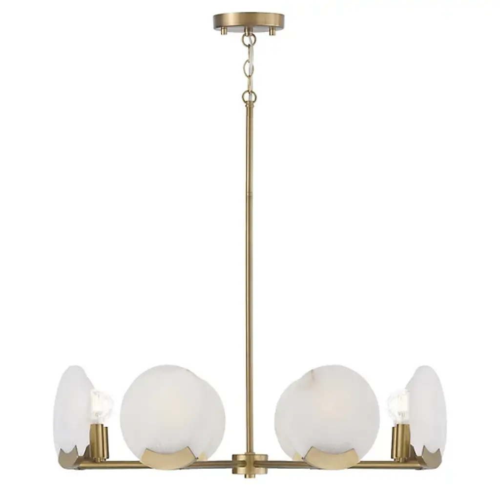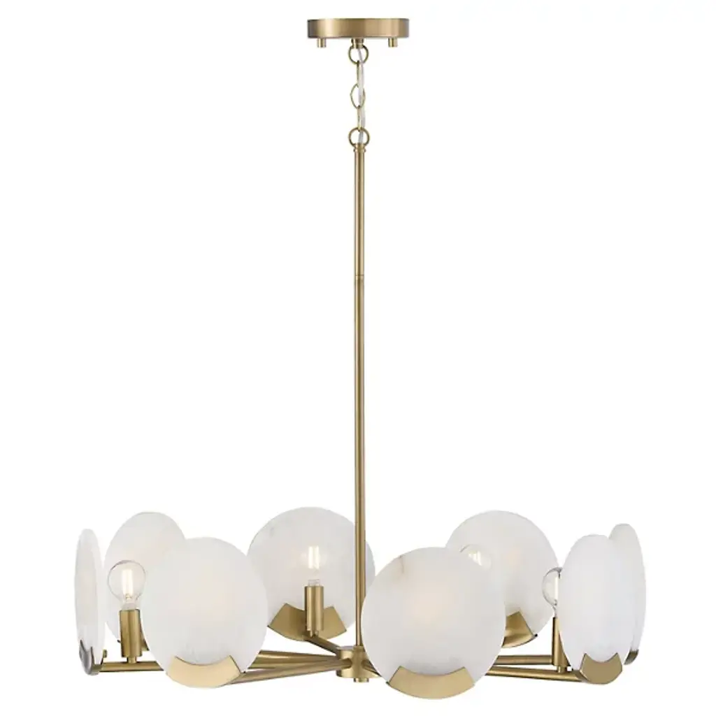 The Oriya Chandelier from Capital Lighting lets natural alabaster stone command the design narrative. Each disc exhibits distinctive veining and patterns that make your fixture truly one-of-a-kind. Light permeates through the stone's crystalline structure, creating a gentle glow that enhances surrounding spaces with natural warmth. The curved metal cradles present each alabaster piece deliberately, allowing them to shine as individual works of art. This fixture bridges the gap between raw, natural materials and refined design sensibility. The arrangement of stone discs around the central axis provides composed radiance while maintaining an airy, uncluttered appeal perfect for dining areas or entryways.