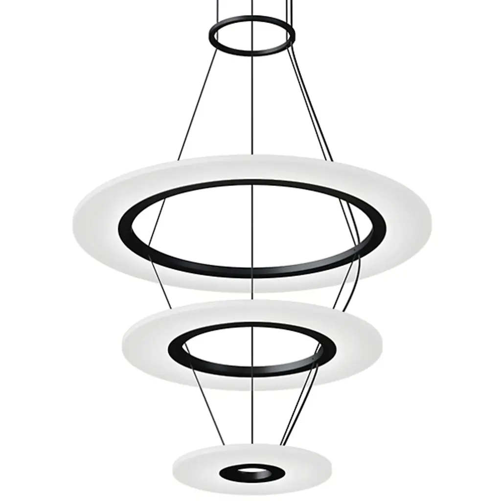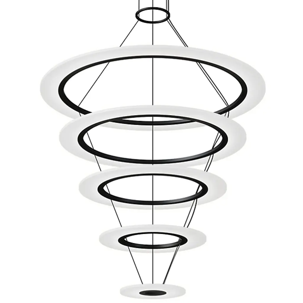 Streamlined and minimalist design. The Oros LED Chandelier from Kuzco Lighting is ideal for contemporary settings, adding a unique and striking statement piece to living rooms, dining rooms, and kitchens. Its structure is of a series of rings that connect to form a larger ring, each one hanging slightly at an angle to create a tapered appearance. This chandelier will last for a long time while resisting corrosion thanks to its Die-Cast Aluminum construction. Acrylic diffusers soften the LED light for an eye-pleasing glow.