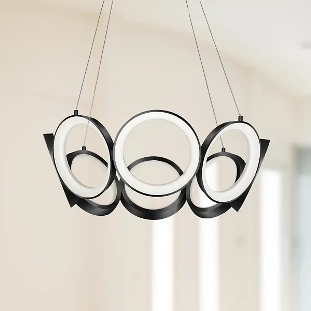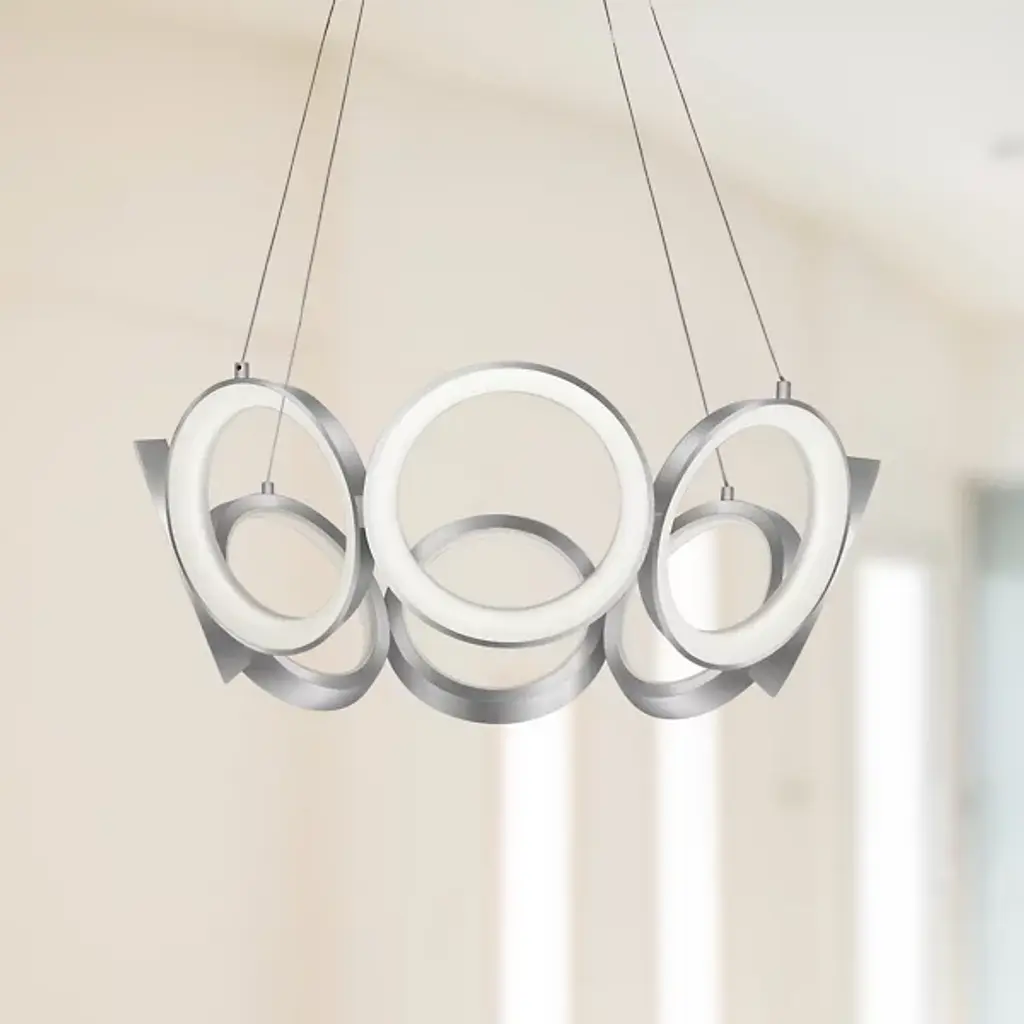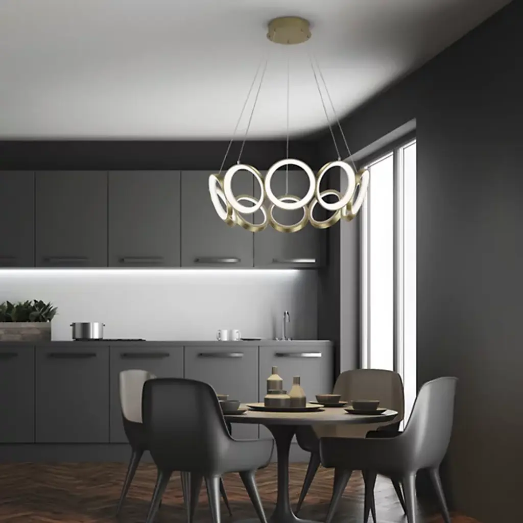 Streamlined and minimalist design. The Oros LED Chandelier from Kuzco Lighting is ideal for contemporary settings, adding a unique and striking statement piece to living rooms, dining rooms, and kitchens. Its structure is of a series of rings that connect to form a larger ring, each one hanging slightly at an angle to create a tapered appearance. This chandelier will last for a long time while resisting corrosion thanks to its Die-Cast Aluminum construction. Acrylic diffusers soften the LED light for an eye-pleasing glow.