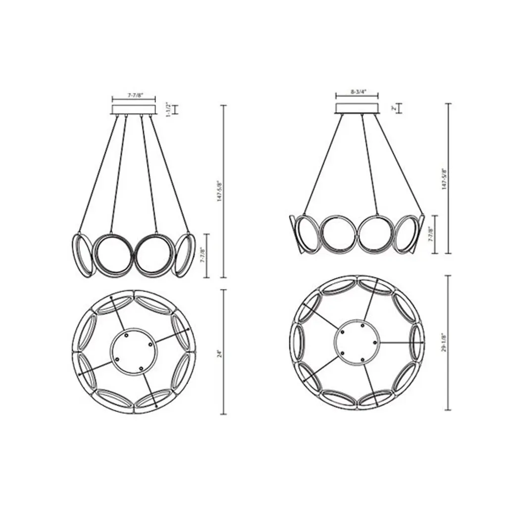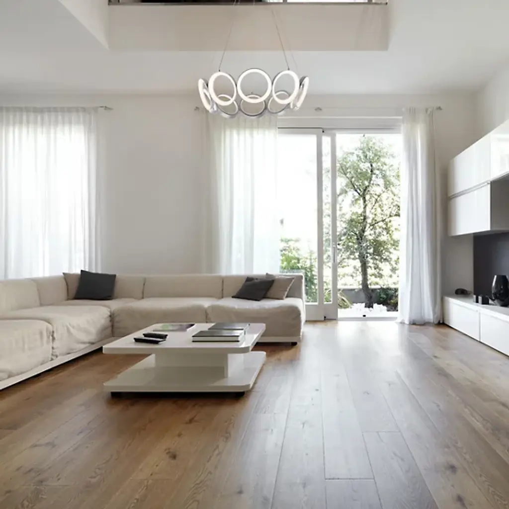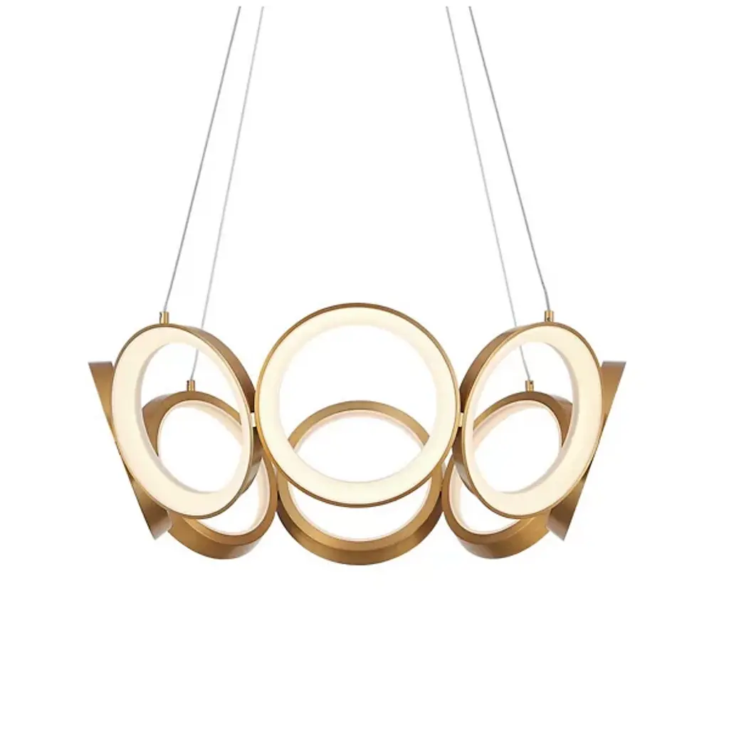Streamlined and minimalist design. The Oros LED Chandelier from Kuzco Lighting is ideal for contemporary settings, adding a unique and striking statement piece to living rooms, dining rooms, and kitchens. Its structure is of a series of rings that connect to form a larger ring, each one hanging slightly at an angle to create a tapered appearance. This chandelier will last for a long time while resisting corrosion thanks to its Die-Cast Aluminum construction. Acrylic diffusers soften the LED light for an eye-pleasing glow.