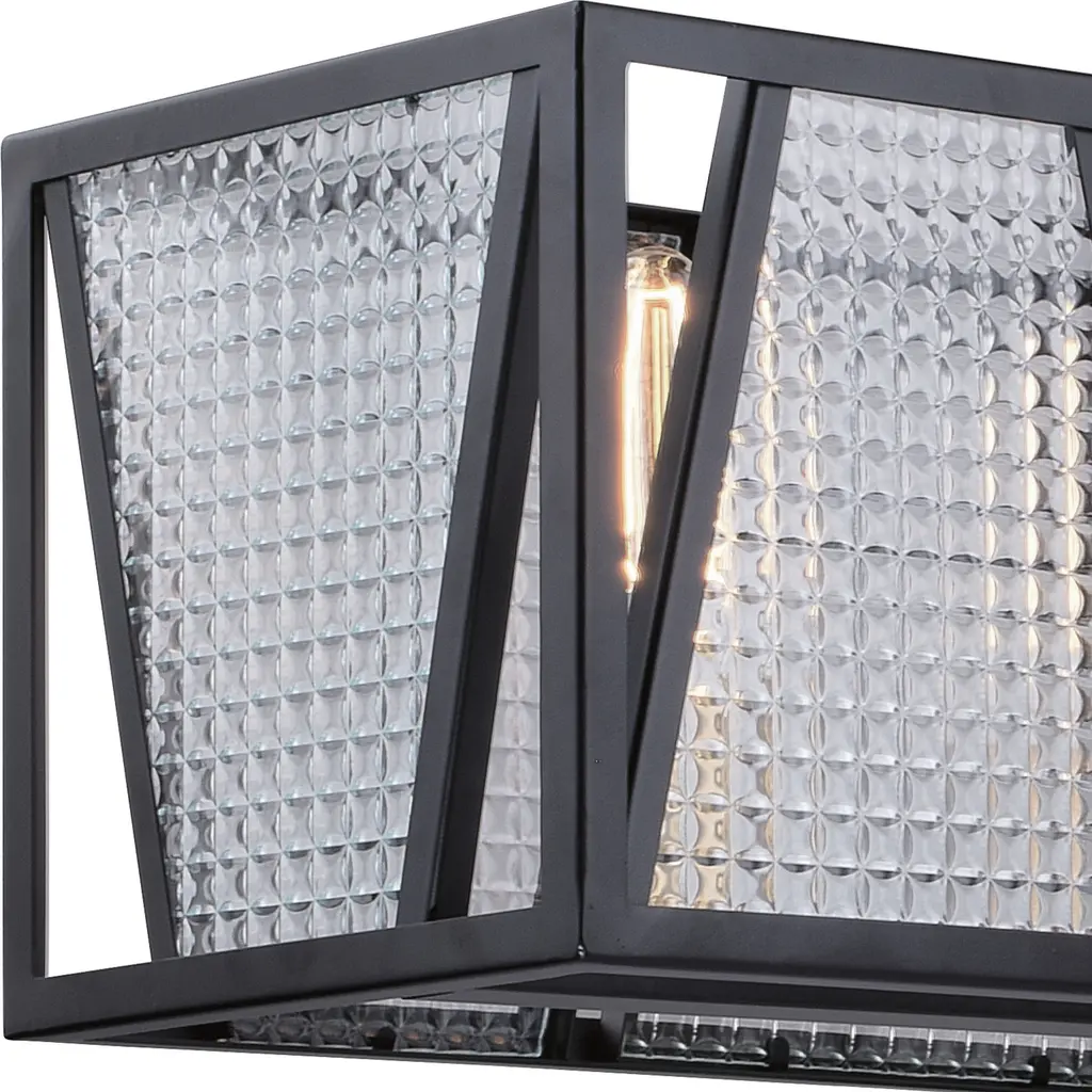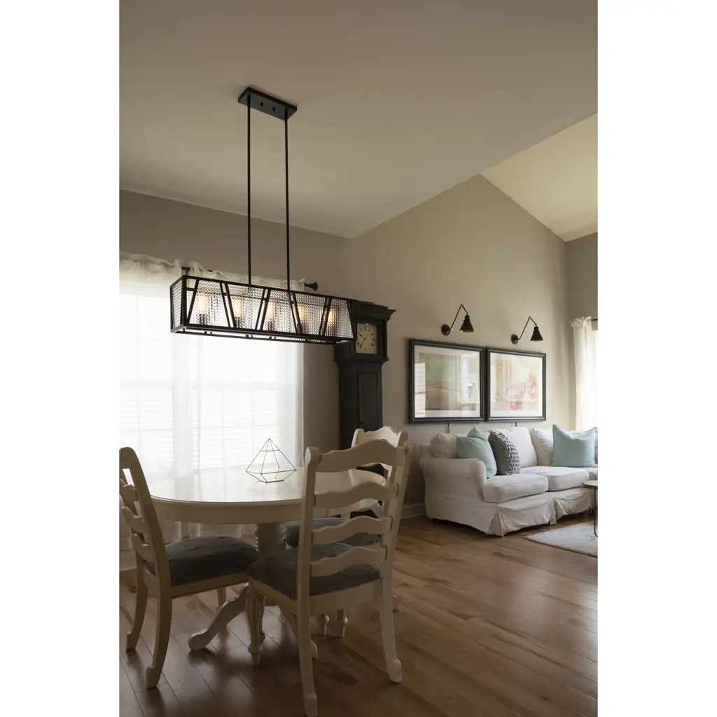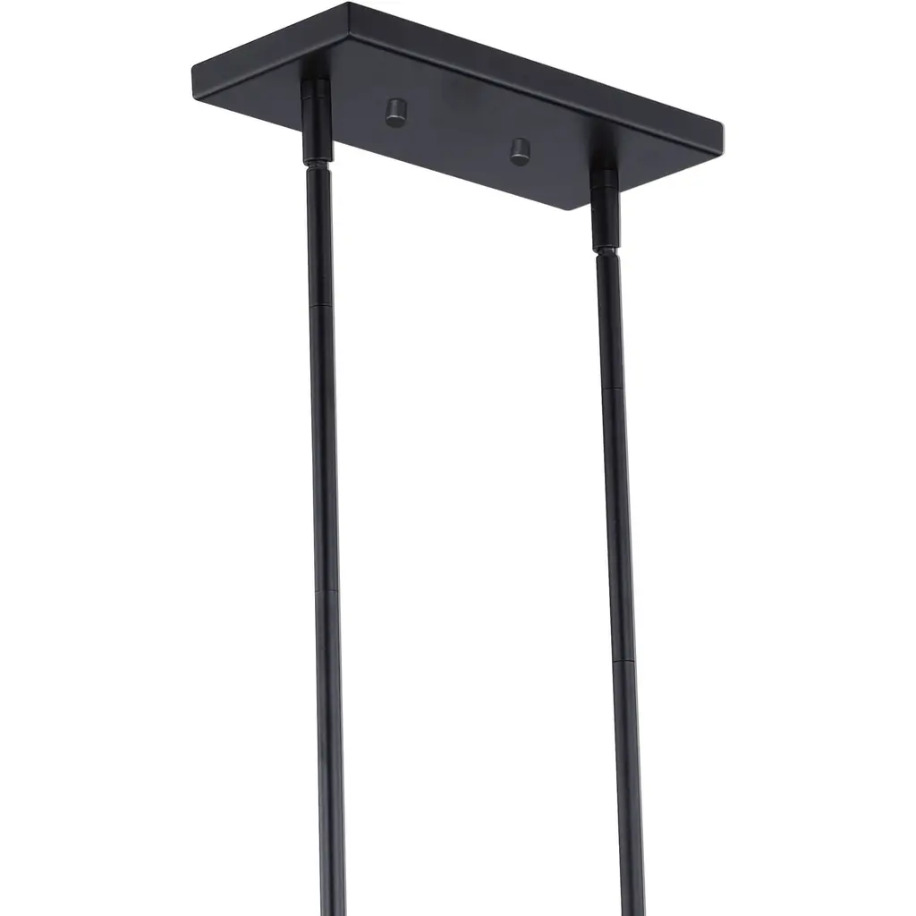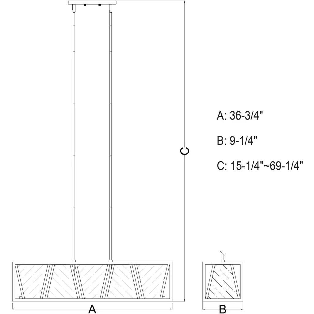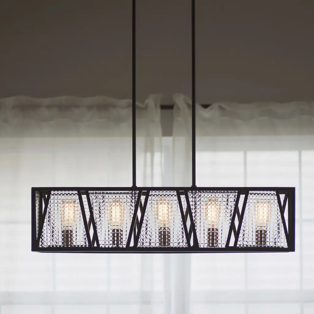 Contemporary styling perfectly paired with soft industrial overtones define the Oslo collection. Alternating tapered glass panes accented by black finished trim are framed in a sleek cage. The beautiful clear checkered glass creates a dramatic lighting effect to any contemporary, or even modern farmhouse, living space. The linear footprint of this chandelier will complement oval or rectangle dining room tables and is ideal for kitchen islands, dining areas, or bar areas. Height is adjustable with the included down rods compatible with sloped ceilings.