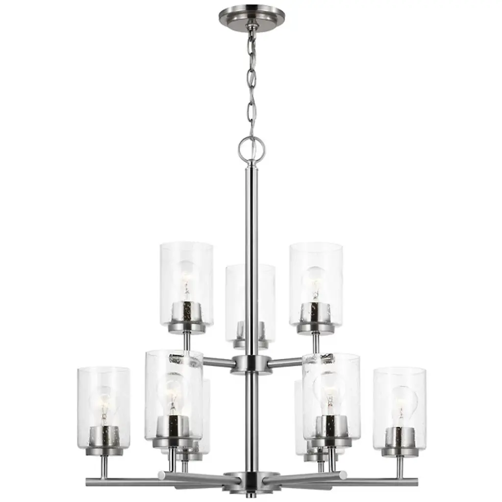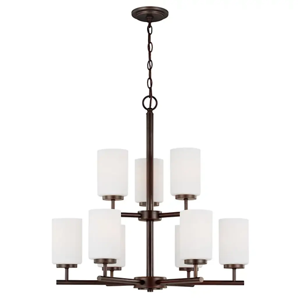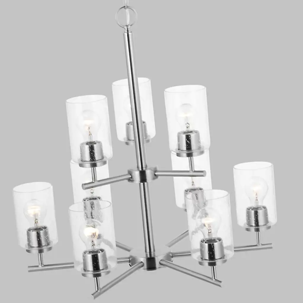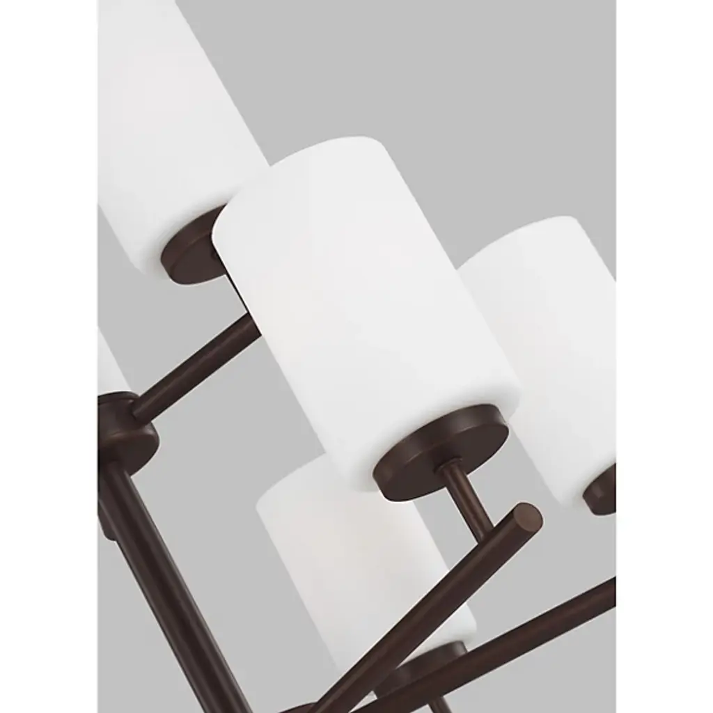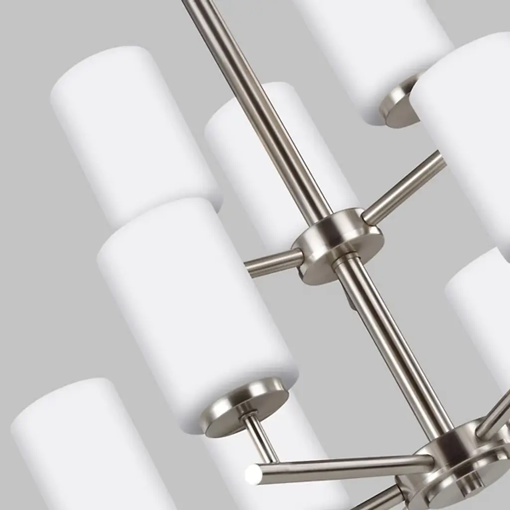 Brighten your interior décor with the Oslo Two-Tier Chandelier by Generation Lighting, formerly known as Sea Gull Lighting, Its clean, minimalist form consists of a number of interlocking Steel bars which meet at two central hubs and culminate in a series of Opal Etched glass shades. The lighting has both reflective and refractive qualities, providing an intriguing ambiance that is both pleasant and useful.