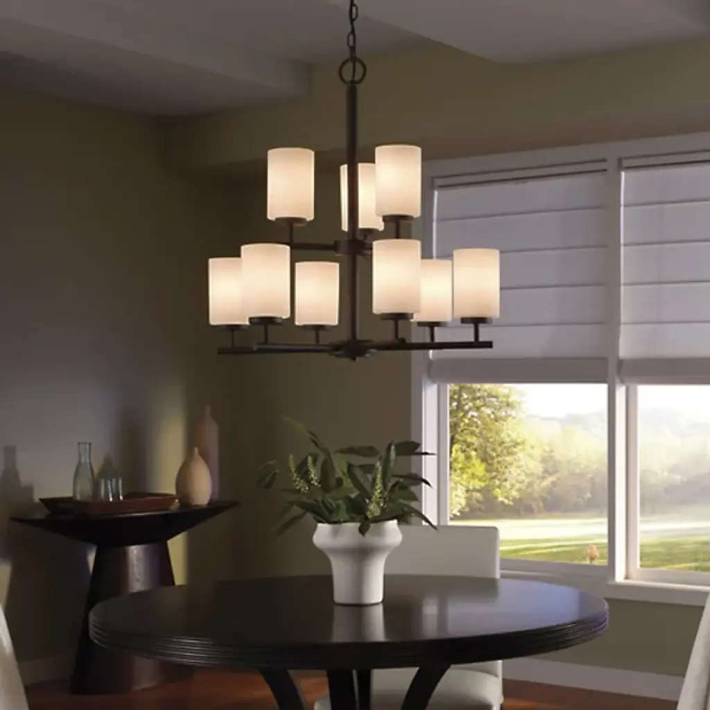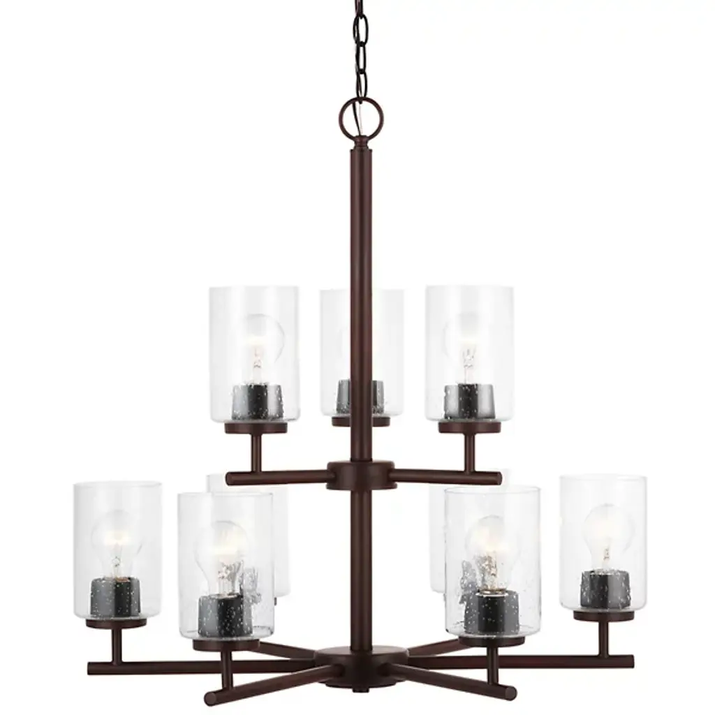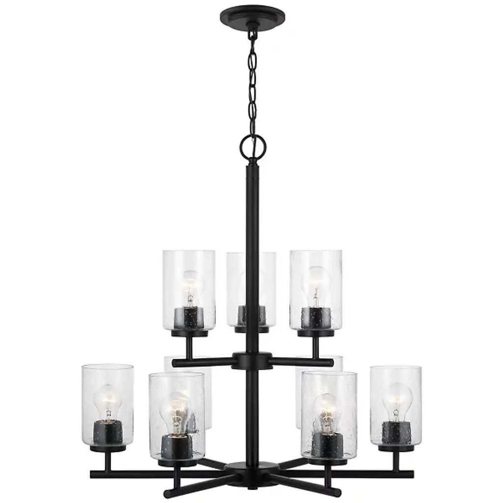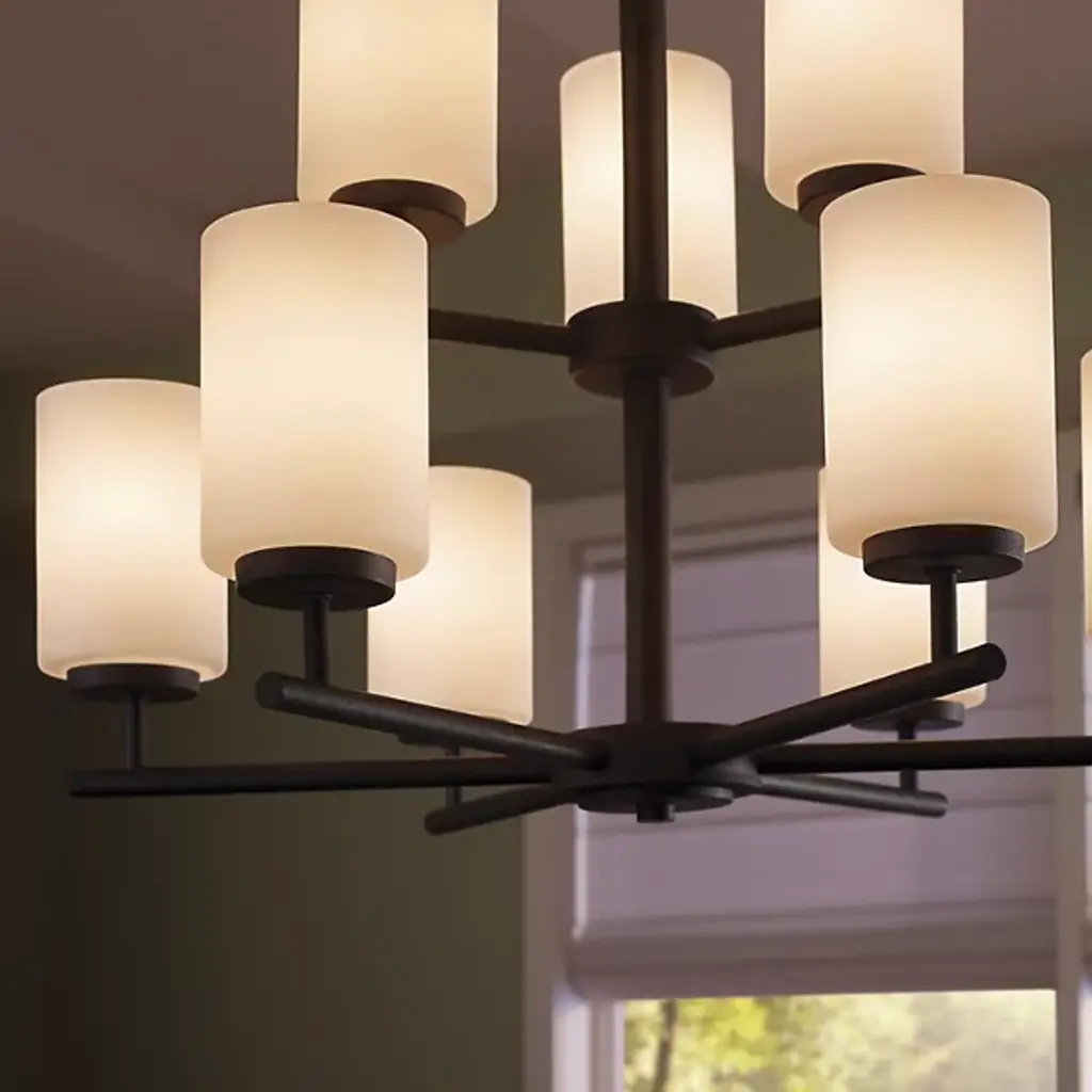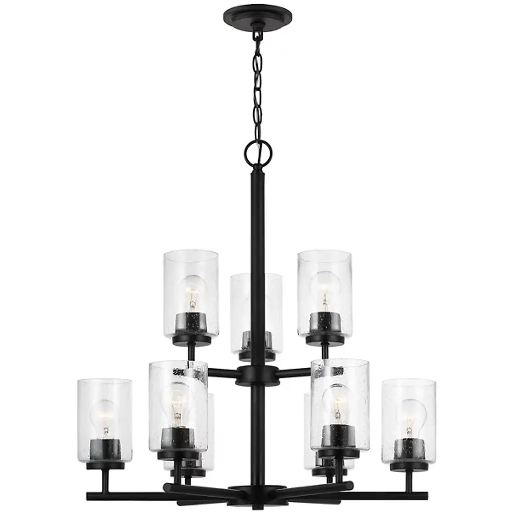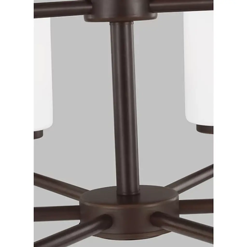 Brighten your interior décor with the Oslo Two-Tier Chandelier by Generation Lighting, formerly known as Sea Gull Lighting, Its clean, minimalist form consists of a number of interlocking Steel bars which meet at two central hubs and culminate in a series of Opal Etched glass shades. The lighting has both reflective and refractive qualities, providing an intriguing ambiance that is both pleasant and useful.