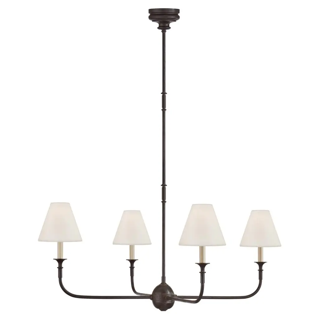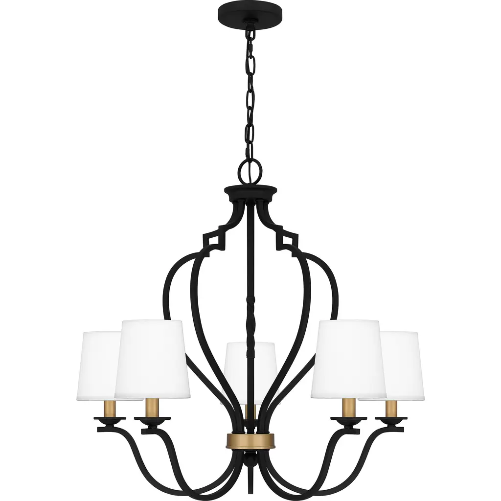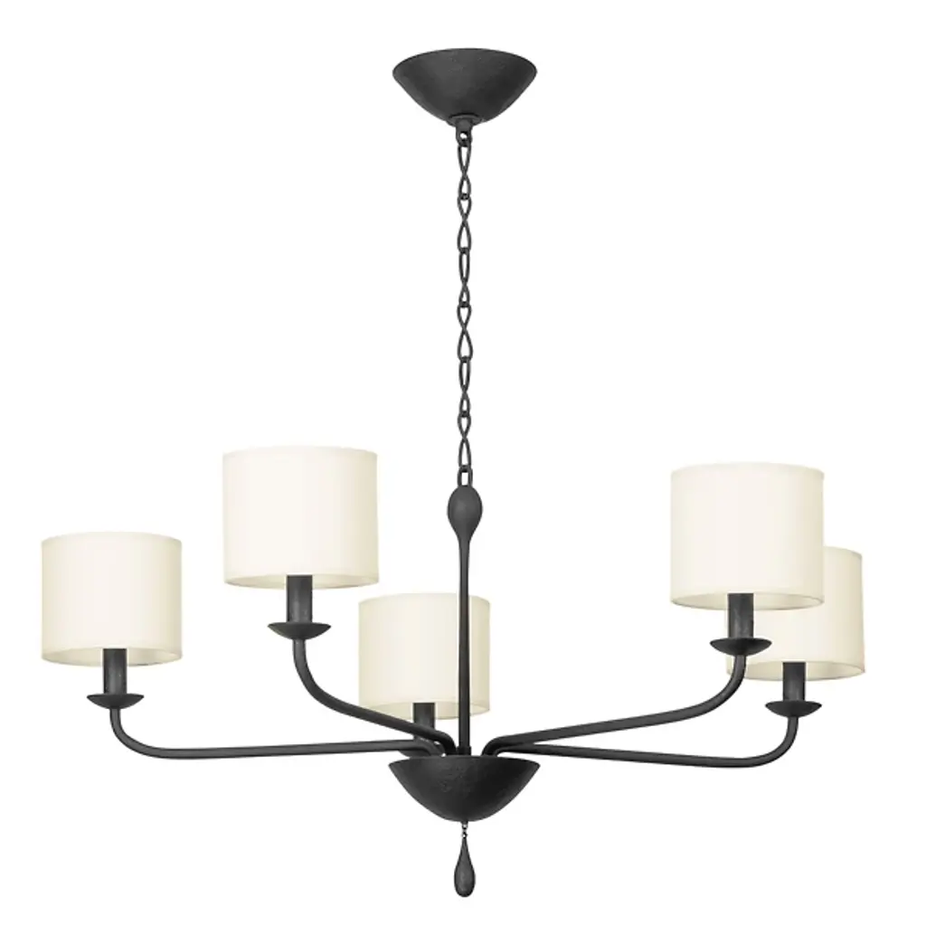 The Osmond Chandelier from Troy Lighting elevates the traditional slender arm, candlestick, and drum shade combination with captivating, textured metalwork and an elegant teardrop dangle accent that adds grace and length to the silhouette. This design exudes a refined and feminine charm in Vintage Gold Leaf, while the Black Iron finish brings an edgier, more dramatic allure. It blends timeless tradition and contemporary sophistication, making it versatile for various interior styles and spaces.