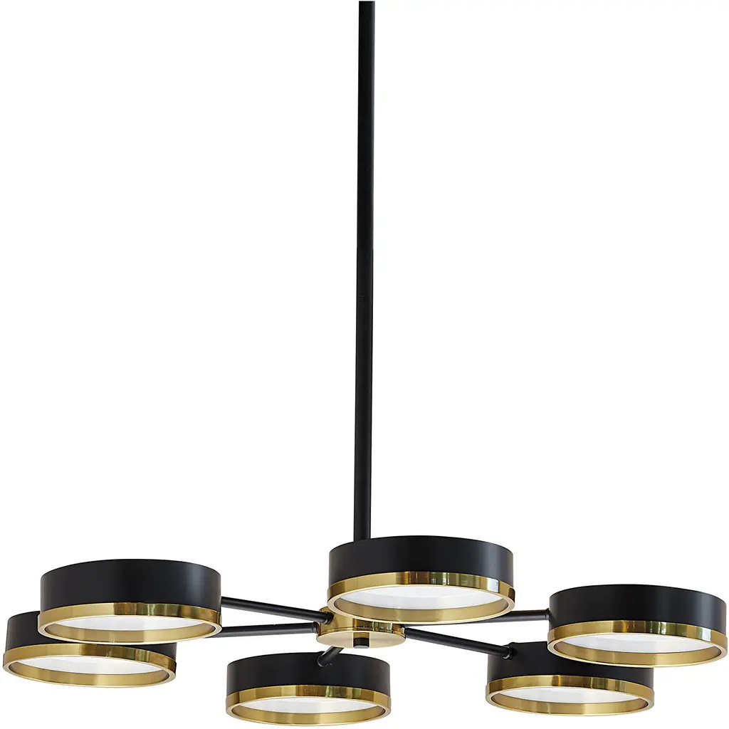 This modern chandelier is a beautiful focal point through living, lounge and dining spaces. Features six round lights in black and gold iron.