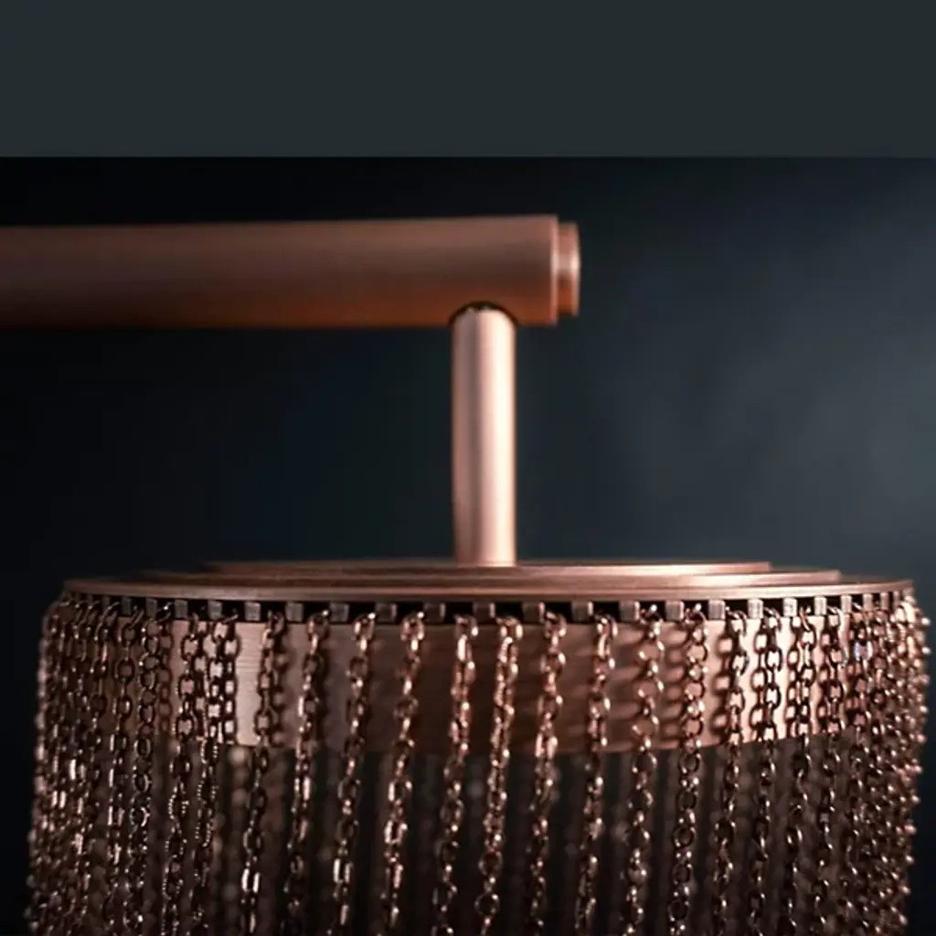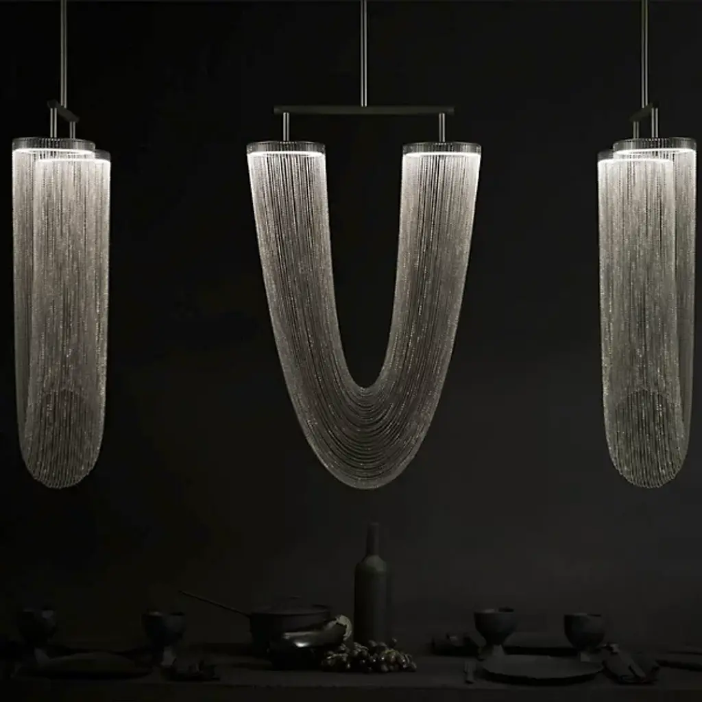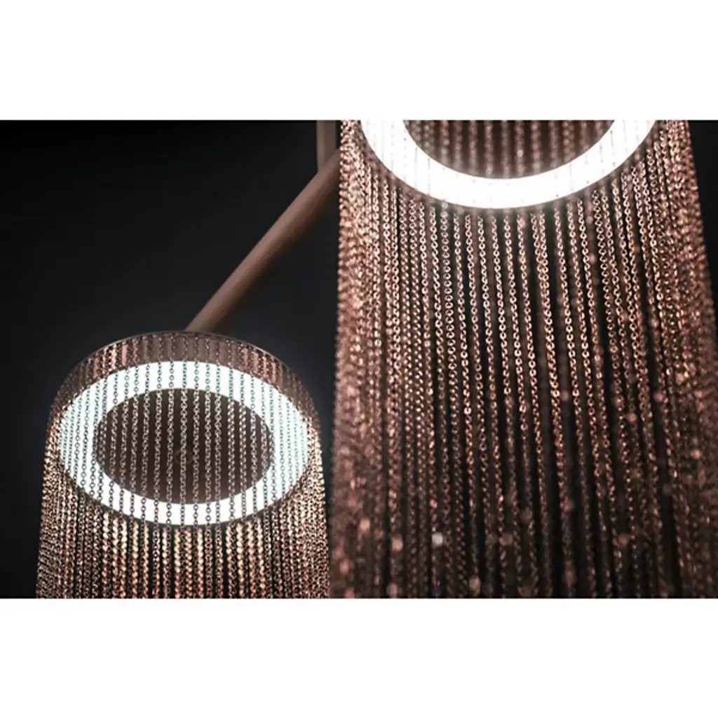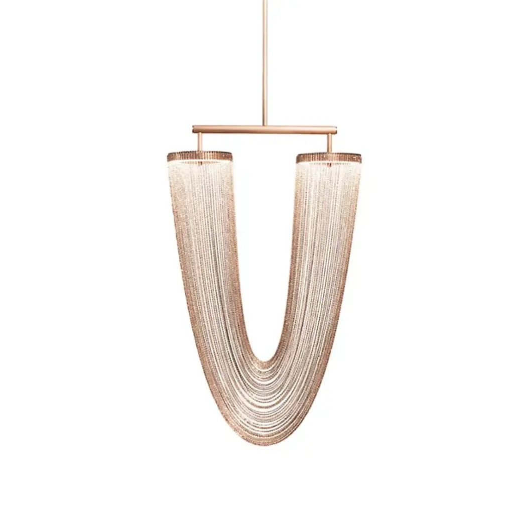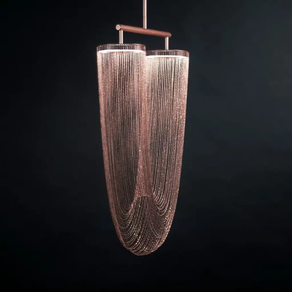 The Otero LED Chandelier by Larose Guyon is a design that was inspired by jewelry and is named after the dancer, courtesan, and emblem of beauty in Paris, Caroline Otéro. Known as La Belle Otéro, she made her place in the cultural scene through her exotic style and passion for jewelry, and this handcrafted design has an elegant, curved silhouette created by a collection of delicate chains. Rings at the top of this piece provide the layer of light that playfully filters through the textured, sculptural layers of these jewelry-like strands, creating a magical atmosphere.