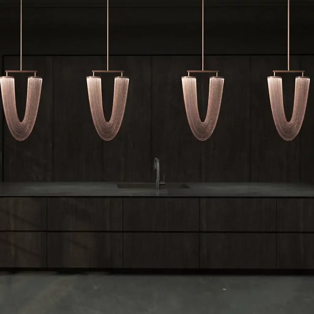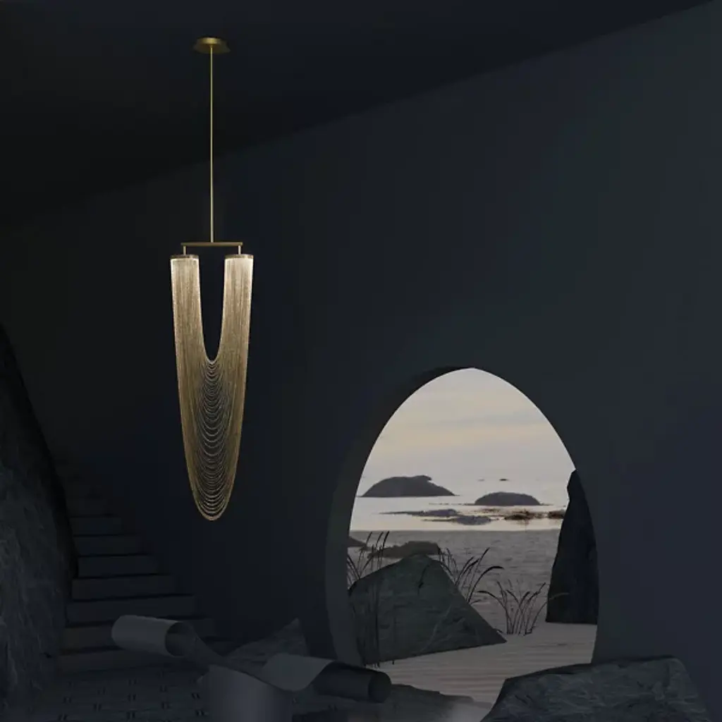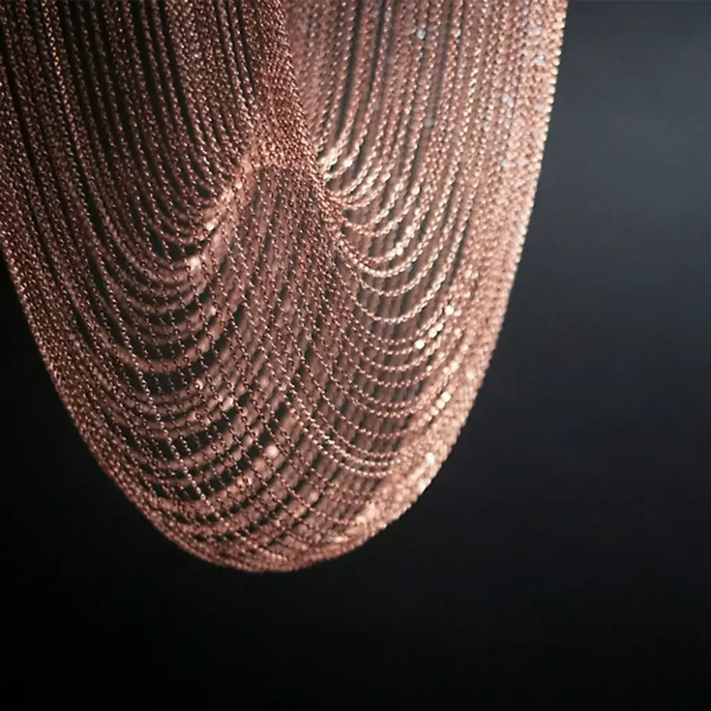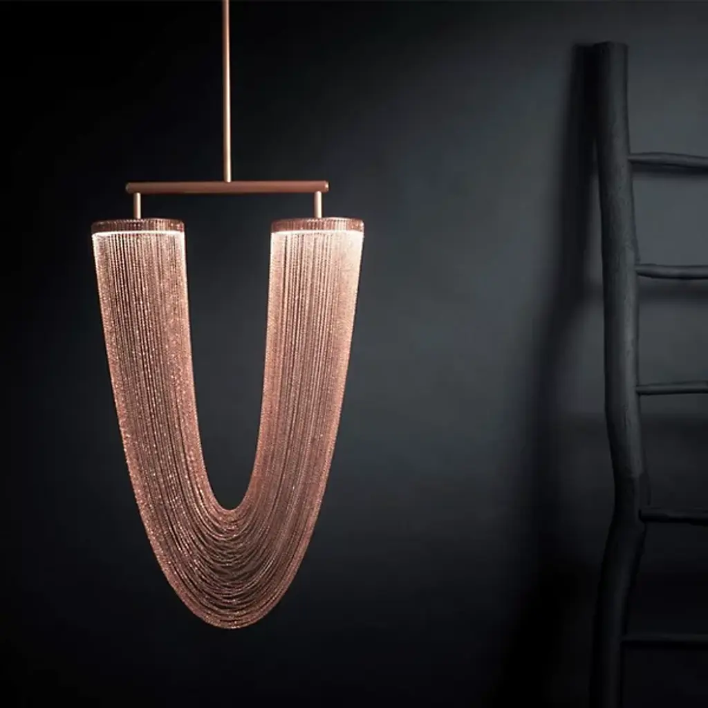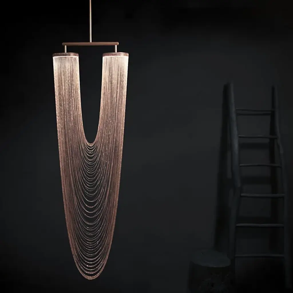 The Otero LED Chandelier by Larose Guyon is a design that was inspired by jewelry and is named after the dancer, courtesan, and emblem of beauty in Paris, Caroline Otéro. Known as La Belle Otéro, she made her place in the cultural scene through her exotic style and passion for jewelry, and this handcrafted design has an elegant, curved silhouette created by a collection of delicate chains. Rings at the top of this piece provide the layer of light that playfully filters through the textured, sculptural layers of these jewelry-like strands, creating a magical atmosphere.