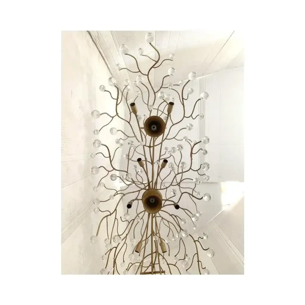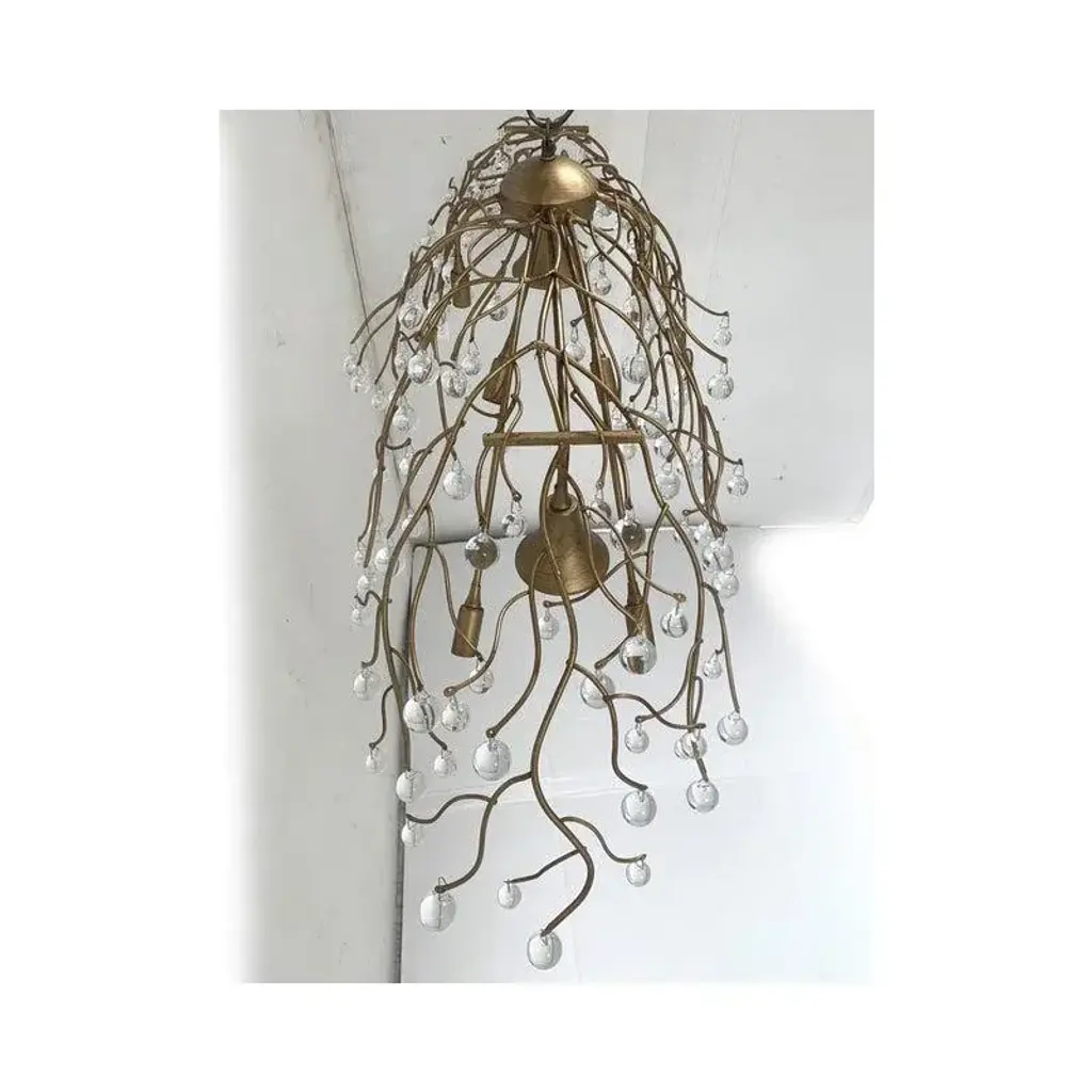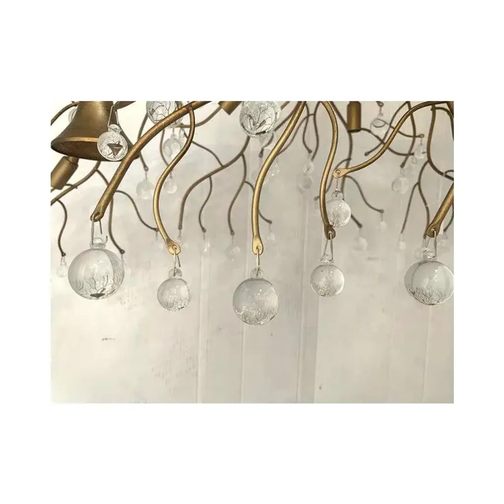 Brushed gold florentine wrought iron boughs chandelier florentine art gold metal wrought iron chandelier made in italy brushed gold hand-made italian very particolular finishing , impressive wrought iron florentine art made in italy entirely made in italy, fruit of high italian know-how,elegant and luxury piece of art. the beauty lies in the movement of the boughs and transparents cristal balls murano glass. dimensions (cm/in): oval l129 x 50 cm h 40 cm /l 51"x 19.6" h 15.7" chain 19.7″ more canopy 10 x g9 + 3 bulbs. up to 250v (europe/uk standard).
