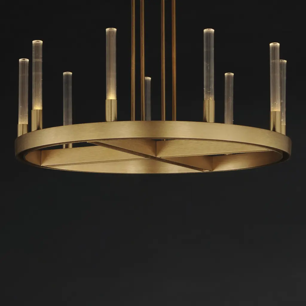 A modern tribute to the wheel chandelier, the Ovation collection integrates LED technology for a dazzling lighting effect. The LED light produces a shimmering lighting effect along the tall and narrow fluted glass shades adding celebratory effervescence. The expansive diameters of the rings join at the center in equipoise using four down rods to suspend the frame. Mount the chandelier from the collector or make use of additional chain supplied to extend the height with ease. Additional sconces with up and down lighting complete the design. Available in Brushed Brass or Black, the collection toasts a classic design creating an elegant statement.