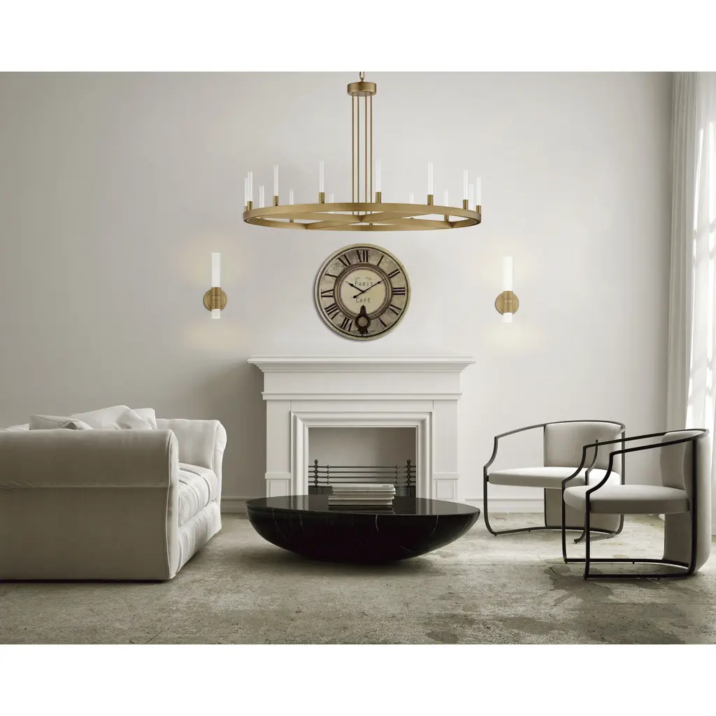 A modern tribute to the wheel chandelier, the Ovation collection integrates LED technology for a dazzling lighting effect. The LED light produces a shimmering lighting effect along the tall and narrow fluted glass shades adding celebratory effervescence. The expansive diameters of the rings join at the center in equipoise using four down rods to suspend the frame. Mount the chandelier from the collector or make use of additional chain supplied to extend the height with ease. Additional sconces with up and down lighting complete the design. Available in Brushed Brass or Black, the collection toasts a classic design creating an elegant statement.