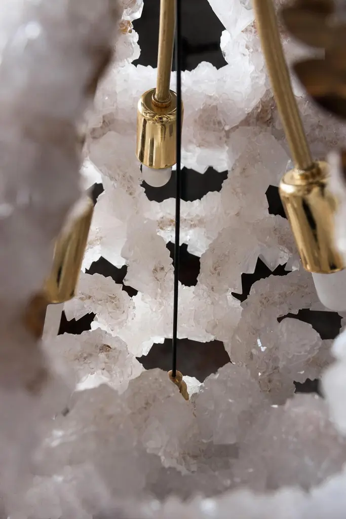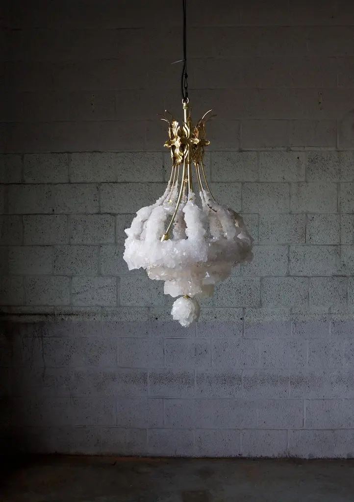 Overgrown chandelierDimensions: 75 x 40 x 40 cmWeight: Approximate 7kgMaterial: Antique French chandelier, natural grown (white) crystalUnique pieceCrystal can also be in grey / black.This world is cluttered with stuff, how would the world look like a few thousand years from now?Overgrown is a series of chandeliers and candlesticks that appear to be relics from a desolate flooded world. Atelier Mark Sturkenboom designed a fluid which allows objects to grow crystals over a period of time. He reclaimed antique French chandeliers and created the perfect conditions to set a hype revolution in motion.Every object grows out to be a unique piece.Mark Sturkenboom (Driebergen, 1983) is an artist that graduated with honors in 2012 at Artez Academy for the Arts in Arnhem/Netherlands. Since 2012 he works as a conceptual product designer/artist in his atelier in Utrecht.His work balances between art and design, he stretches the boundaries between art and design. He offers new viewpoints and rituals to deal with life.‘My focus lies not on the appearance of things, but on what I call the deeper layers in the relation between an object and its owner. ‘I try to call forward a myriad of associations and stimulate our thinking about what counts to us in our lives.I examine the meaning of objects and products and set them free from their conventional and initial use.’Sturkenboom reinterpretates products that are often intertwined with the themes love, time or has an inclination with a collective value perception.Engaging his work, you probably will need to start making ‘moral’ decisions. For instance his Ark, table clock, urn or vase are not just functional or only good looking.In their presence and while handling them they invite you to think about time, love passed or the possibility to free yourself from the burden of your possessions by destroying them.His work is exhibited and part of private collections worldwide, from New York to Shanghai, from Tokio to Amsterdam.