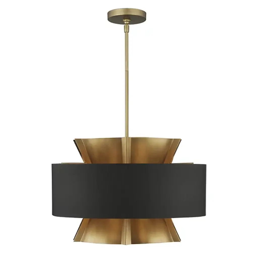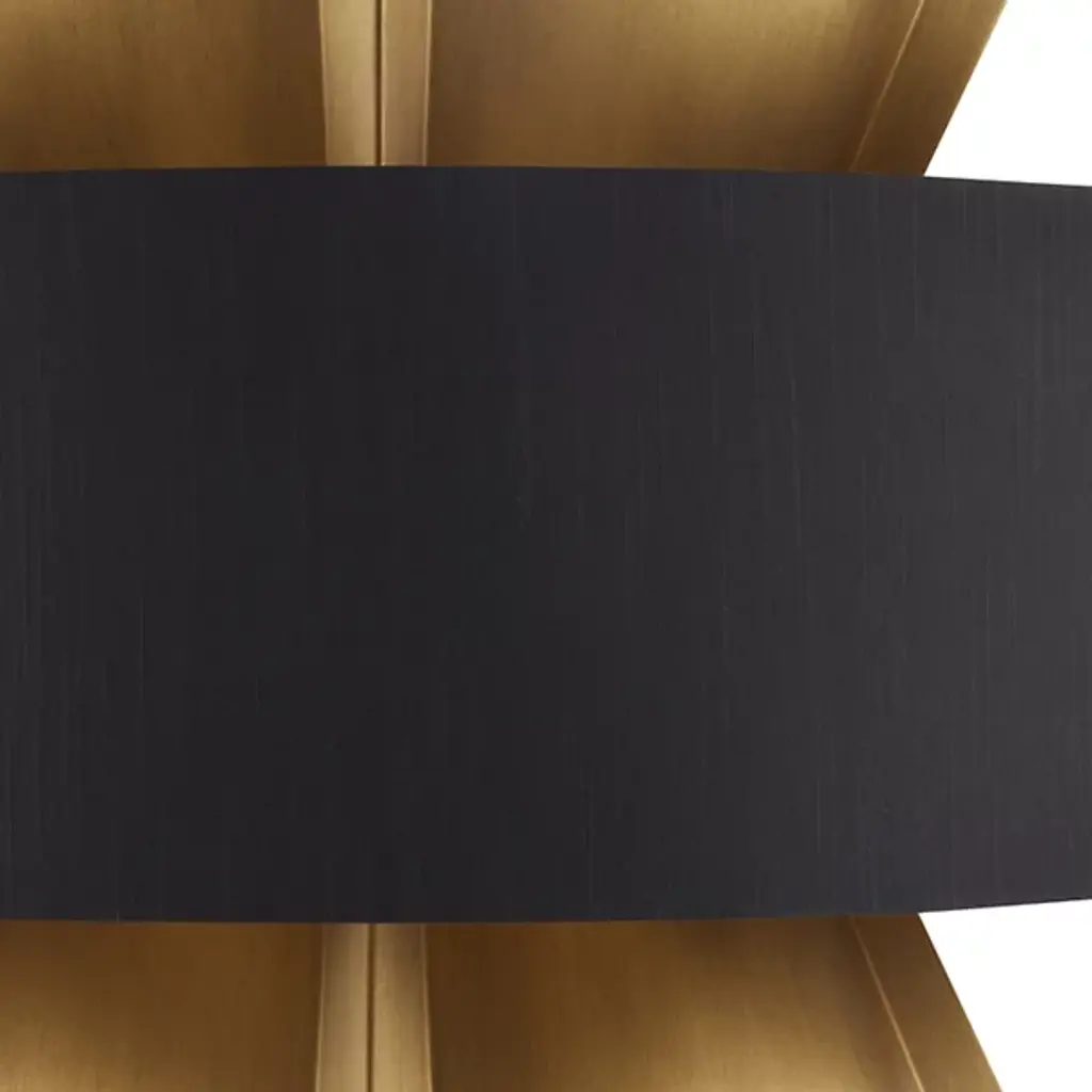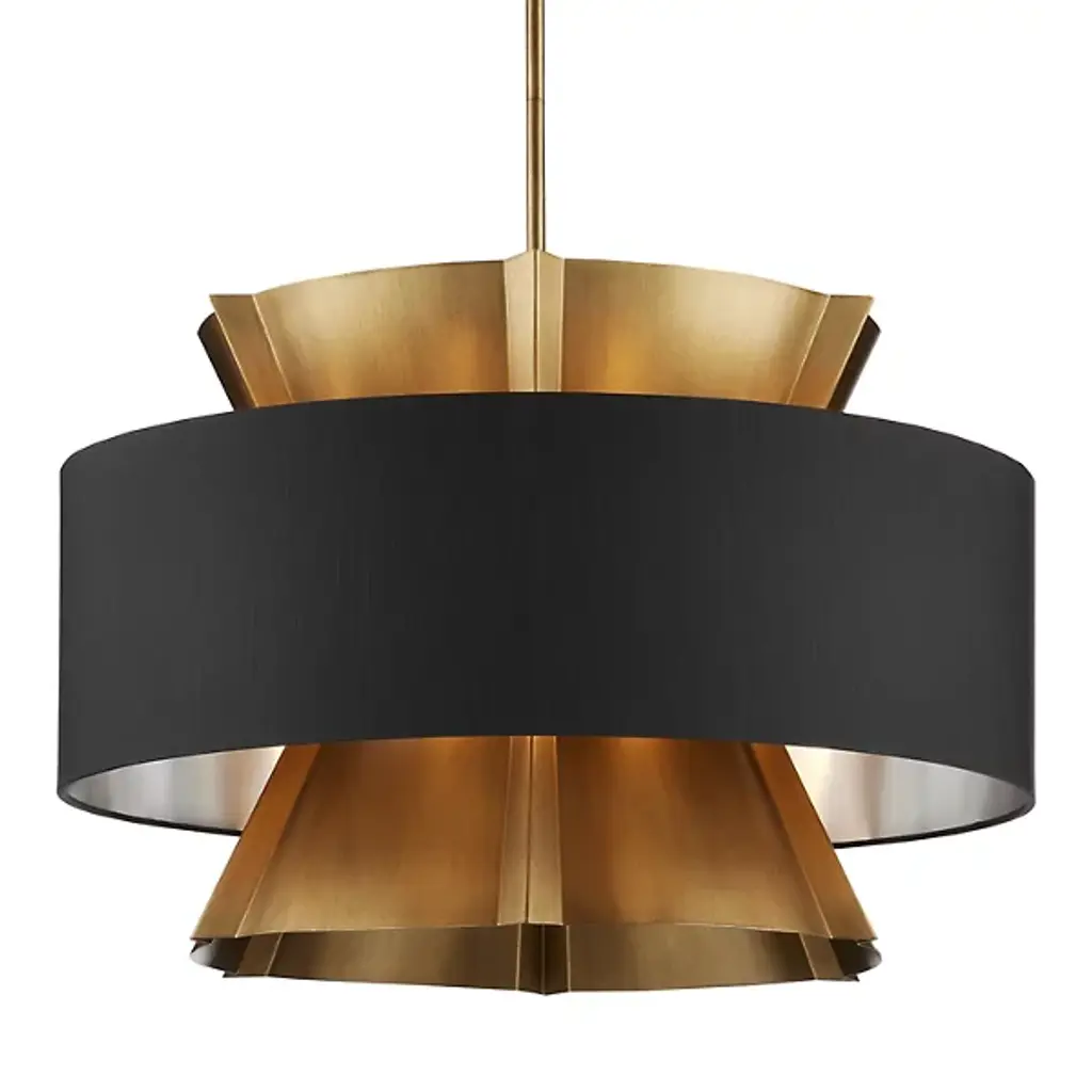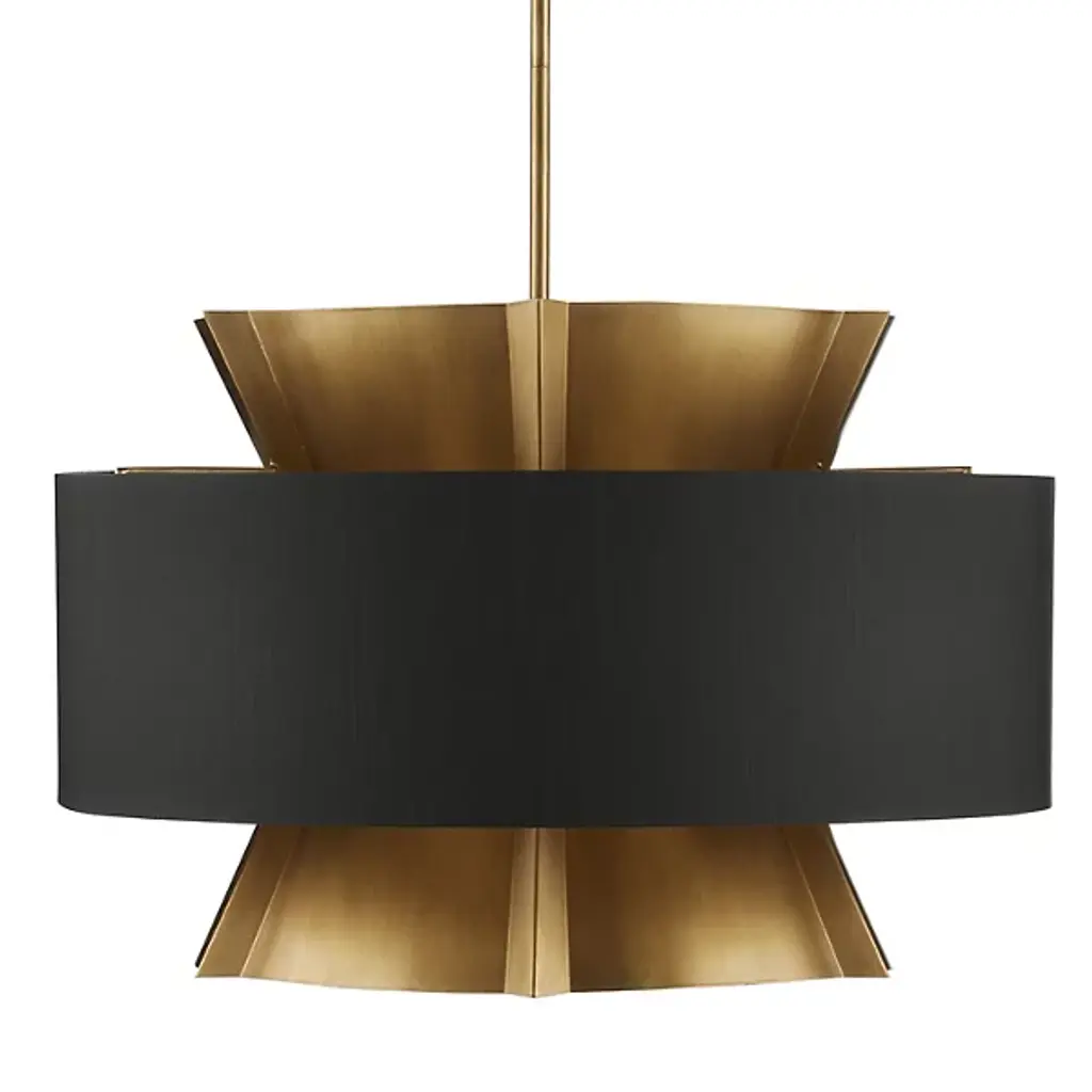 The Oxenwood Chandelier by Currey & Company boasts a compelling blend of swooping metal and contrasting fabric textures that establish it as a commanding statement piece in any room. Designed by Clarence Mallari, this fixture perfectly complements a range of retro decor styles. Its striking design features fluted metal shapes in a metallic finish, elegantly juxtaposed with a black shantung shade adorned with a contrasting lining. The interplay of warm and cool surfaces creates a captivating play of light