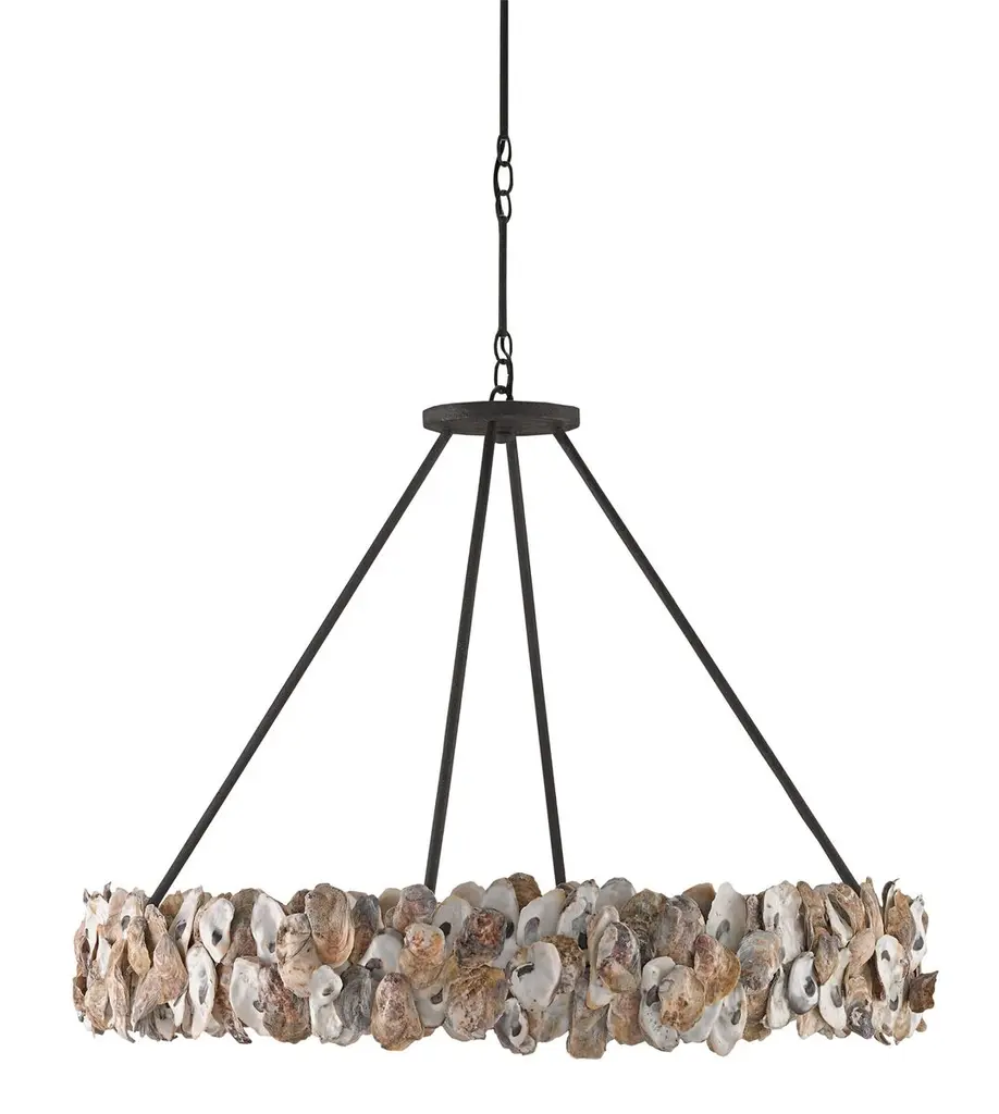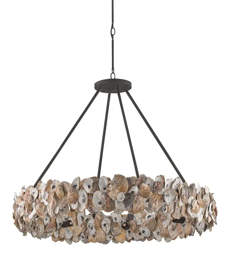 Scores of oyster shells give this light fixture an organic warmth that evokes the pleasures of coastal living. The textured bronze finish of the wrought-iron frame adds a rustic refinement. Hardwired.