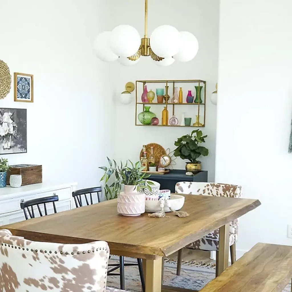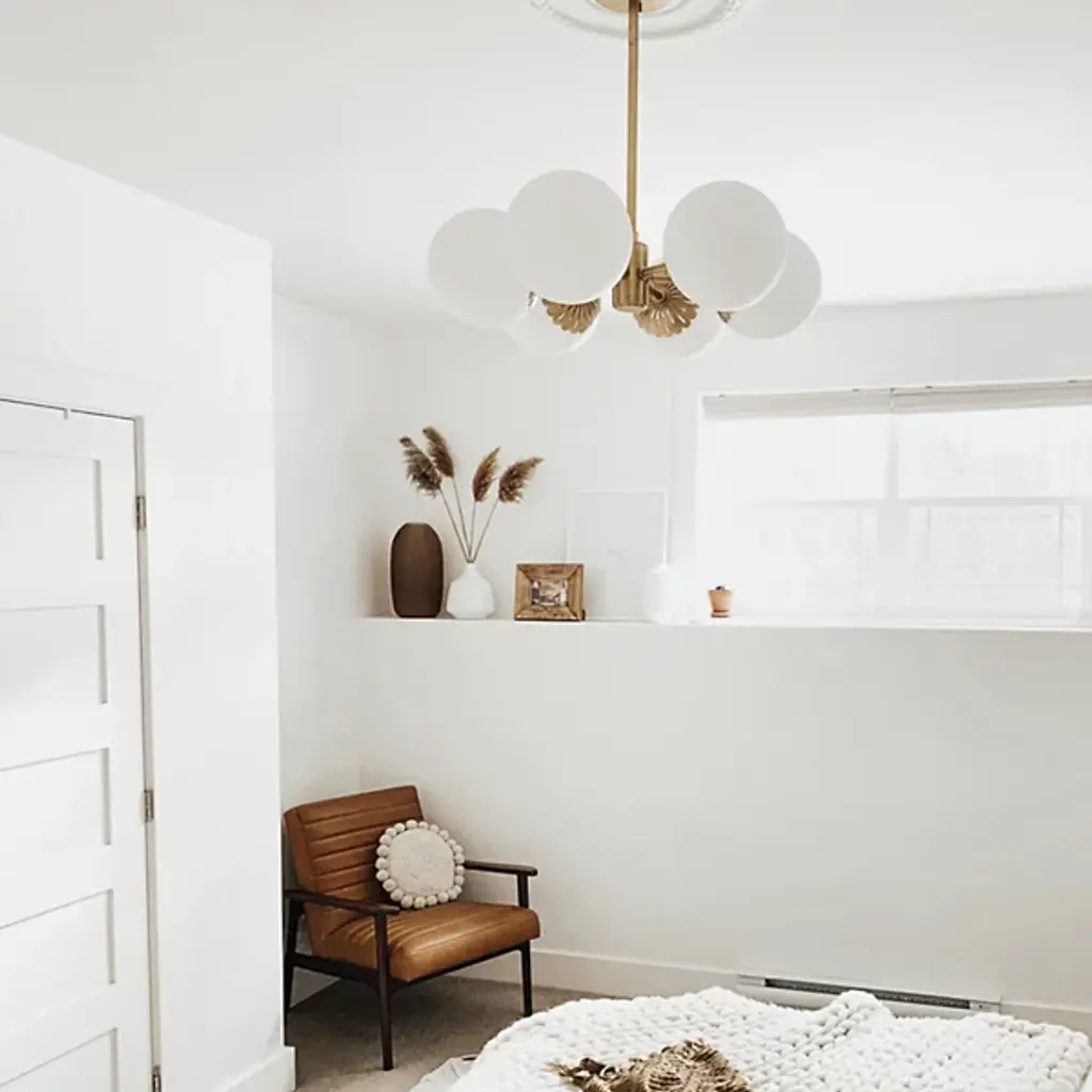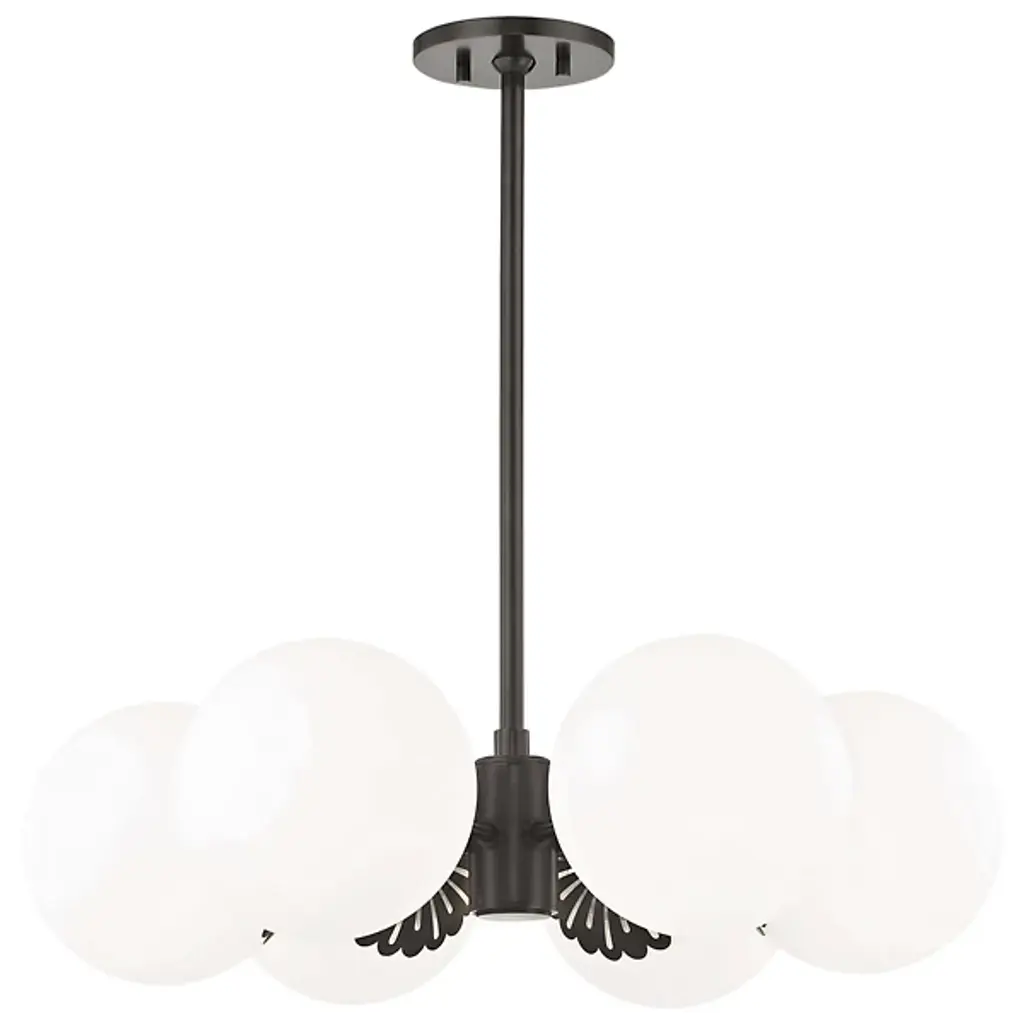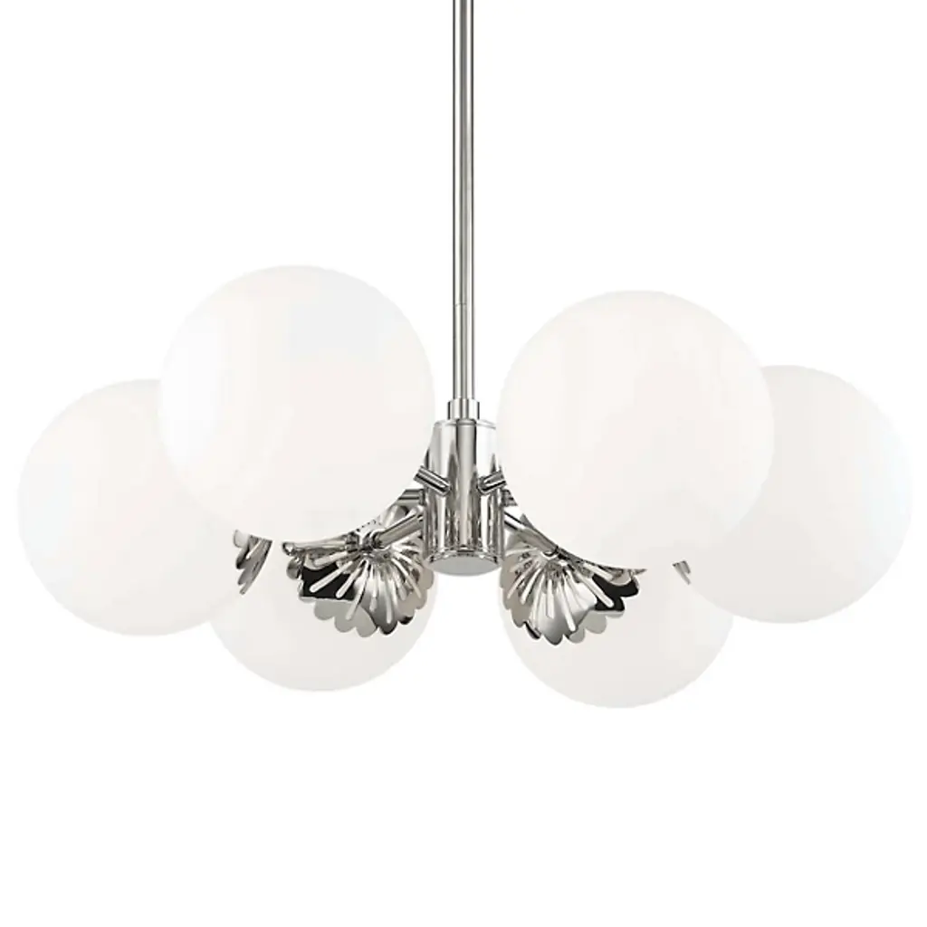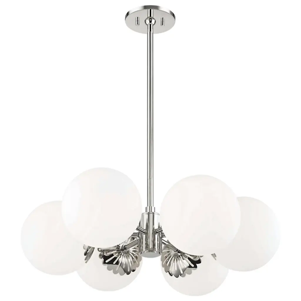 The Mitzi Paige 6-Light Chandelier gives you all the elegance of a traditional chandelier with none of the gaudiness. The bulbs sit in perfectly round Opal Glossy Glass shades, equally spaced about a Steel frame. The symmetry is accented by the beautiful detailing and finish of the structure, while the suspending stem gives the piece an added bit of depth.