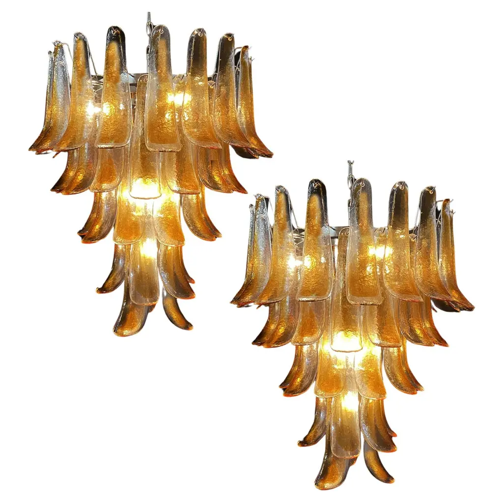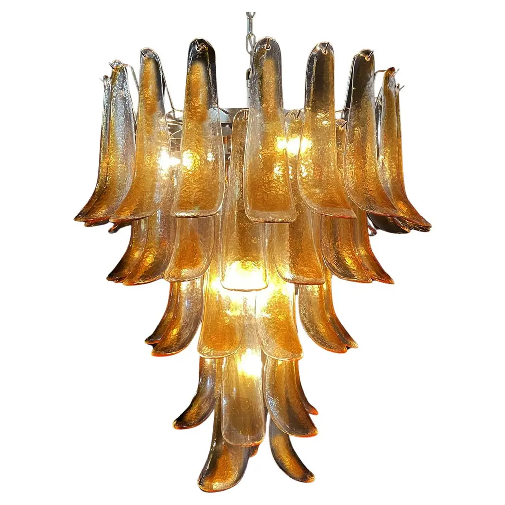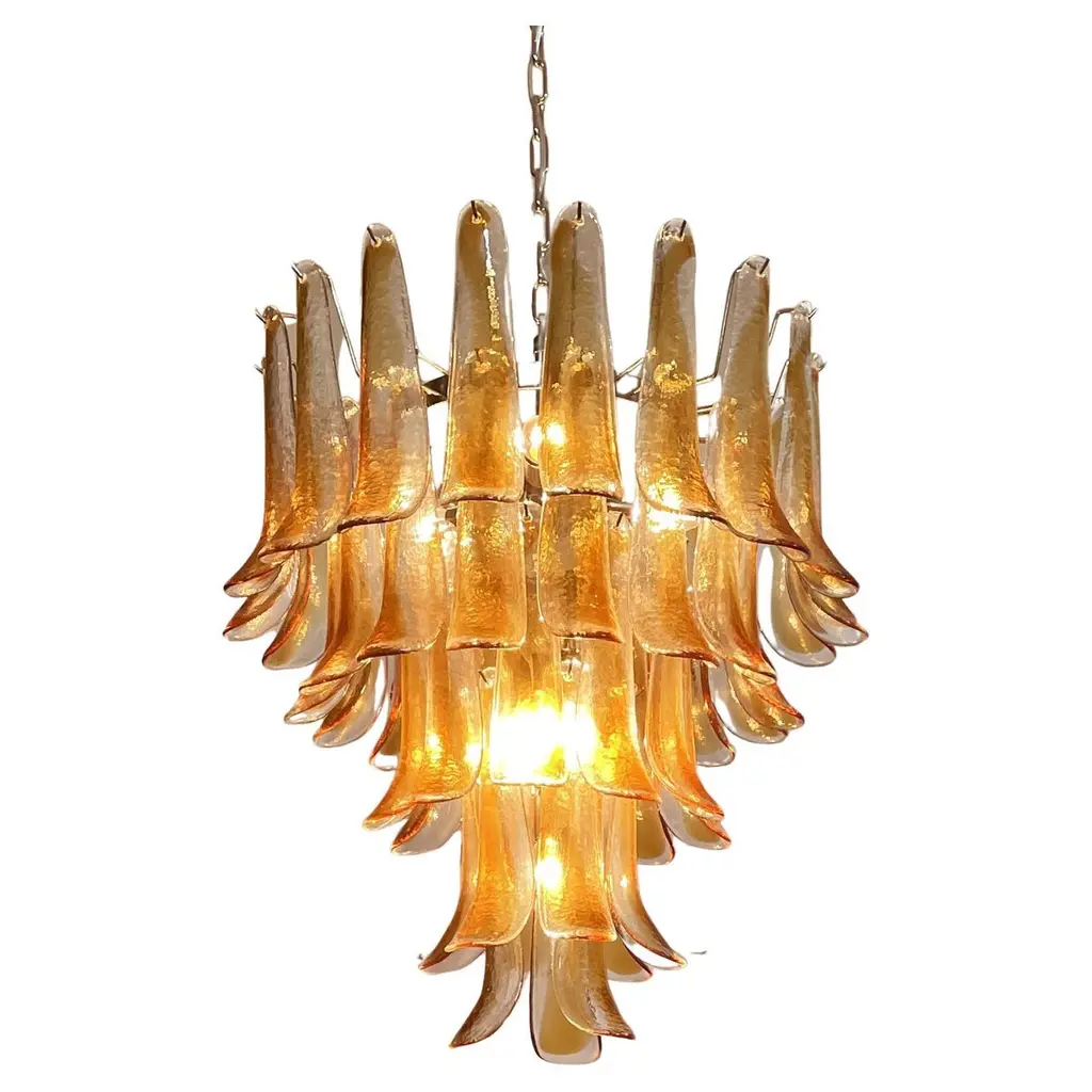 Italian vintage Murano chandelier made by 52 glass petals transparent with an amber spot inside, nickel metal structure. The glasses are very high quality, the photos do not do the beauty, luster of these glasses. in a chrome frame. Period:late XX centuryDimensions:55,10 inches (140 cm) height with chain; 29,50 inches (75 cm) height without chain; 26 inches (66 cm) diameter.Dimension glasses: 11,40 inches (29 cm) height; 3,15 inches (8 cm) maximum width.Light bulbs: 7 light bulbs : E14 dimension (not included in the sale)Condion:perfect vintage condition and fully working; the glasses are perfect and the chrome has wear consisting in age and use.