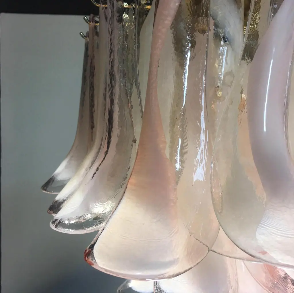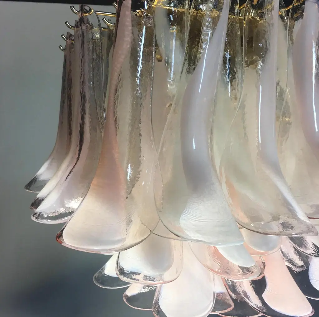 Pair Spectacular ceiling lamps with 76 Murano glasses. The glasses have two different colors, half are transparent with white spots, half are pink with white spots. Elegant lighting object.Period: late 20th centuryDimensions: 19.68 inches (50 cm) height, diameter 23.62 inches (60 cm).Dimension glasses: 11.40 inches (29 cm) height, 3.15 inches (8 cm) maximum width.Light bulbs: 9 light bulbs: E27 dimension (not included in the sale), on request we can replace the lamp holders with those suitable for the American electrical system.Condition: Perfect vintage condition. The glasses are perfect, brass that serves as a glazing bead has some sign of opacity due to the passing of the years.