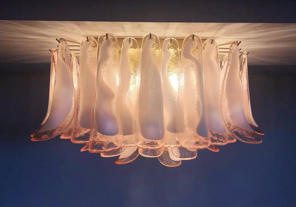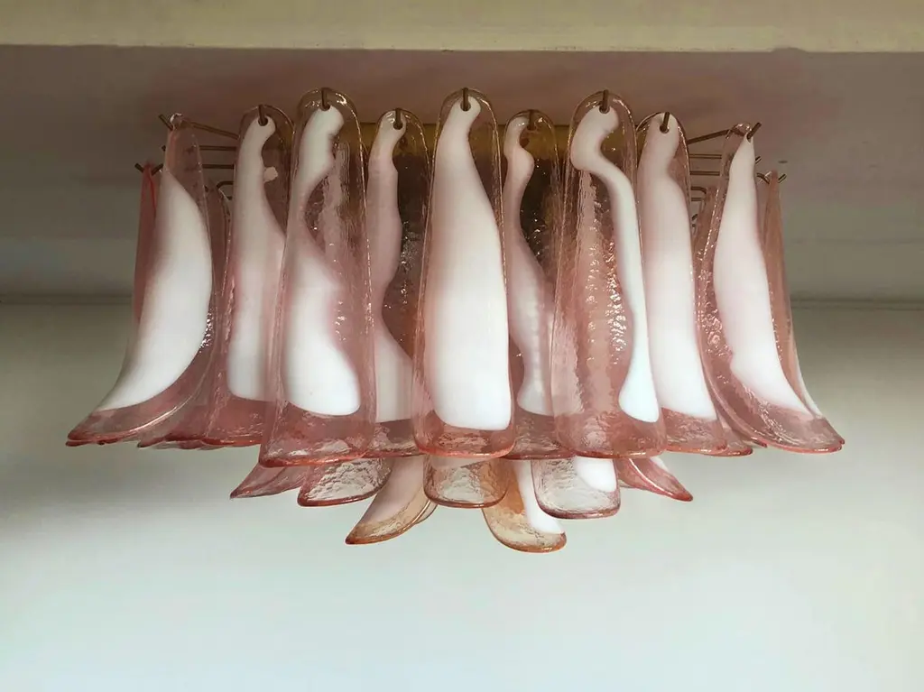 Spectacular pair of ceiling lamps with 64 pink and lattimo Murano glass. Elegant lighting object.Period: late 20th centuryDimensions: 15,75 inches (40 cm) height; 29,50 inches (80 cm) depth; 29,50 inches (80 cm) depth.Dimension glasses: 11,40 inches (29 cm) height; 3,15 inches (8 cm) maximum width.Light bulbs: 8 light bulbs: E27 dimension (not included in the sale) - - On request we can replace the lampholders with those suitable for the American electrical system.Condition: Perfect vintage condition. The glasses are perfect; brass that serves as a glazing bead has some sign of opacity due to the passing of the years.Condition: Perfect vintage condition. The glasses are perfect, brass that serves as a glazing bead has some sign of opacity due to the passing of the years.