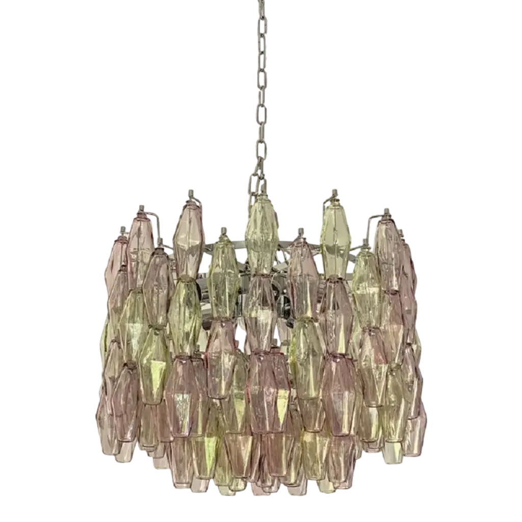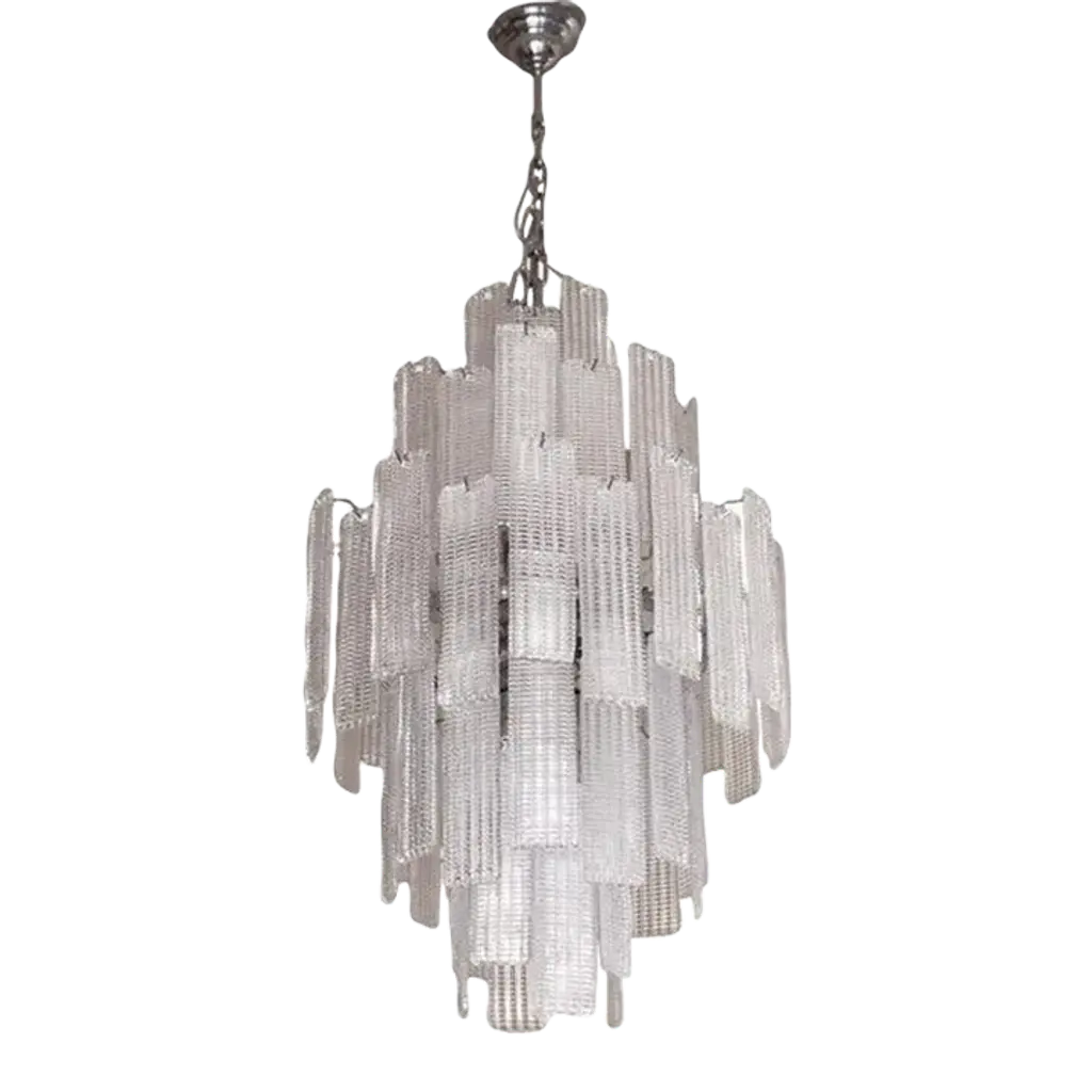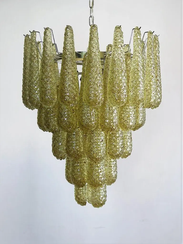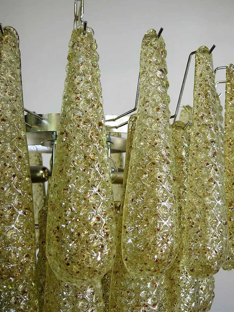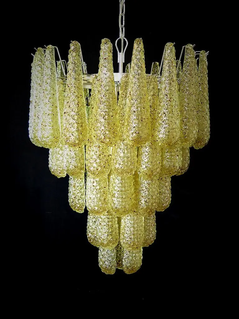 Pair of Italian vintage Murano chandelier made by 52 glass petals (amber crystal, smooth outside, with crystal powder and then rough inside.) in a chrome frame.Period: 1970s-1980sDimensions: 55.10 inches (140 cm) height with chain, 29.50 inches (75 cm) height without chain, 26 inches (66 cm) diameter.Dimension glasses: 12.60 inches (32 cm) height, 3.15 inches (8 cm) width.Light bulbs: 7 light bulbs: E14 dimension (not included in the sale), on request we can replace the lampholders with those suitable for the American electrical system.Condition: perfect vintage condition and fully working; the glasses are perfect. The metal structure has slight signs of aging, overall in good condition.