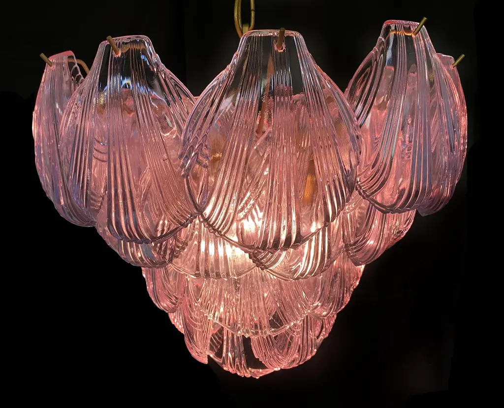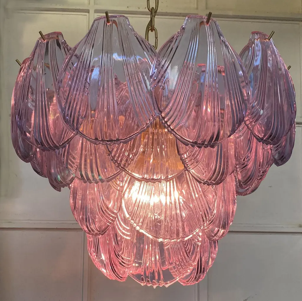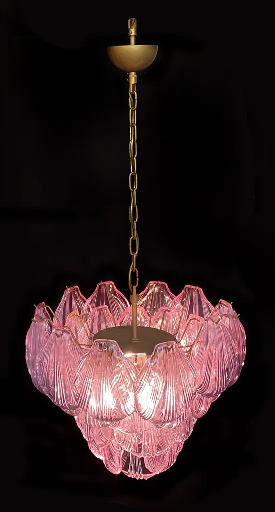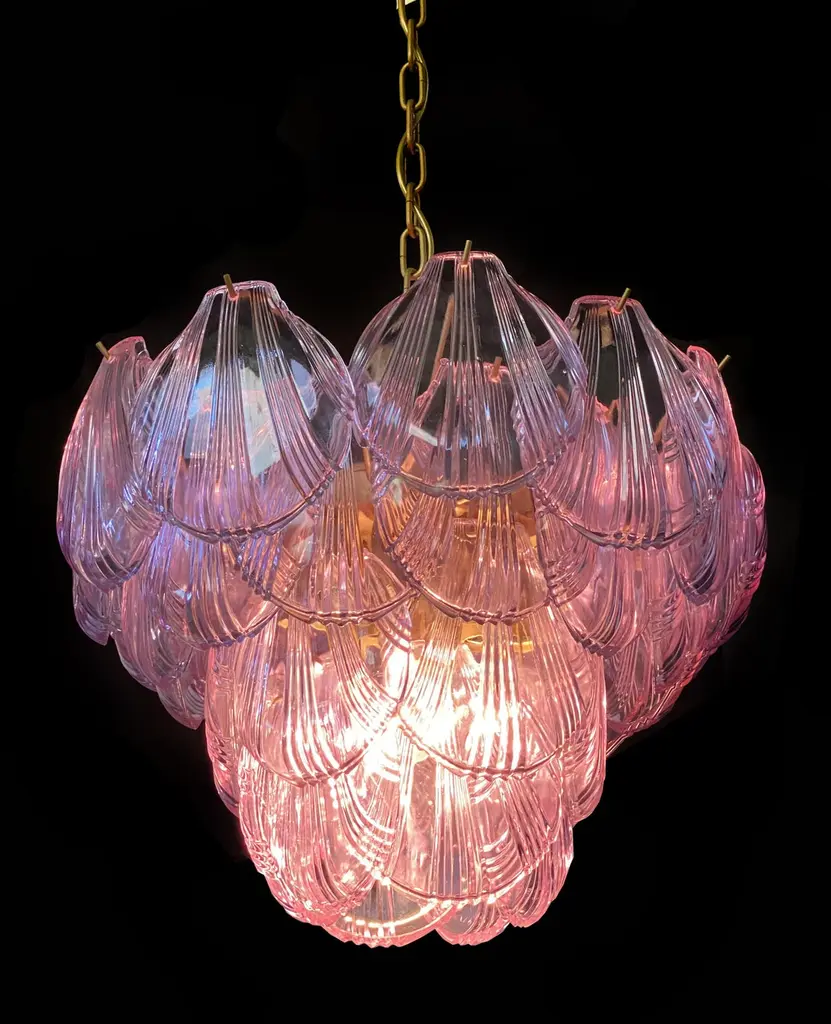 Fantastic pair chandeliers with pink a glasses, gold painted metal frame. It has 36 shell glass. The glasses are very high quality, the photos do not do the beauty, luster of these glasses.Period: Late 20th centuryLight bulbs: 7 light bulbs E 27 dimension (not included in the sale)Condition: Perfect vintage condition and fully working; the glasses are perfect and the chrome has wear consisting in age and use.