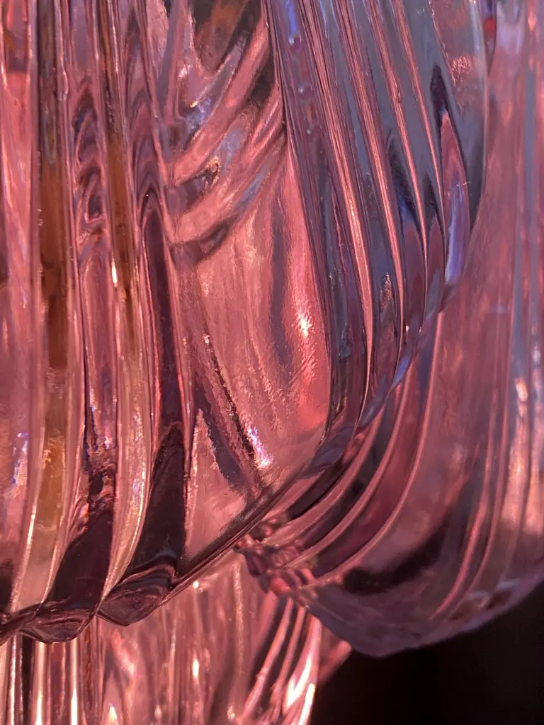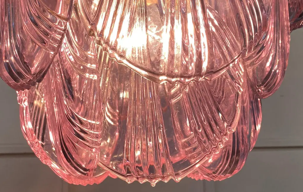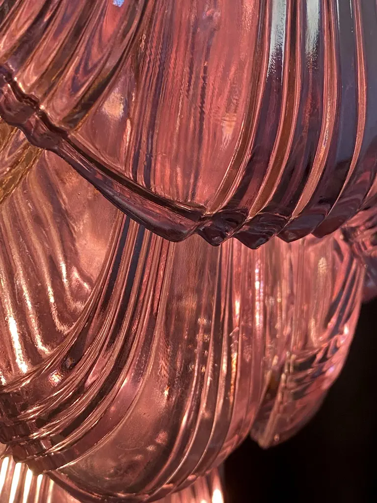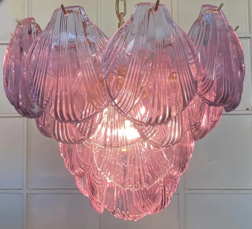 Fantastic pair chandeliers with pink a glasses, gold painted metal frame. It has 36 shell glass. The glasses are very high quality, the photos do not do the beauty, luster of these glasses.Period: Late 20th centuryLight bulbs: 7 light bulbs E 27 dimension (not included in the sale)Condition: Perfect vintage condition and fully working; the glasses are perfect and the chrome has wear consisting in age and use.
