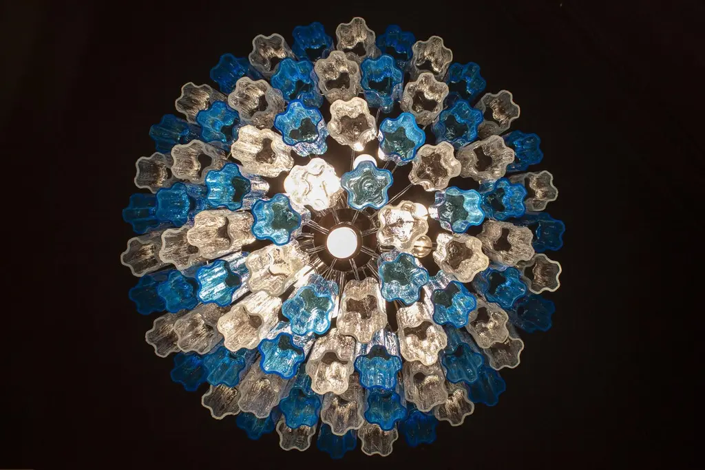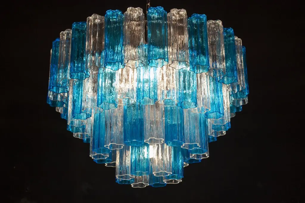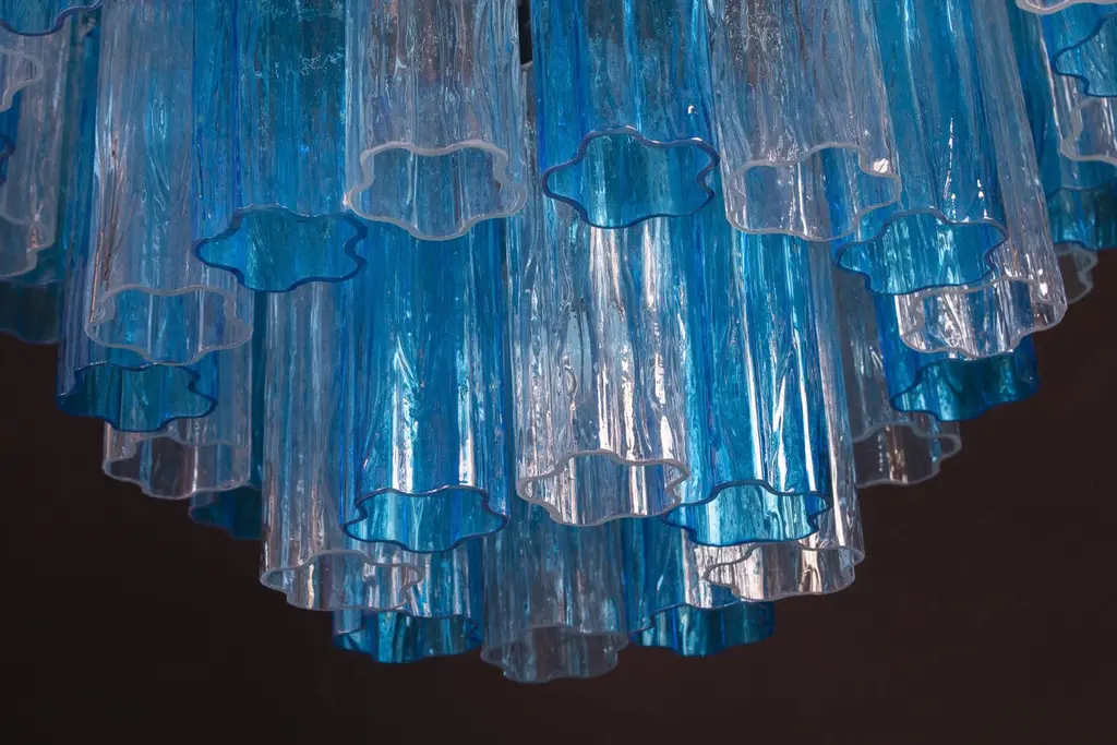 This striking chandelier is composed by 78 blue turquoise and ice color Murano glass 'Tronchi'by 20 cm high.