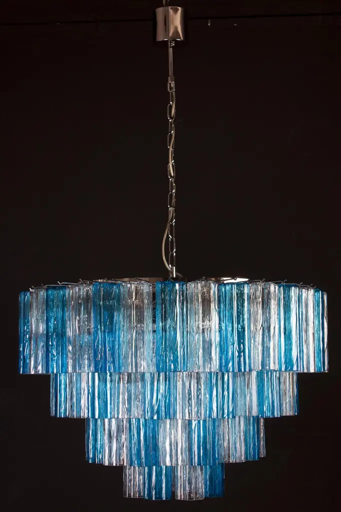 This striking chandelier is composed by 78 blue turquoise and ice color Murano glass 'Tronchi'by 20 cm high.