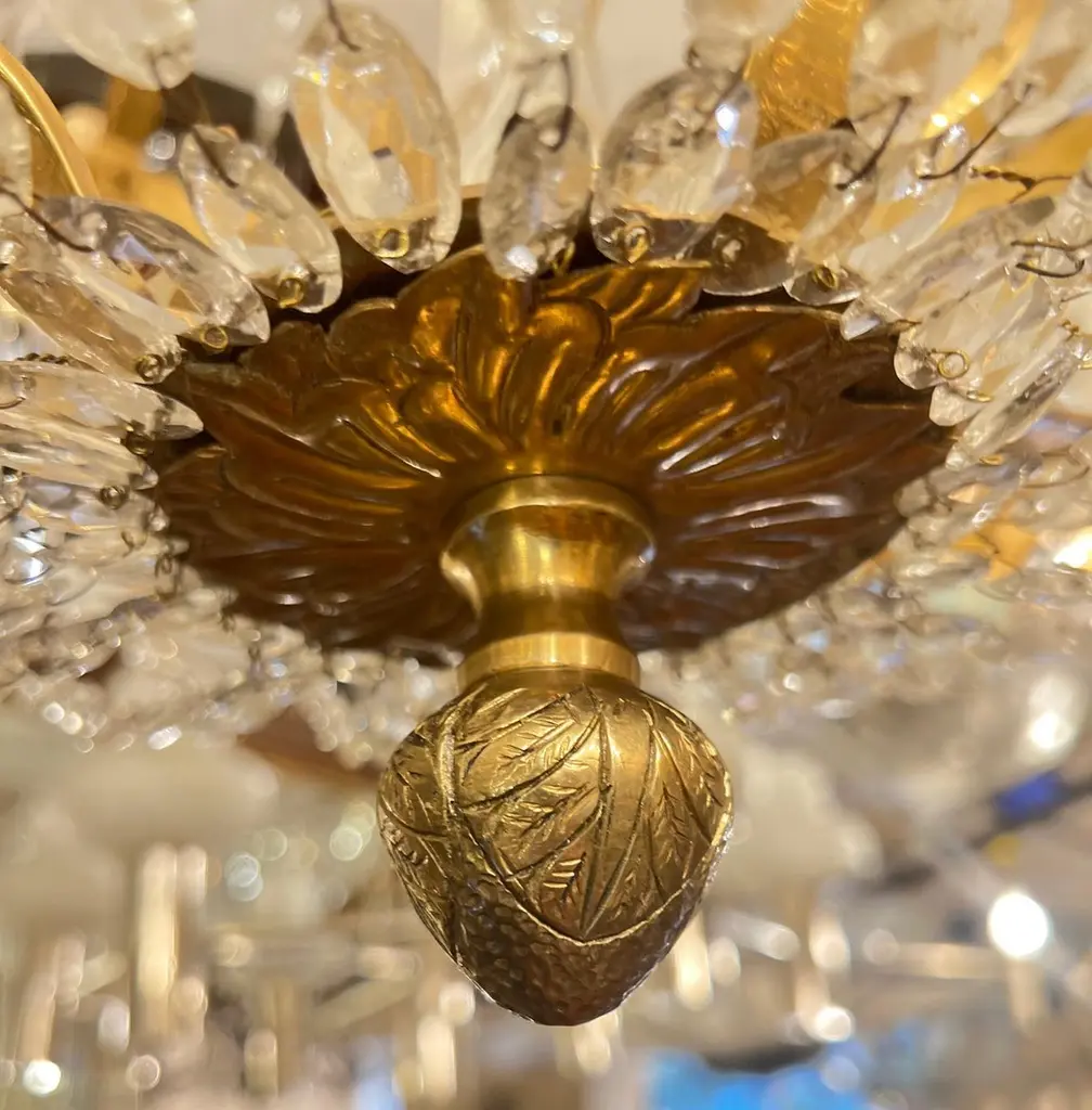 A pair of circa 1920's eight-arm neoclassic style gilt bronze Swedish chandeliers with crystal pendants and original patina. Sold individually.Measurements:Diameter: 30"Drop: 40" (adjustable)