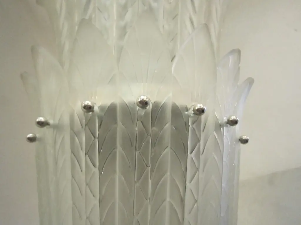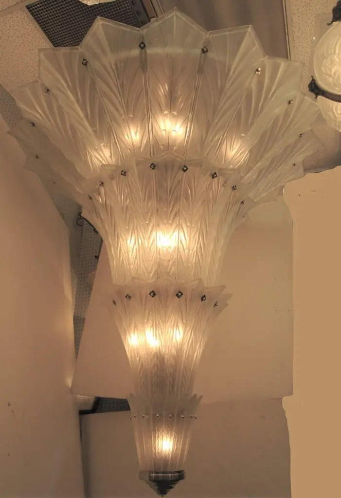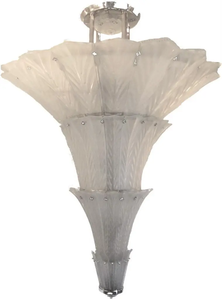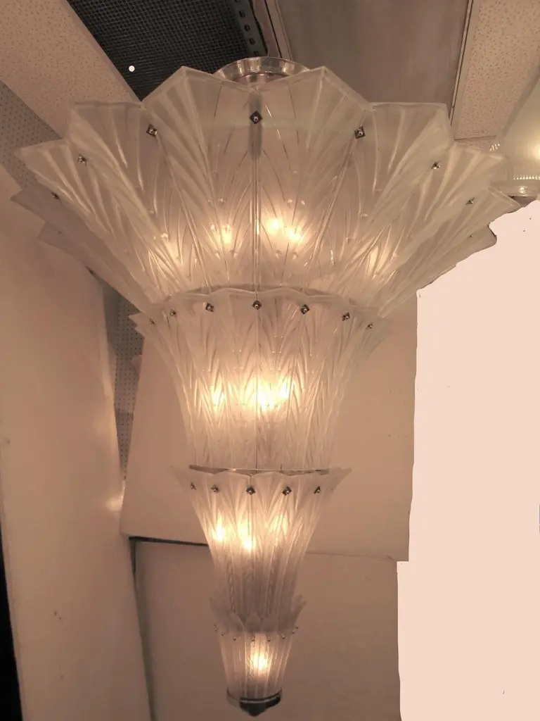 A magnificent and huge multi-tiered frosted art glass chandelier by Sabino.Four glass tiers reminiscent of a waterfall or palm tree cascade down the very large frame tapering gently and culminating in a nickelled finial. Hung by four fluted nickelled bronze rods and a glass coupe signed Sabino. Each panel is signed.Over 30 socketsThe variation in the color of the glass in the photos is due to the camera flash only.More than one chandelier is available, but the restoration and assembly would take some time.This chandelier can be used in a staircase, a hotel lobby, an entry foyer, dining room or any where a dramatic statement is wanted. Modernist lantern shape.Liquidating our warehouse, semi-retiring therefore the discounted sale price.