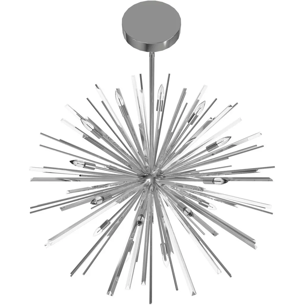 Inspired by the iconic Sputnik design, the Palisades Ave. Collection showcases a dynamic arrangement of varying-sized spokes radiating from a central spear base. This striking fixture is beautifully accented with a mix of glass, metal rods, and glowing bulbs, creating a captivating play of light and form that adds bold sophistication to any space.