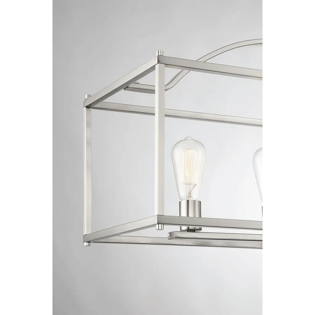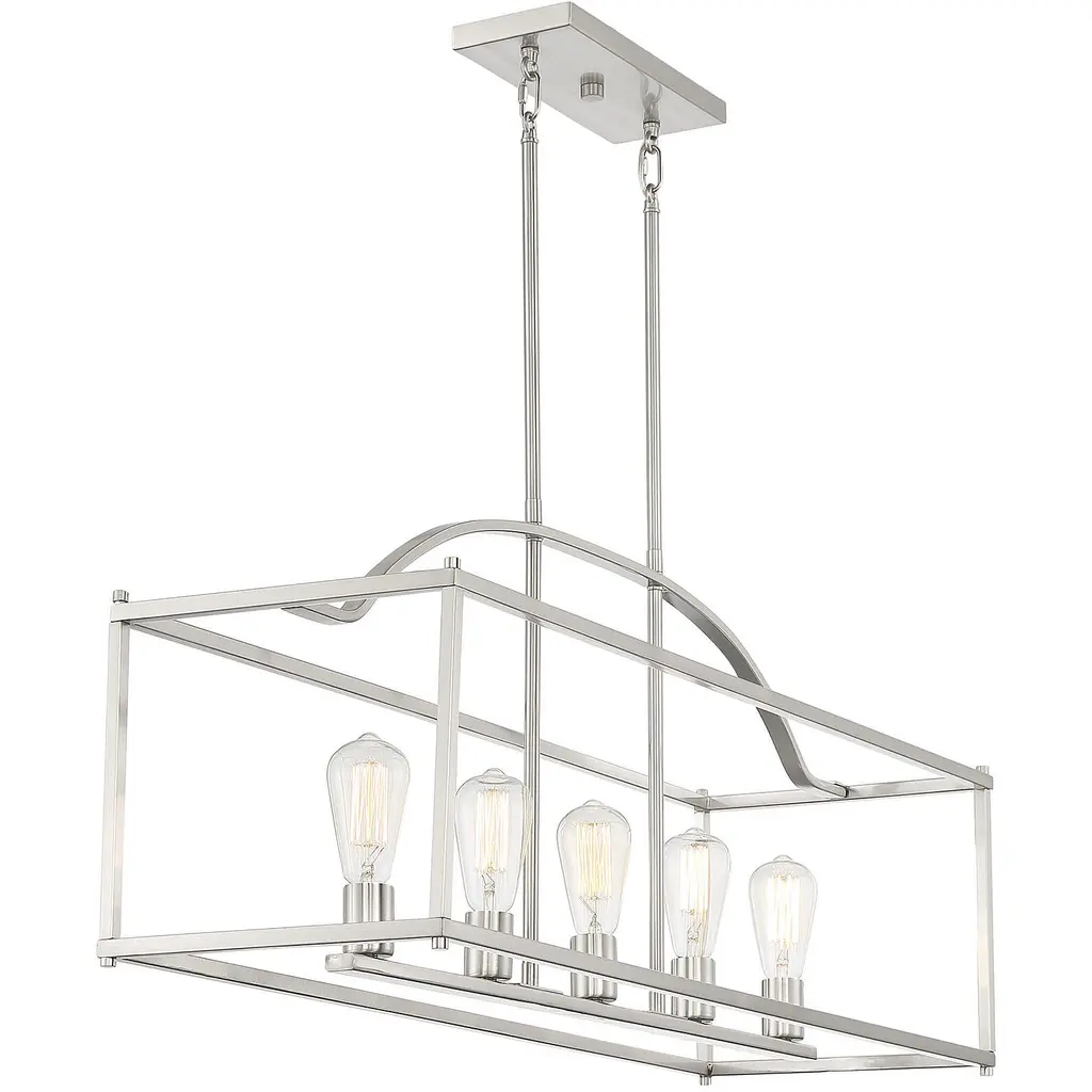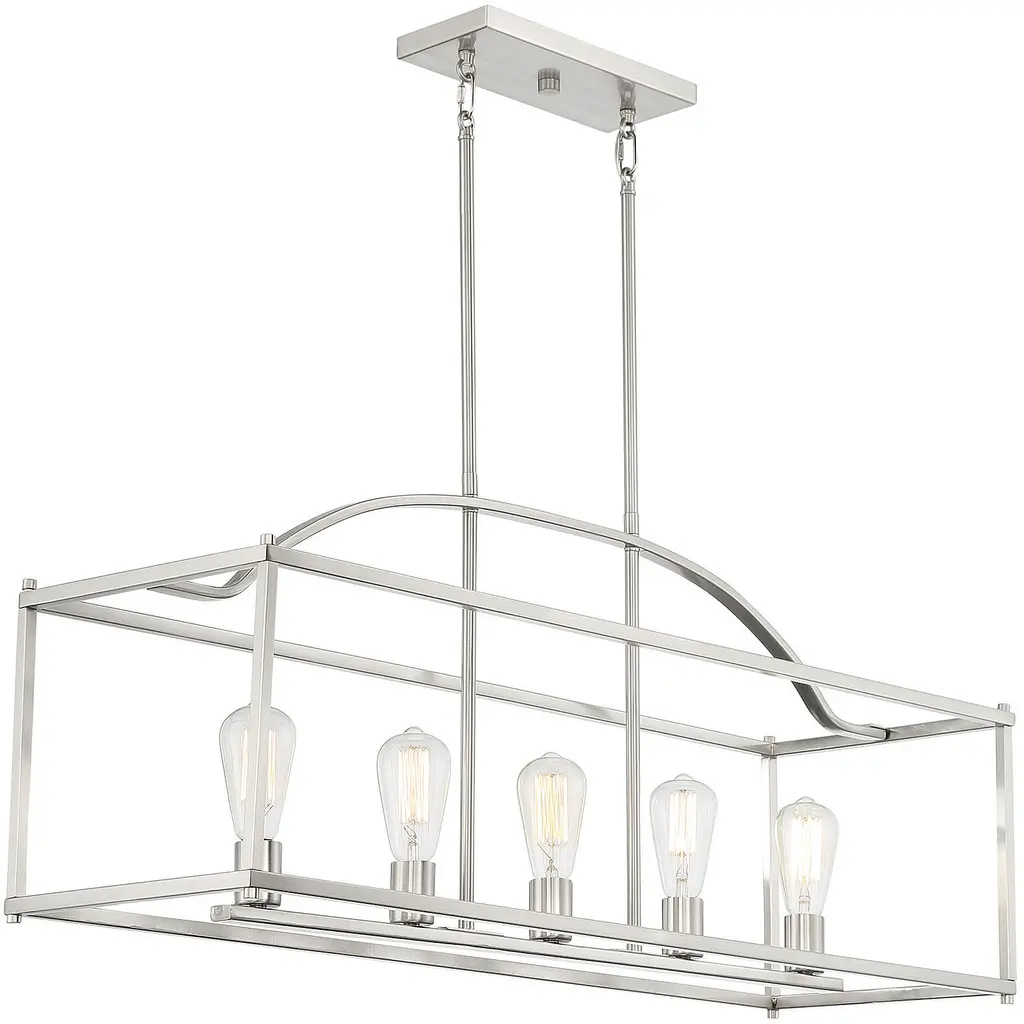Generous in scale, the Palladian collection offers a streamlined aesthetic and an open cage that comfortably covers a wide area without looking heavy. With an adjustable height from 22" to 68" and measuring 38" long x 12" wide, this linear chandelier in a satin nickel finish provides ample illumination over a dining table or island from five 60-watt standard size bulbs.