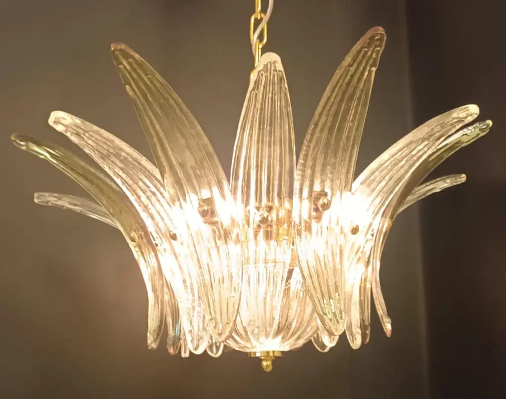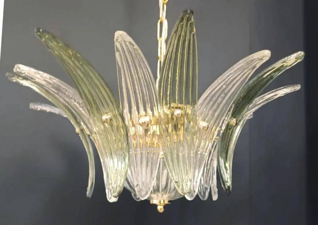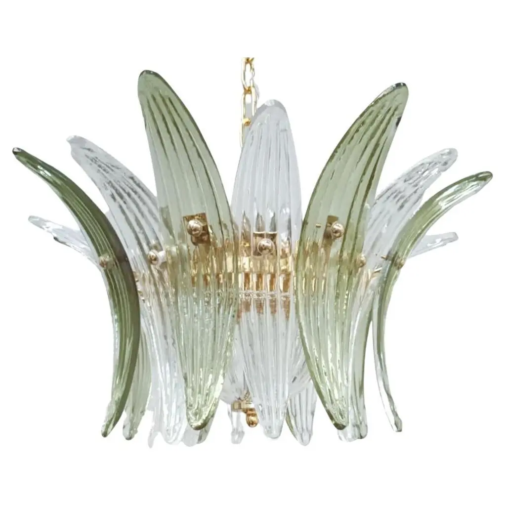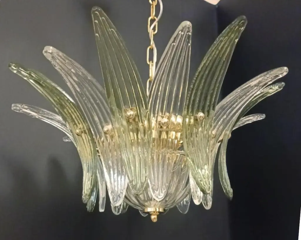 Italian Palmette chandelier shown in clear and green Murano glass leaves, mounted on 24k gold plated metal finish frame / Made in Italy4 lights / E12 or E14 type / max 40W eachMeasures: Diameter: 20.5 inches / Height: 10.5 inchesOrder Only / This item ships from Italy.