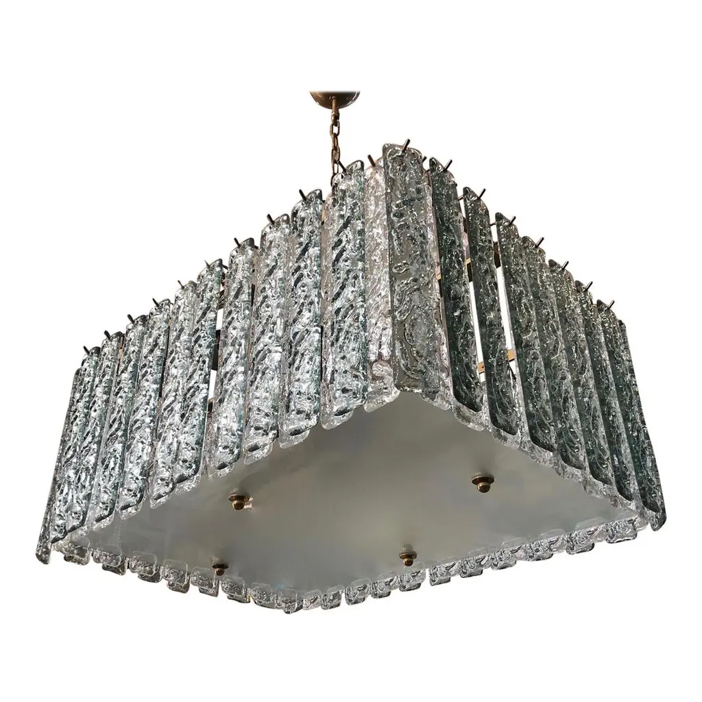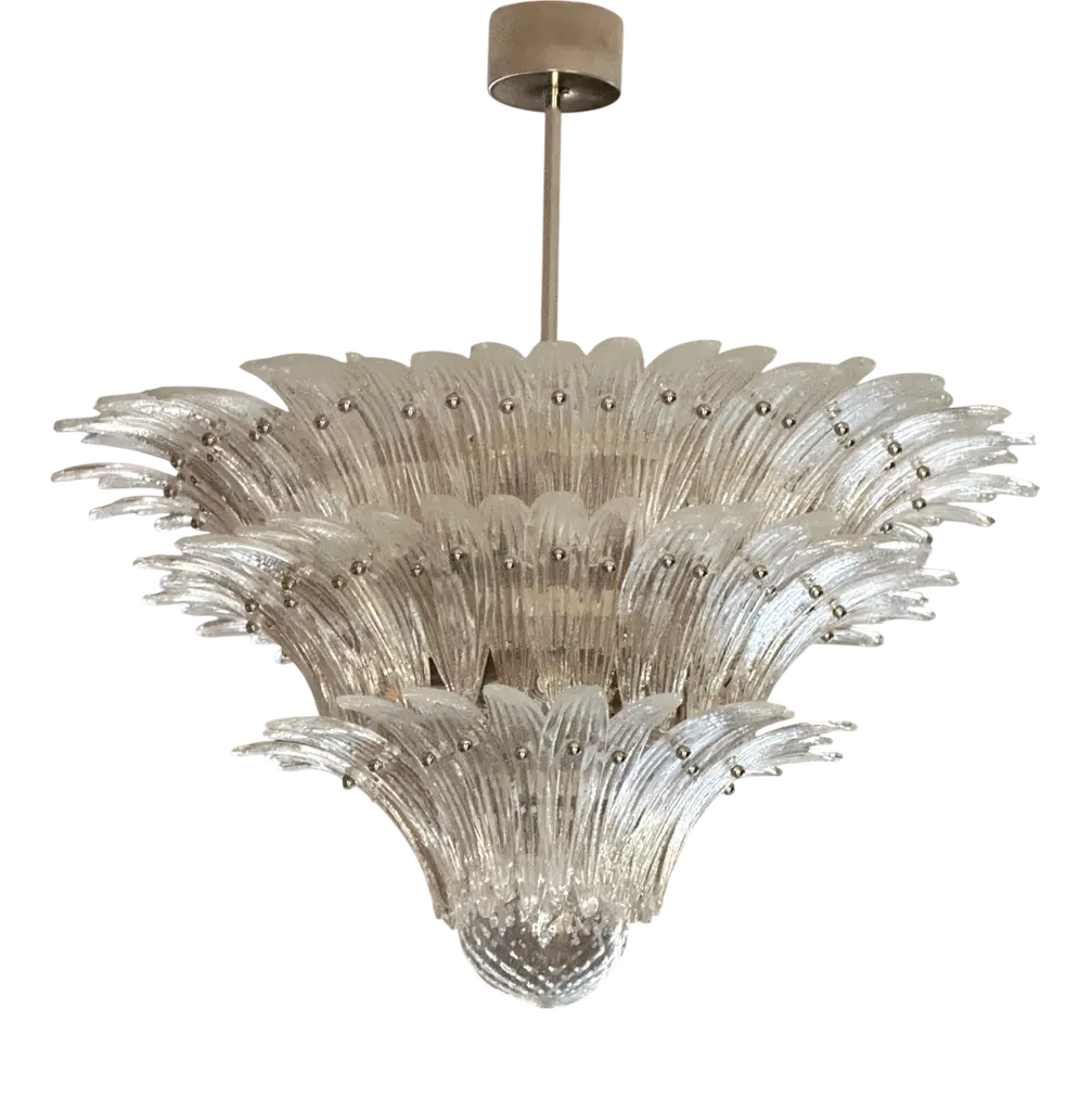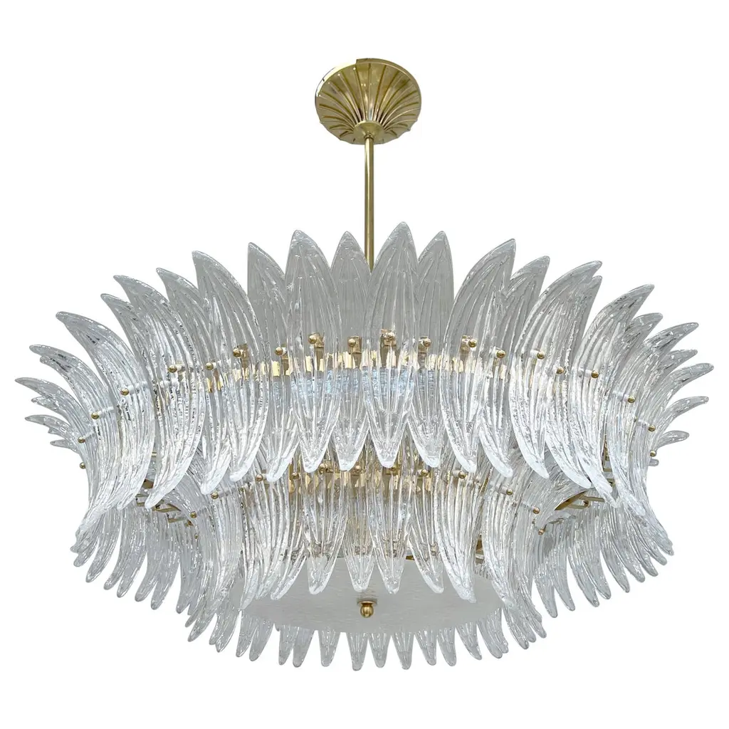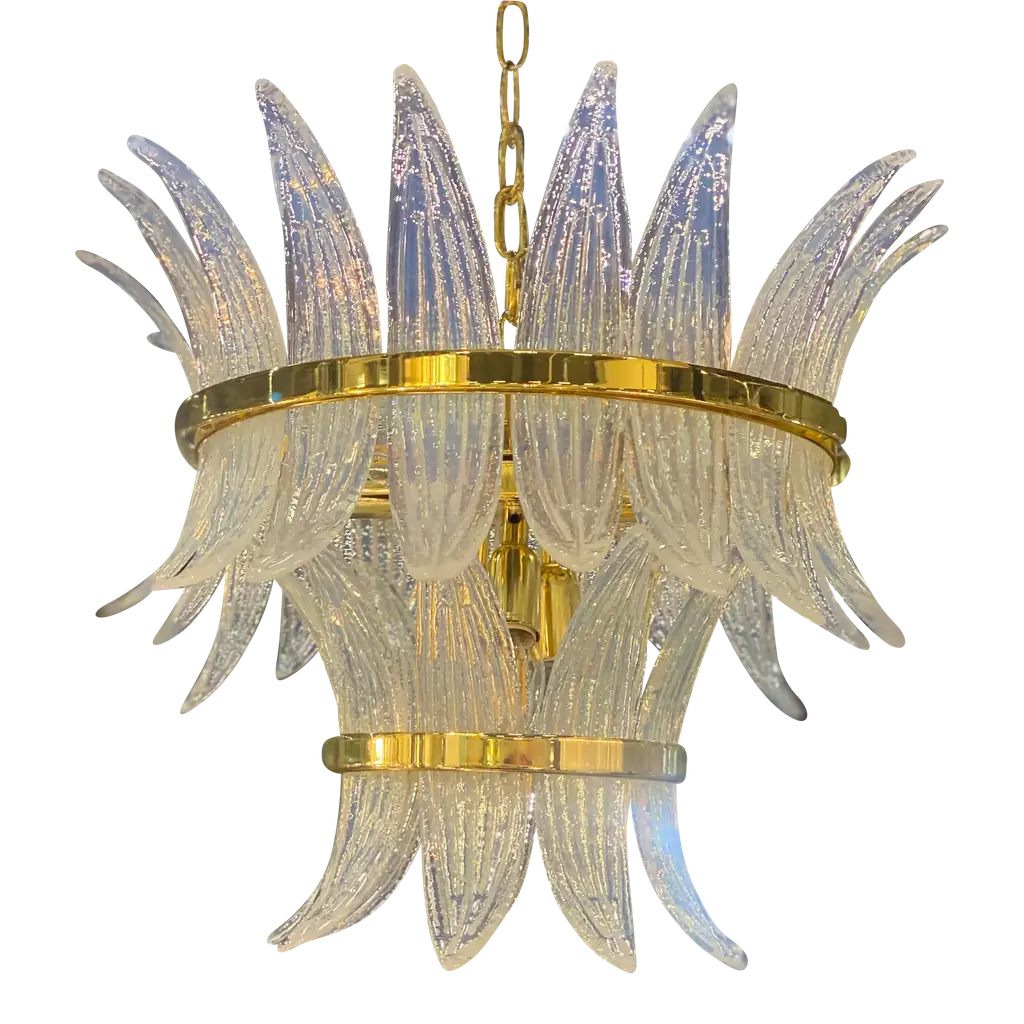 Italian Palmette chandelier shown in clear and green Murano glass leaves, mounted on 24k gold plated metal finish frame / Made in Italy4 lights / E12 or E14 type / max 40W eachMeasures: Diameter: 20.5 inches / Height: 10.5 inchesOrder Only / This item ships from Italy.