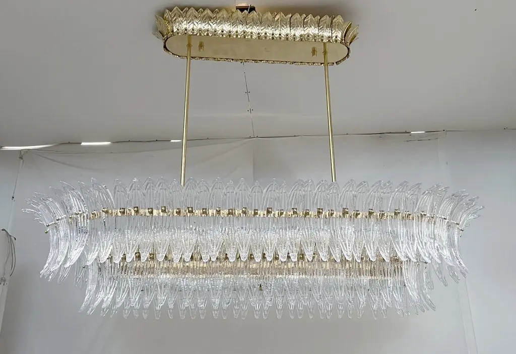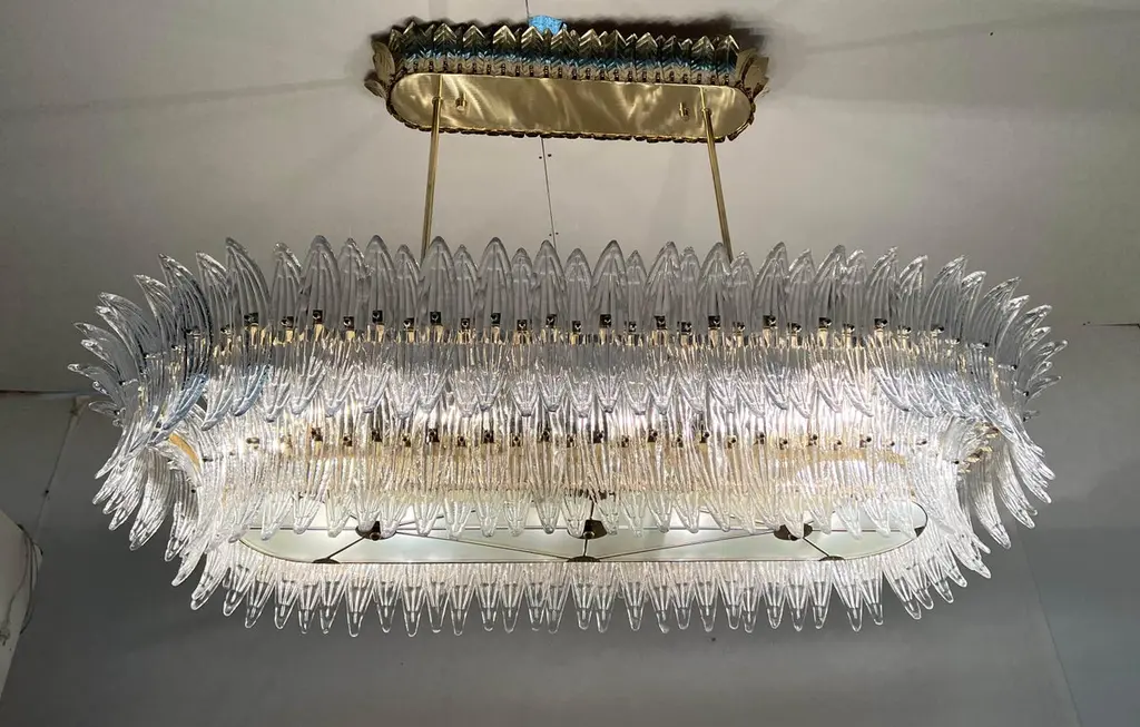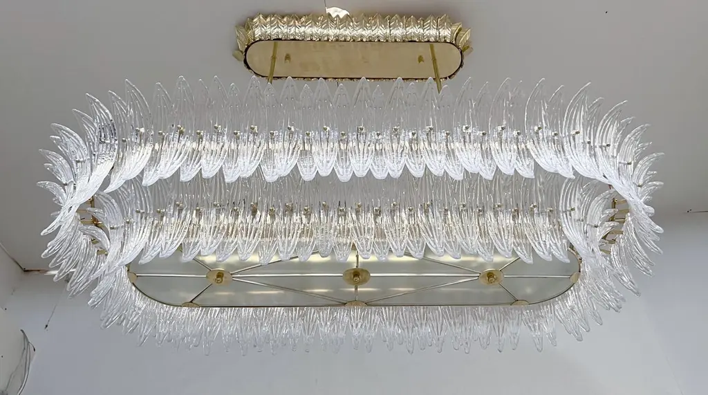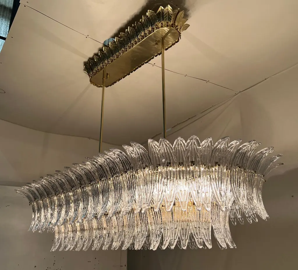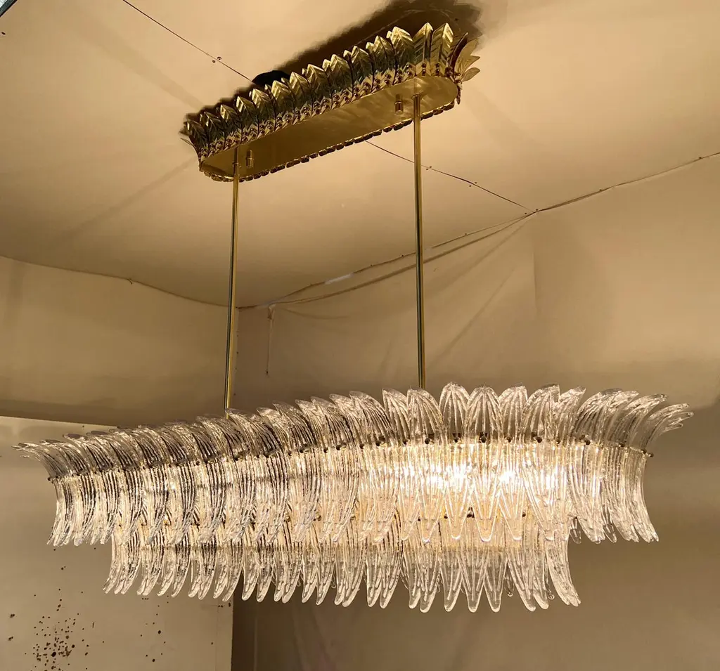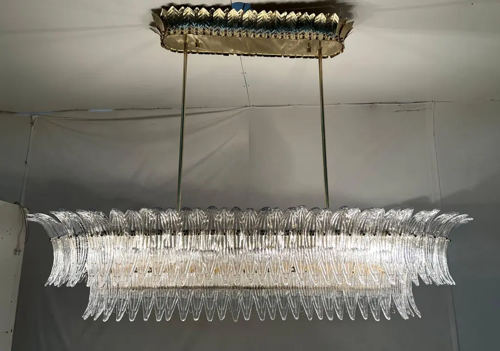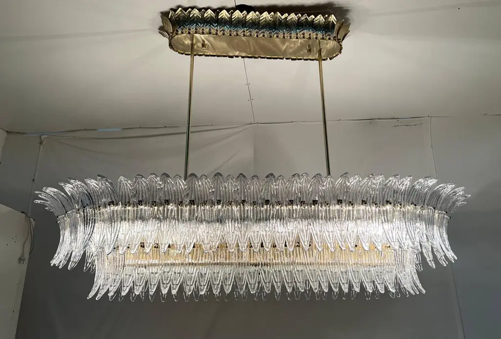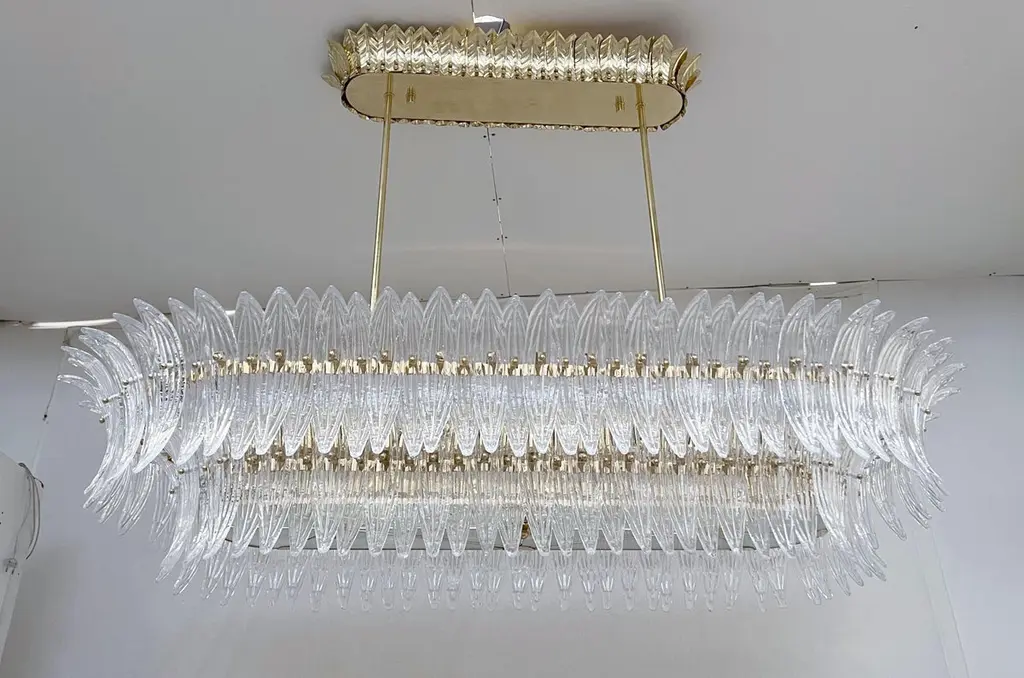 Italian Palmette chandelier shown in clear Murano glass leaves mounted on unlacquered natural brass finish frame with frosted bottom glass diffusers / Made in ItalyLength 66 inches, width 31.5 inches, height 13 inches, total height 48 inches including rods and canopies18 lights / E26 or E27 type / max 60W eachOrder Only / This item ships from ItalyOrder reference #: FABIOLTD C986.