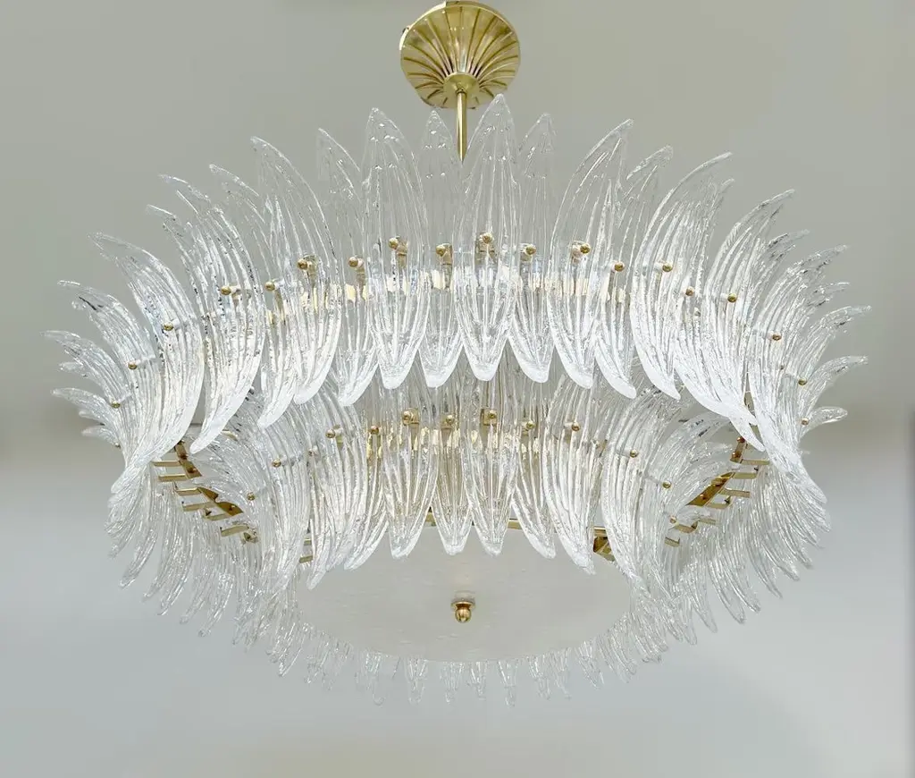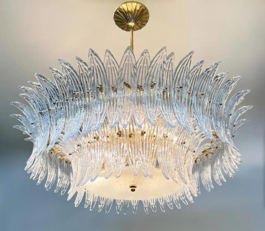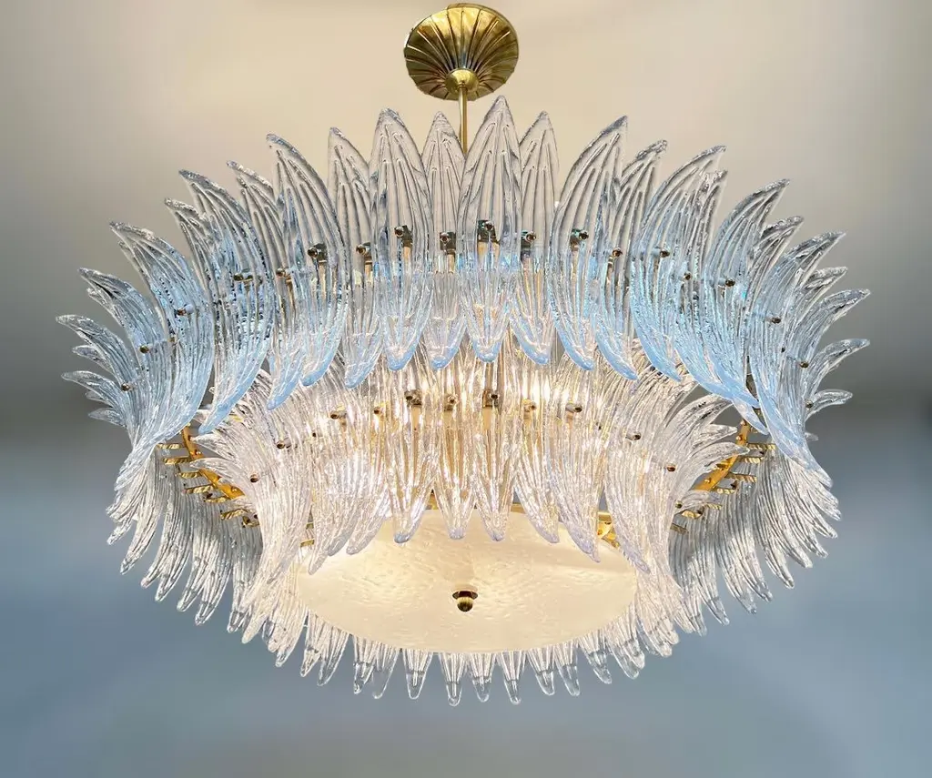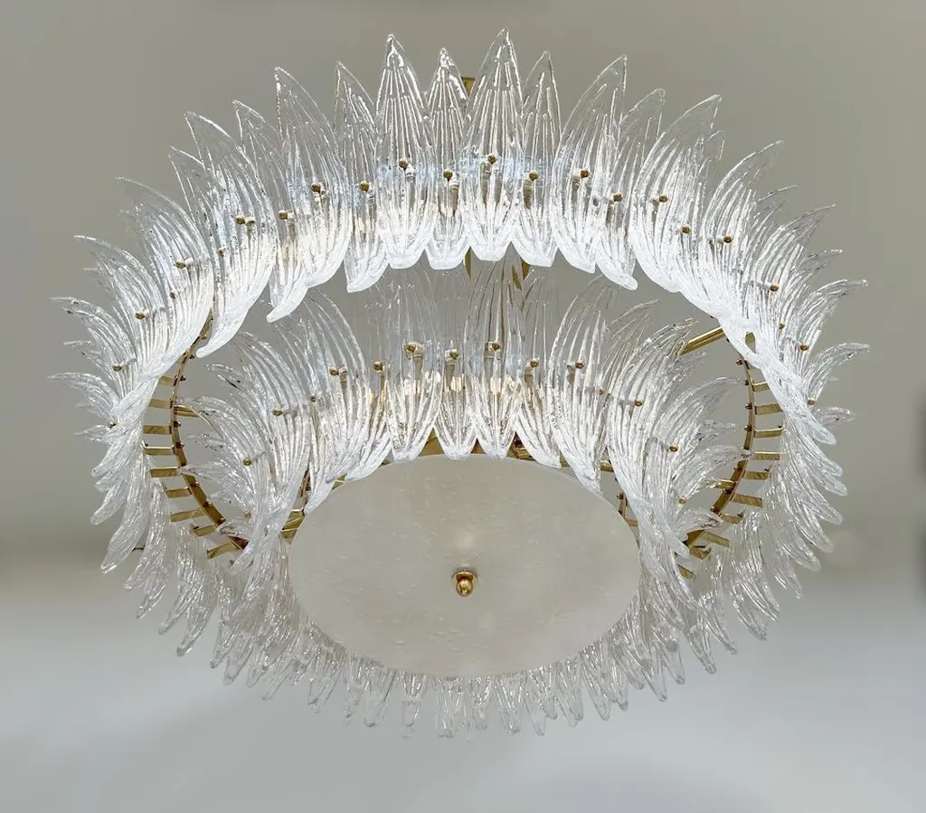 Italian Palmette chandelier shown in clear Murano glass leaves mounted on unlacquered natural brass finish frame with a sand blasted textured Murano glass diffuser / Made in ItalyDiameter 39.5 inches, height 13 inches, total height 38 inches including rod and canopy8 lights / E26 or E27 type / max 60W eachOrder Only / This item ships from ItalyOrder reference #: FABIOLTD C995