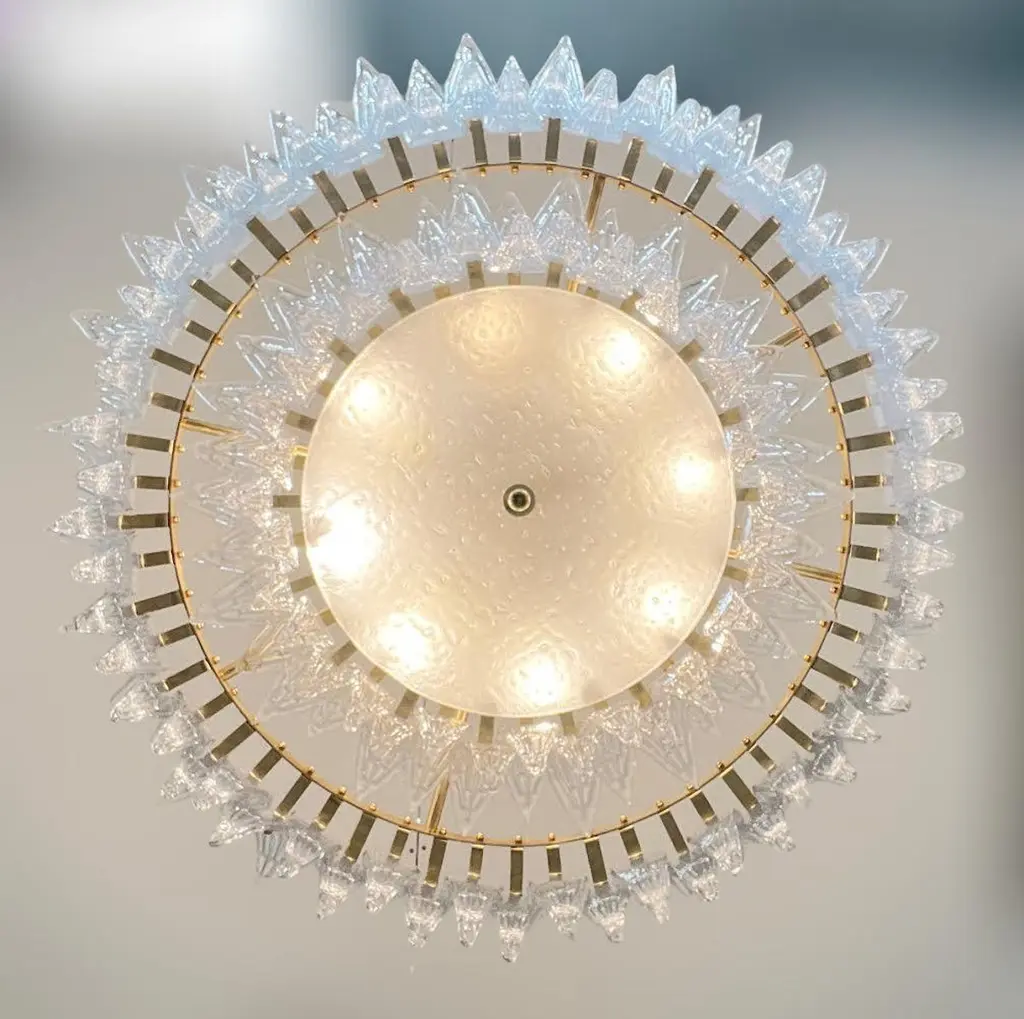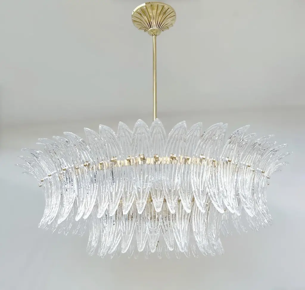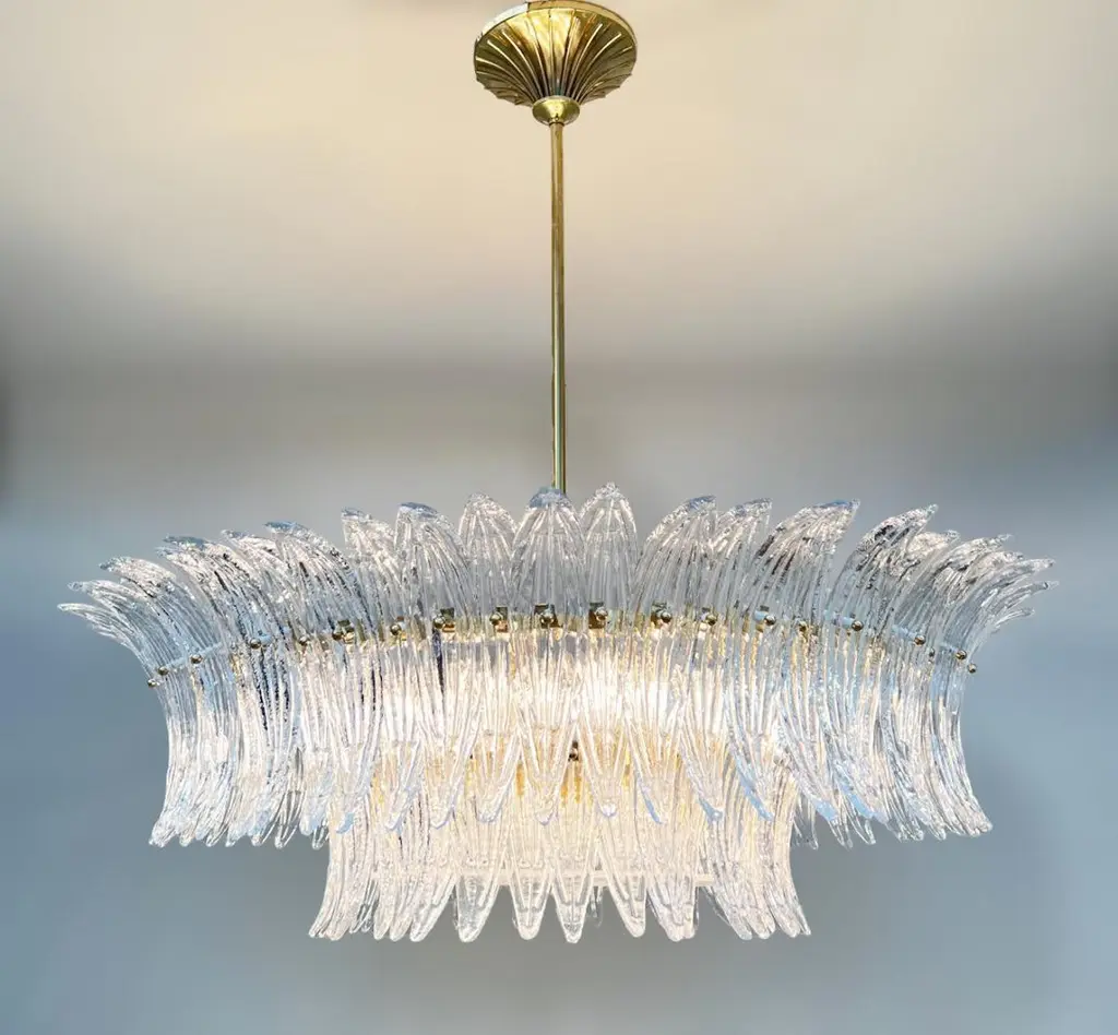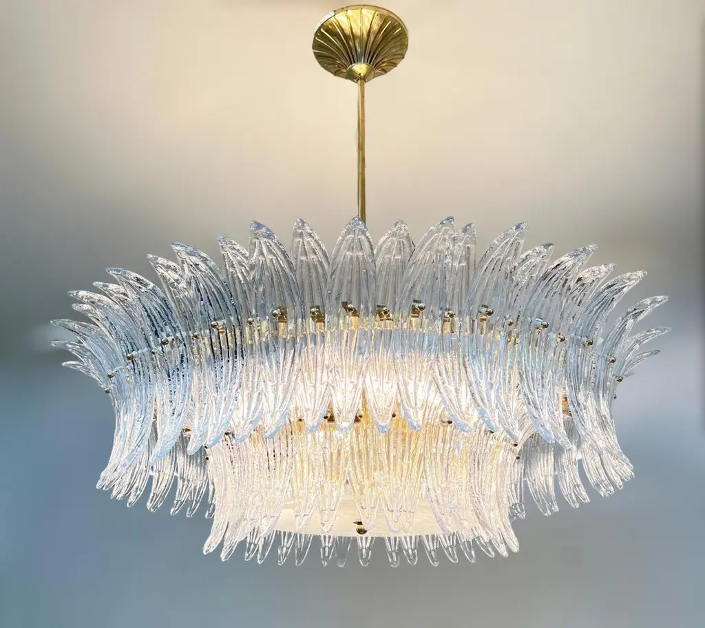Italian Palmette chandelier shown in clear Murano glass leaves mounted on unlacquered natural brass finish frame with a sand blasted textured Murano glass diffuser / Made in ItalyDiameter 39.5 inches, height 13 inches, total height 38 inches including rod and canopy8 lights / E26 or E27 type / max 60W eachOrder Only / This item ships from ItalyOrder reference #: FABIOLTD C995