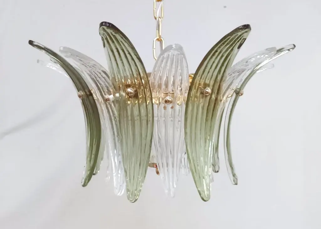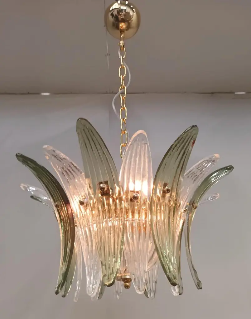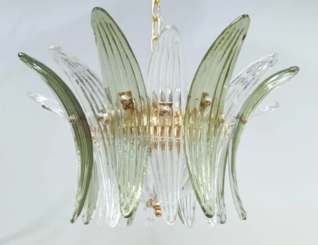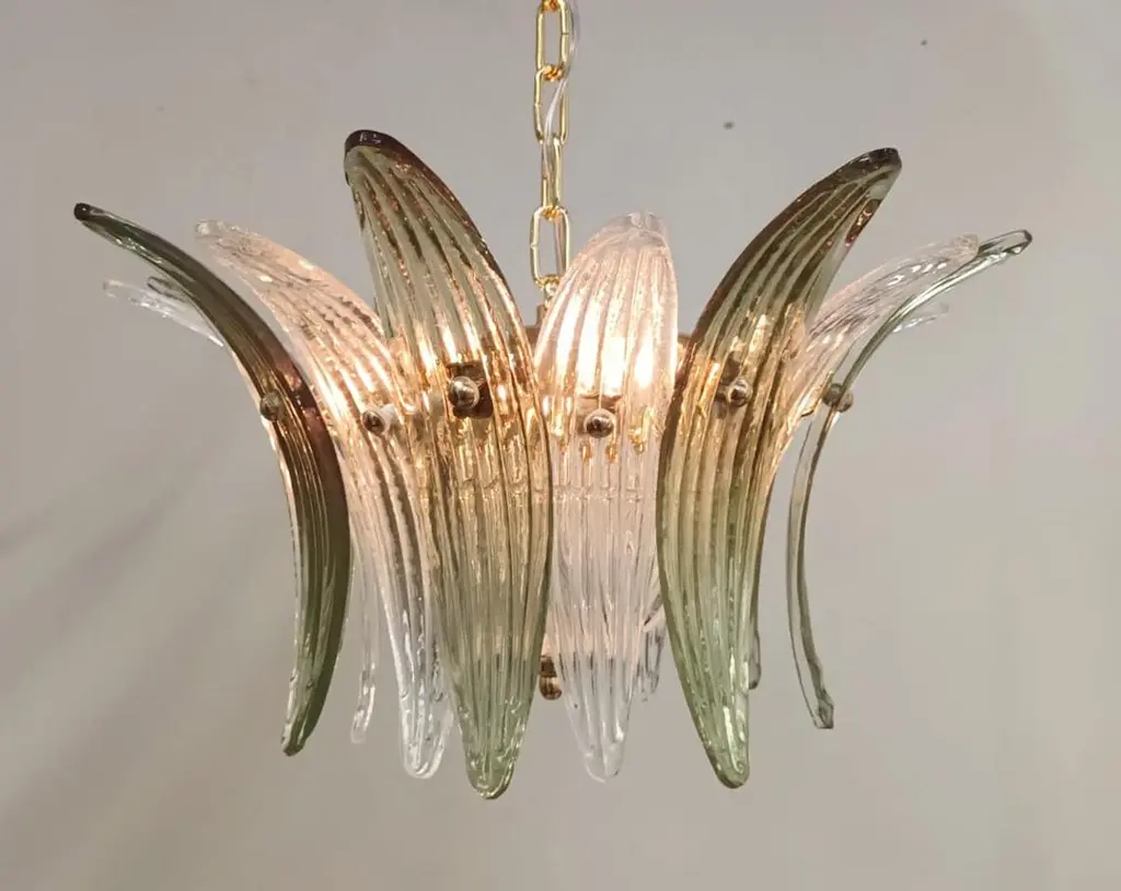 Italian Palmette chandelier shown in clear and green Murano glass leaves, mounted on 24k gold plated metal finish frame / Made in Italy.4 lights / E12 or E14 type / max 40W eachDiameter: 18.5 inches / Height: 11 inchesOrder Only / This item ships from Italy.