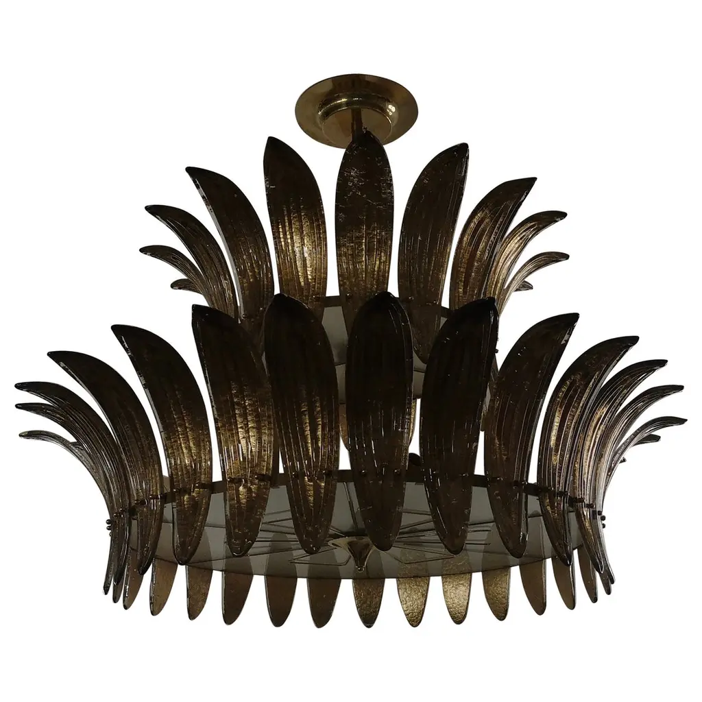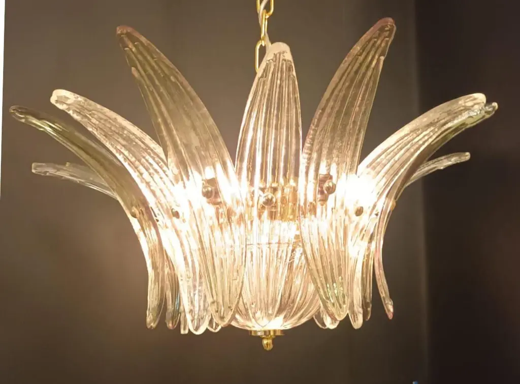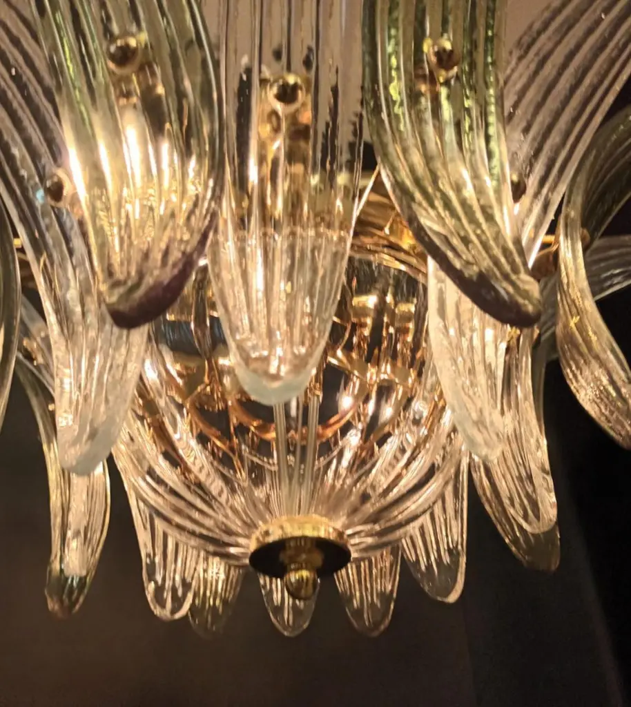 Italian Palmette chandelier shown in clear and green Murano glass leaves, mounted on 24k gold plated metal finish frame / Made in Italy4 lights / E12 or E14 type / max 40W eachMeasures: Diameter: 20.5 inches / Height: 10.5 inchesOrder Only / This item ships from Italy.