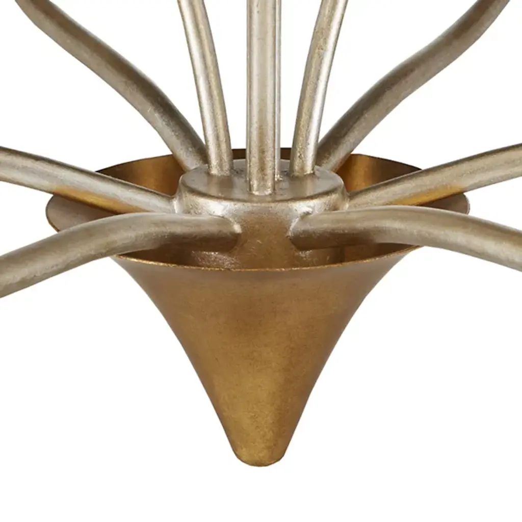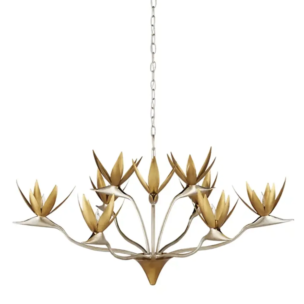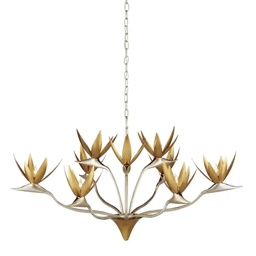 The Paradiso Chandelier by Currey & Company presents an expressive design inspired by the elegant Strelitzia reginae, also called the Bird of Paradise plant. Crafted from strong iron, this chandelier features graceful limbs extending outward from a central cone suspended from a chain and stem arrangement, finished in contemporary silver leaf. The cone and blossoms enveloping the light bulbs are adorned with a metallic finish, creating a captivating contrast. Blending retro styles and design, this chandelier brings the beauty of nature indoors, contributing to the growing infusing your space with an air of vibrant grace