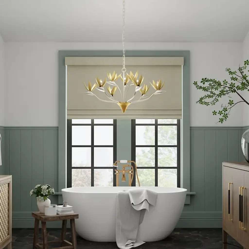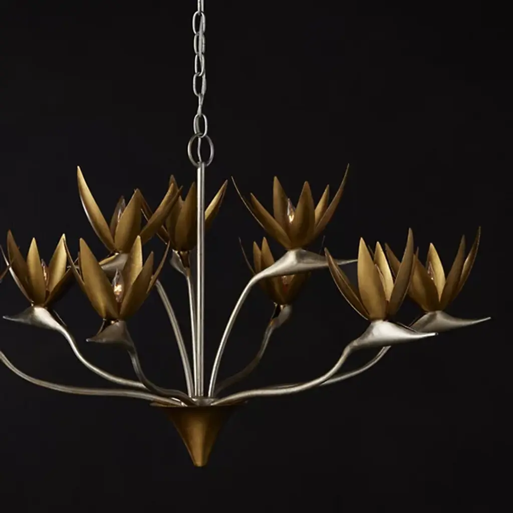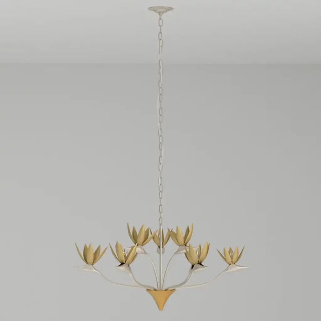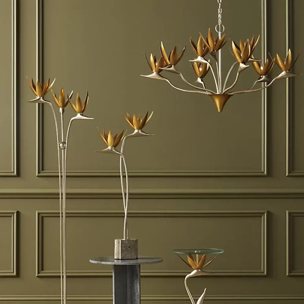 The Paradiso Chandelier by Currey & Company presents an expressive design inspired by the elegant Strelitzia reginae, also called the Bird of Paradise plant. Crafted from strong iron, this chandelier features graceful limbs extending outward from a central cone suspended from a chain and stem arrangement, finished in contemporary silver leaf. The cone and blossoms enveloping the light bulbs are adorned with a metallic finish, creating a captivating contrast. Blending retro styles and design, this chandelier brings the beauty of nature indoors, contributing to the growing infusing your space with an air of vibrant grace