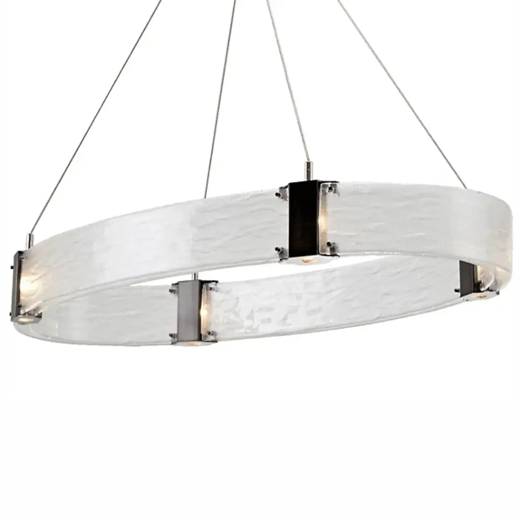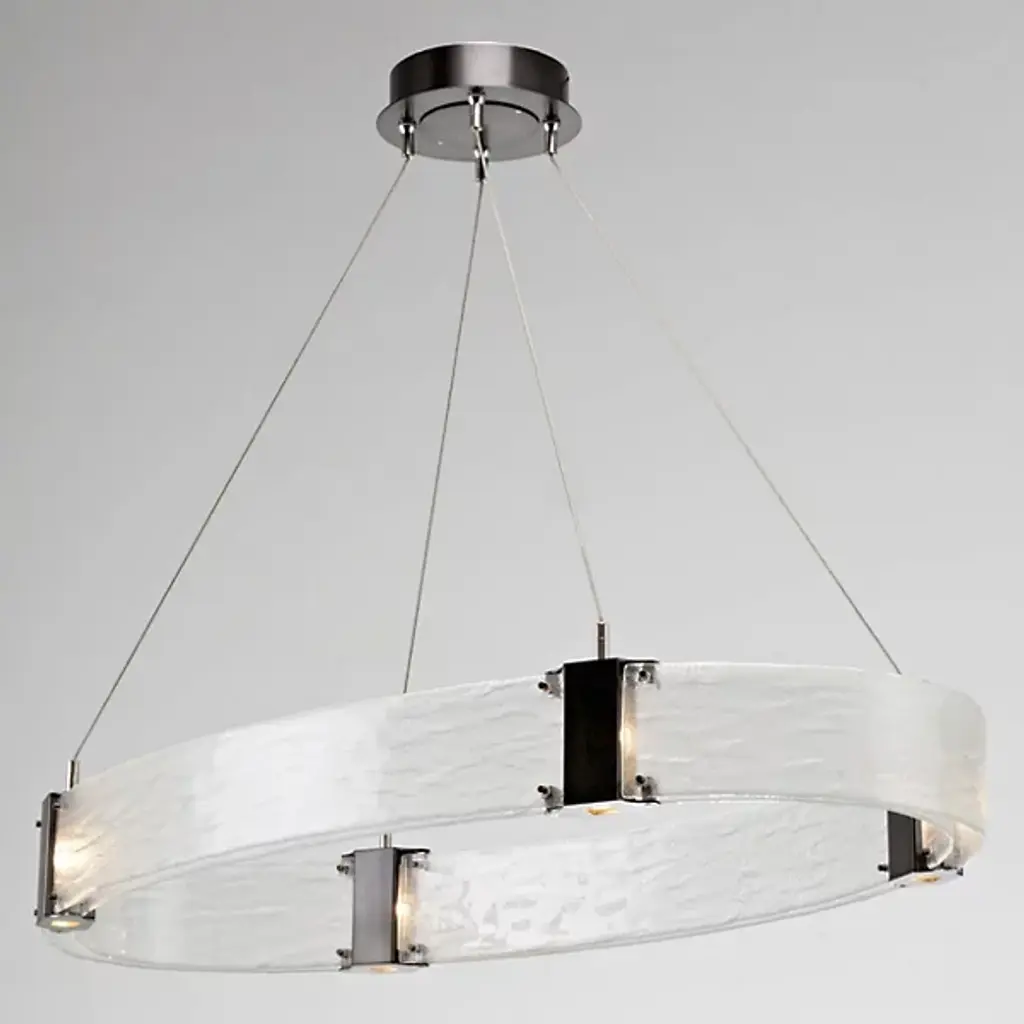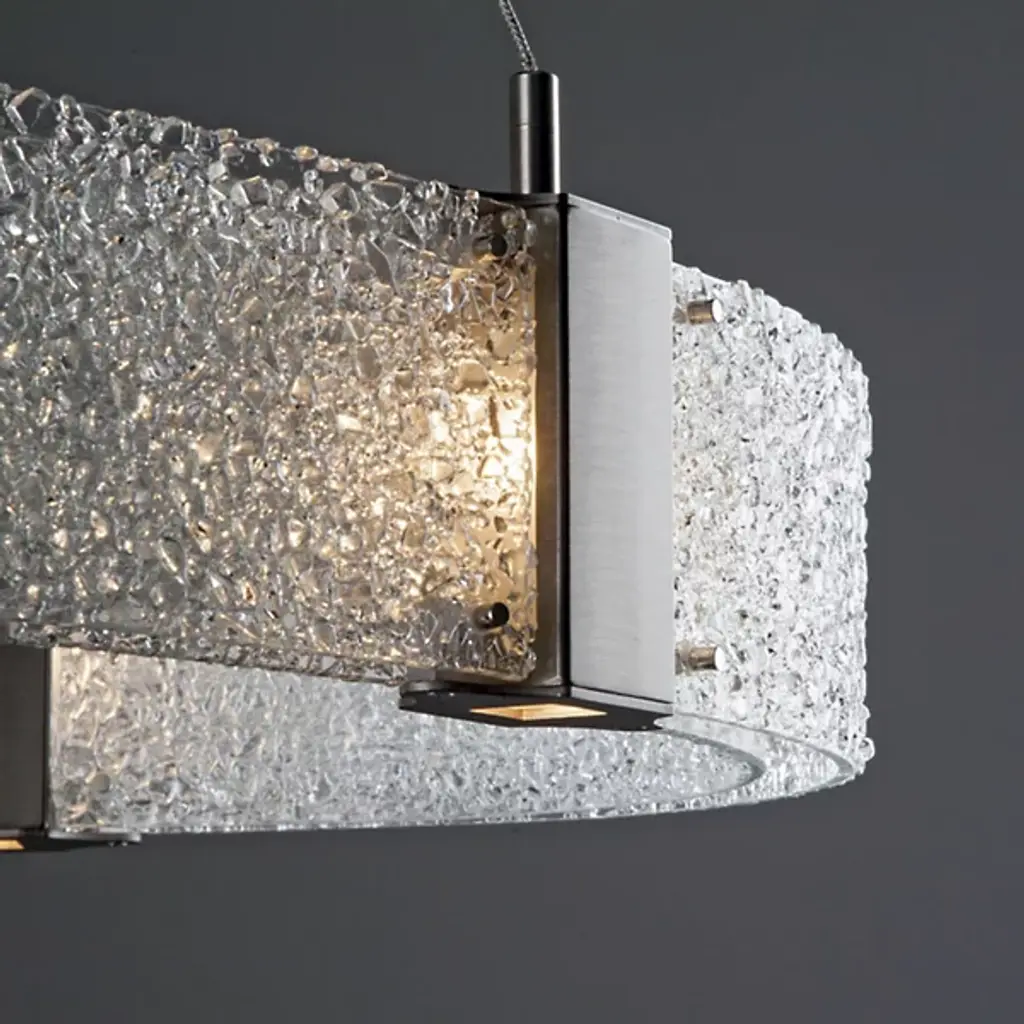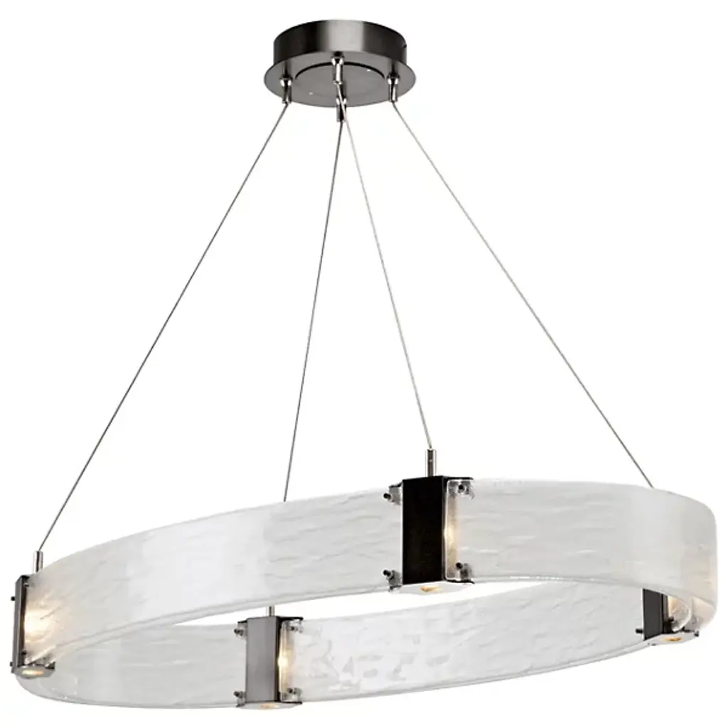 Artisanal luxury is paired with contemporary design in the Parallel Oval LED Chandelier by Hammerton Studio. Its ringed silhouette consists of parallel handcrafted, kiln-fused, textured glass panels that are joined by finished metal inserts. These metal inserts contain Cree brand integrated LEDs that sit flush behind Frosted Glass diffusers, pointed both down and sideways for a dazzling display once lit.