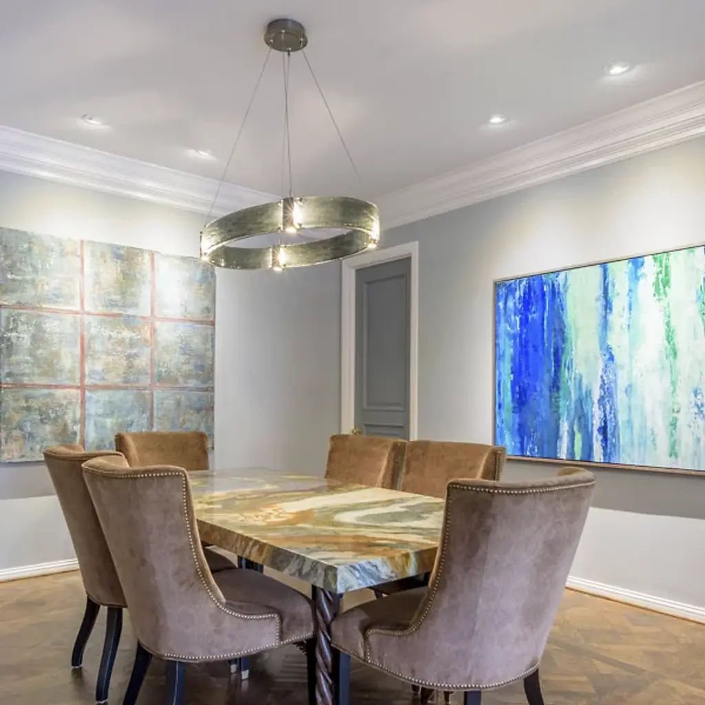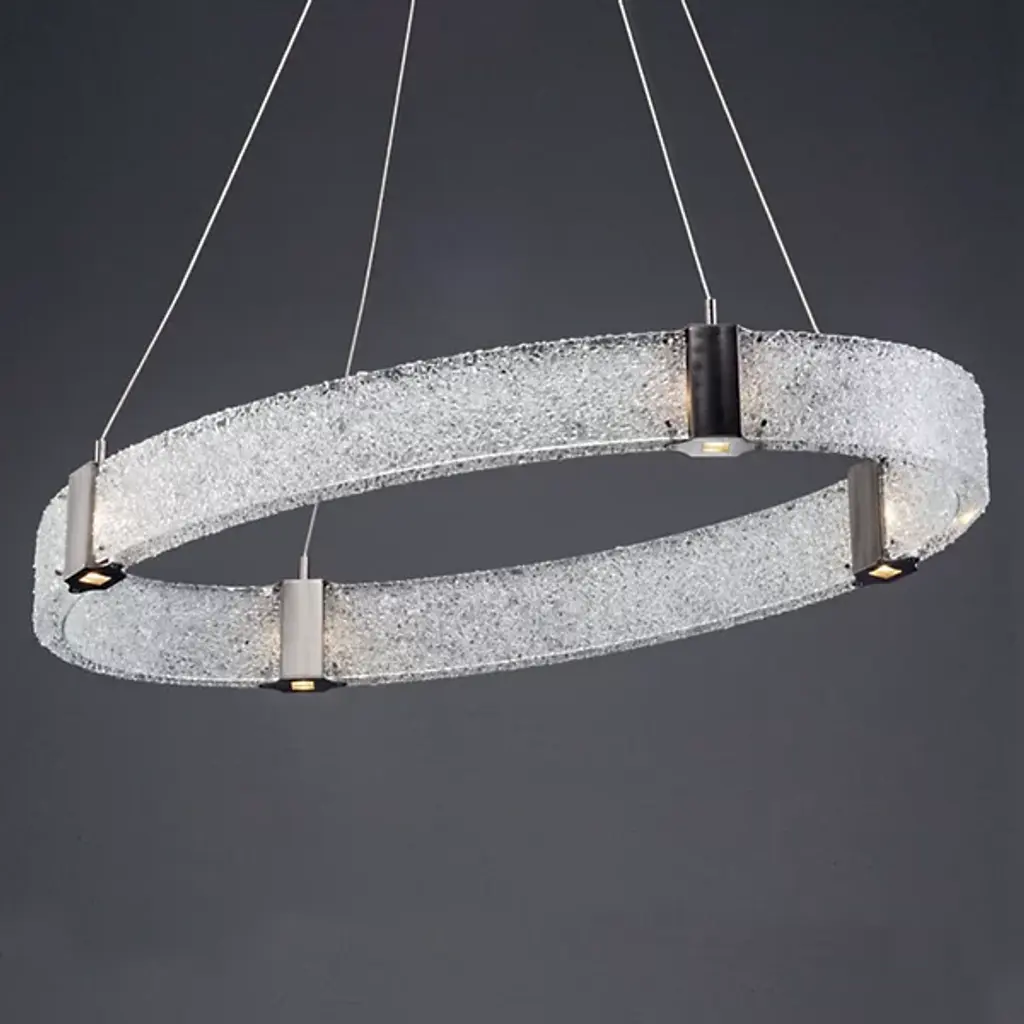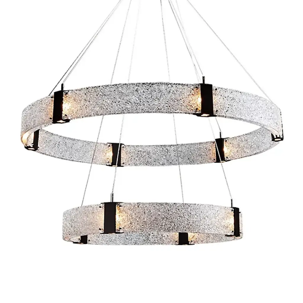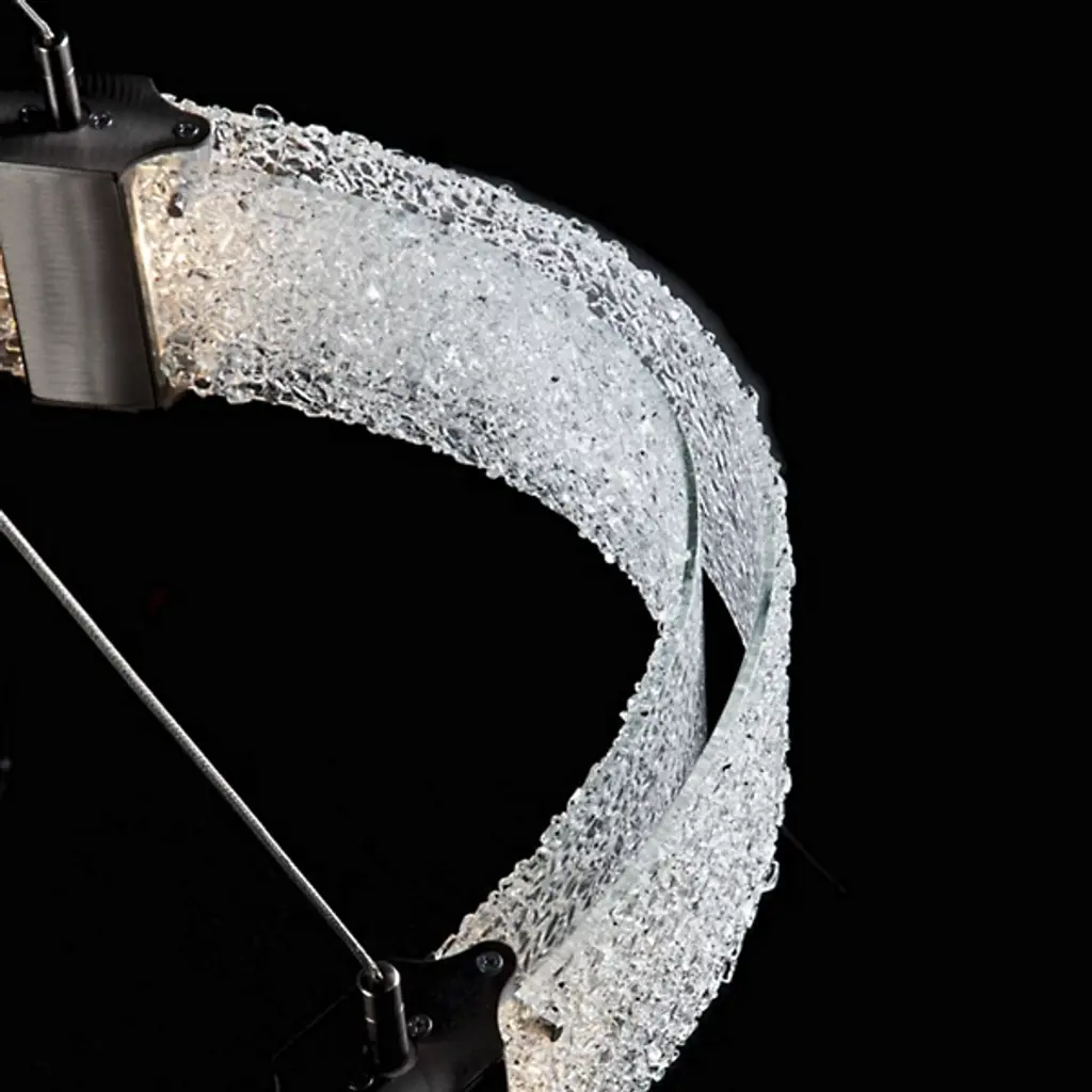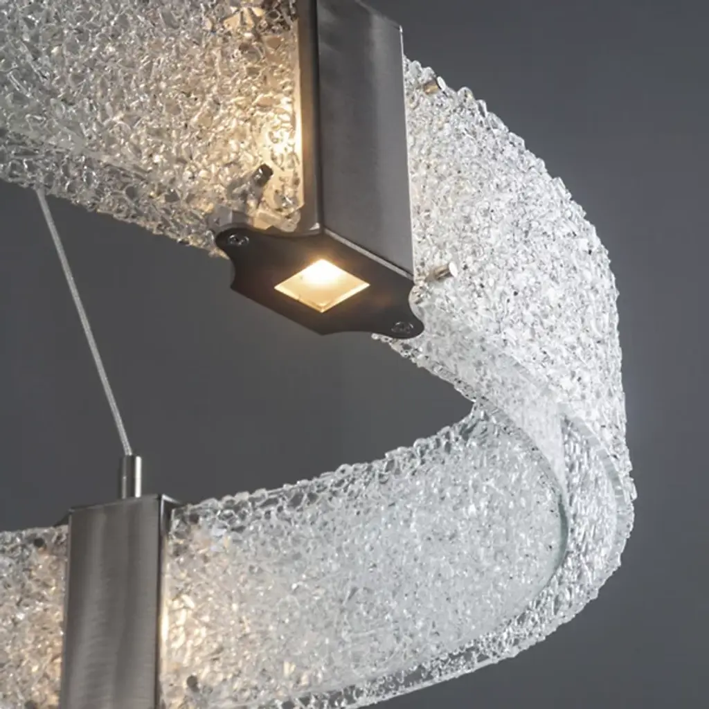 Artisanal luxury is paired with contemporary design in the Parallel Oval LED Chandelier by Hammerton Studio. Its ringed silhouette consists of parallel handcrafted, kiln-fused, textured glass panels that are joined by finished metal inserts. These metal inserts contain Cree brand integrated LEDs that sit flush behind Frosted Glass diffusers, pointed both down and sideways for a dazzling display once lit.