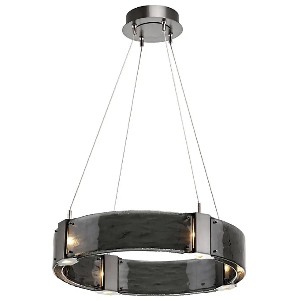 Artisanal luxury is paired with contemporary design in the Parallel Ring LED Chandelier by Hammerton Studio. Its ringed silhouette consists of parallel handcrafted, kiln-fused, textured glass panels that are joined by finished metal inserts. These metal inserts contain Cree brand integrated LEDs that sit flush behind Frosted Glass diffusers, pointed both down and sideways for a dazzling display once lit.