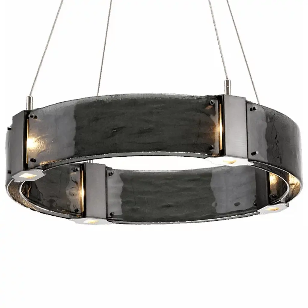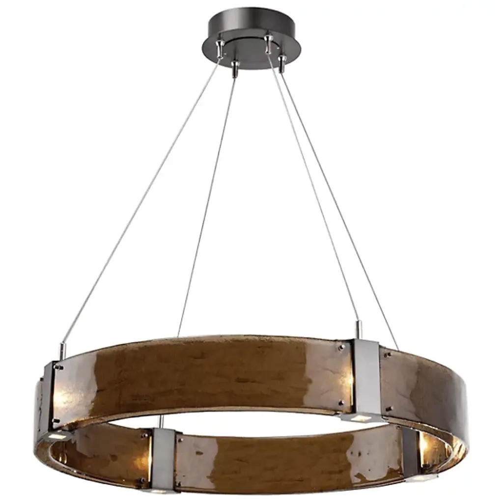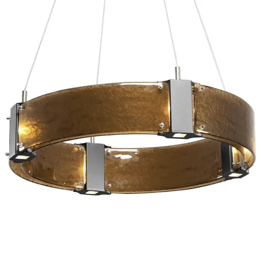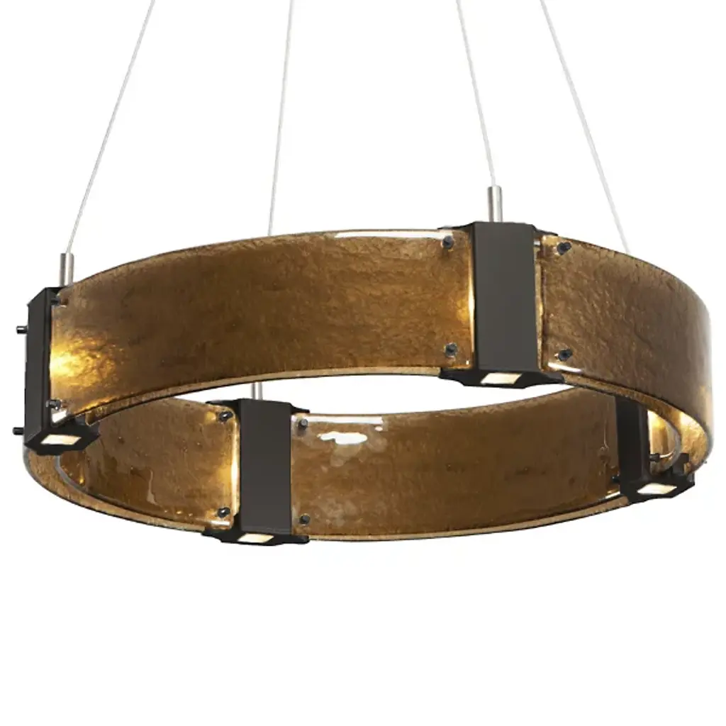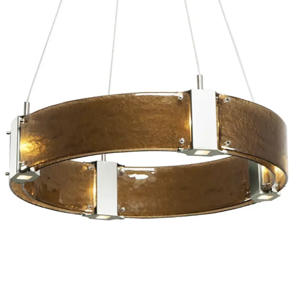 Artisanal luxury is paired with contemporary design in the Parallel Ring LED Chandelier by Hammerton Studio. Its ringed silhouette consists of parallel handcrafted, kiln-fused, textured glass panels that are joined by finished metal inserts. These metal inserts contain Cree brand integrated LEDs that sit flush behind Frosted Glass diffusers, pointed both down and sideways for a dazzling display once lit.