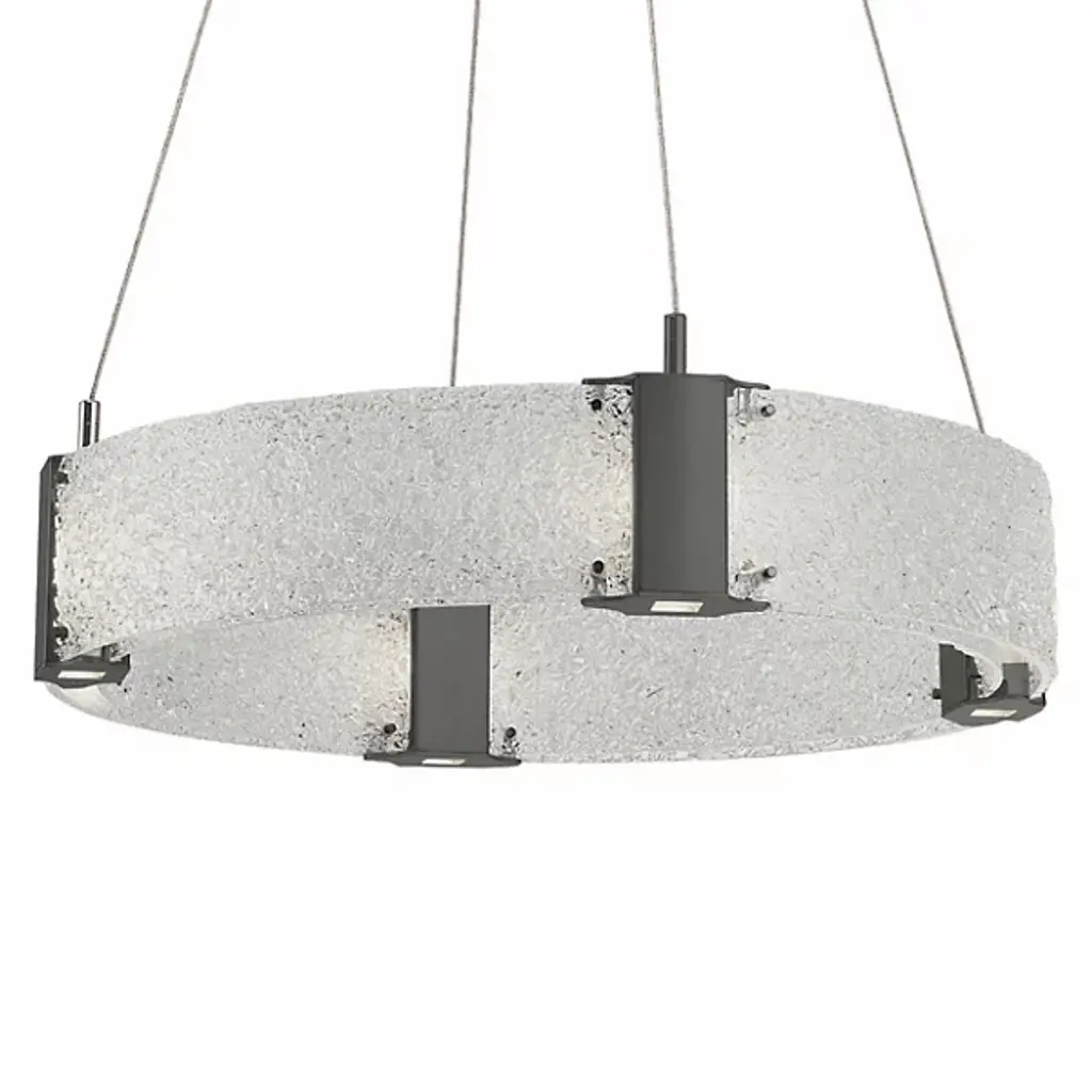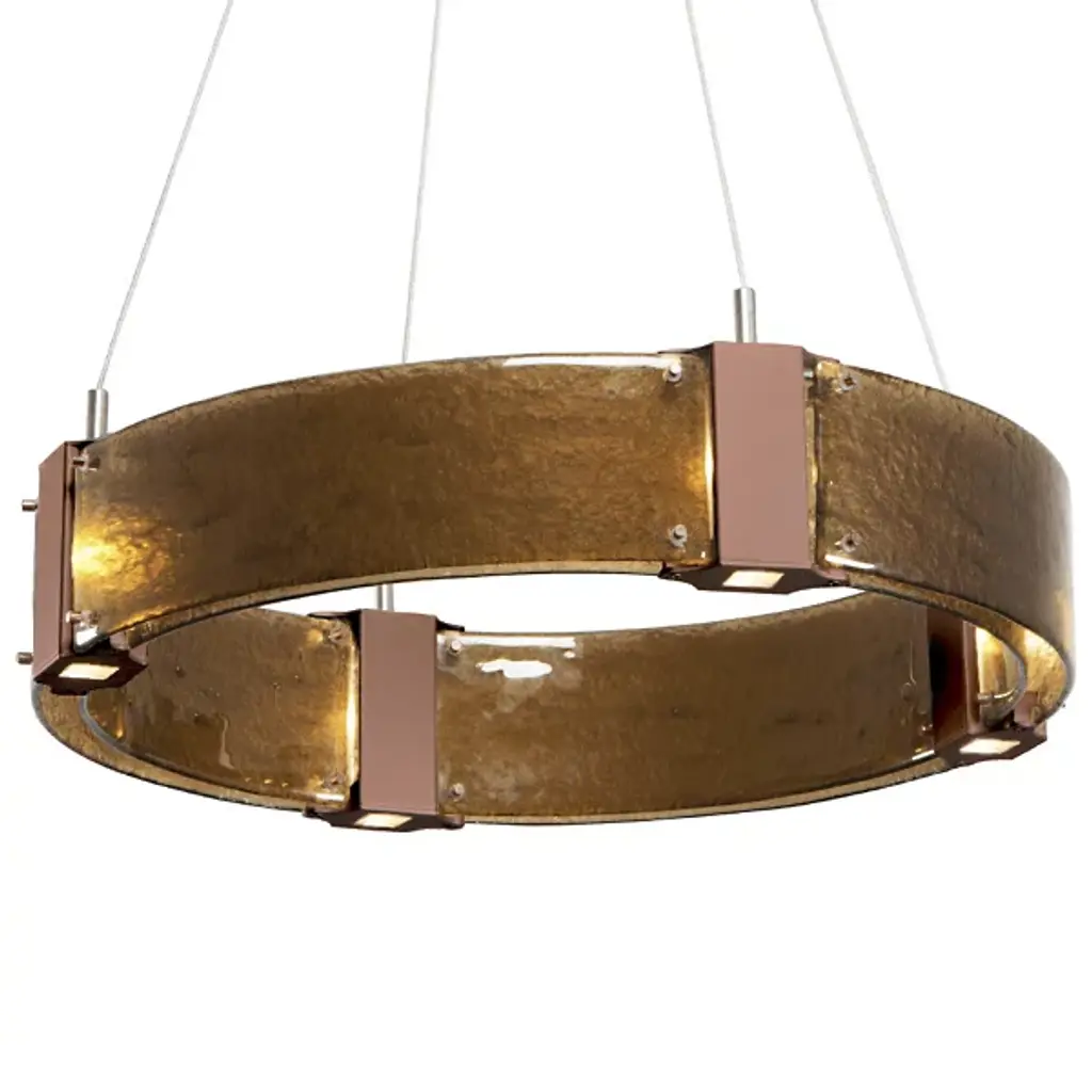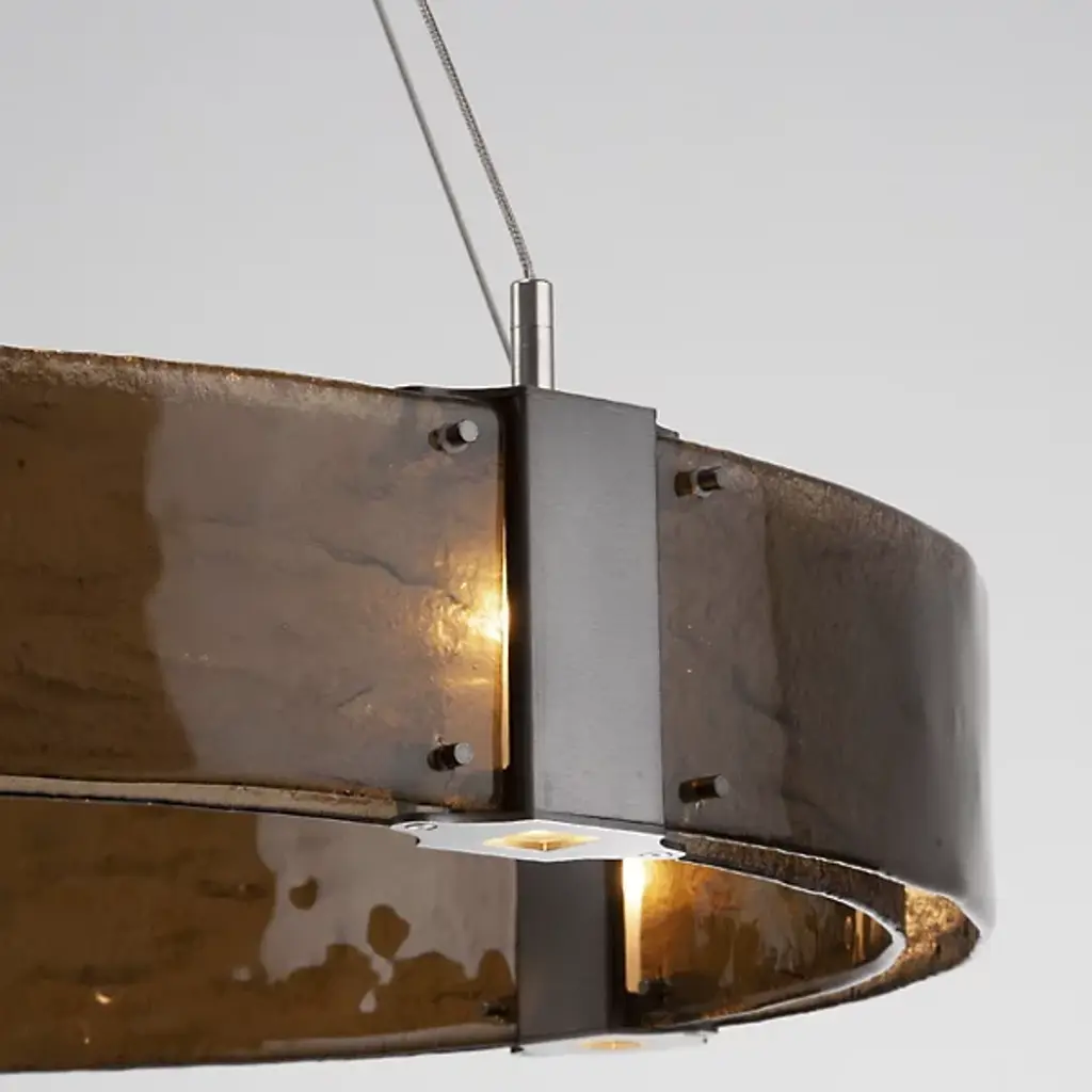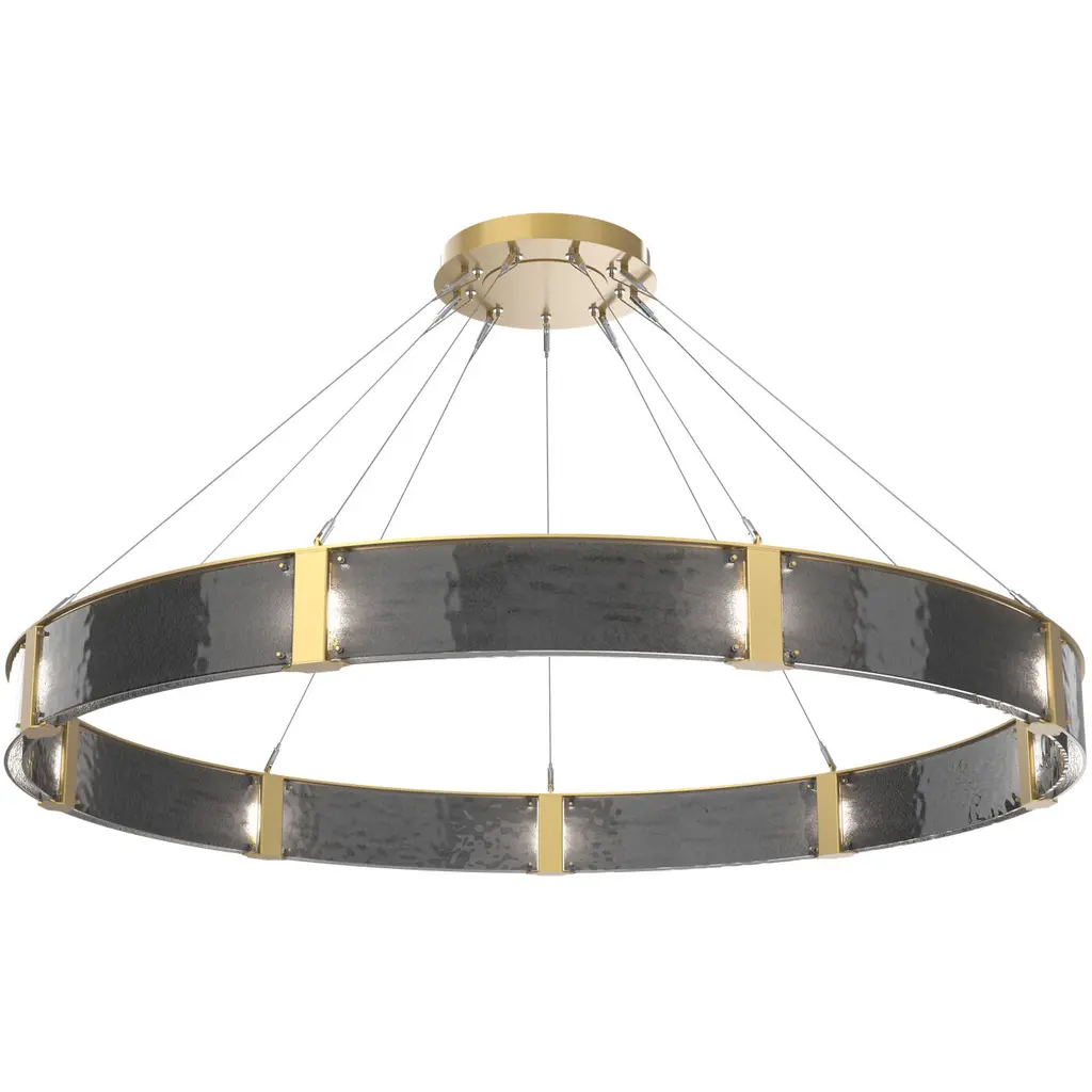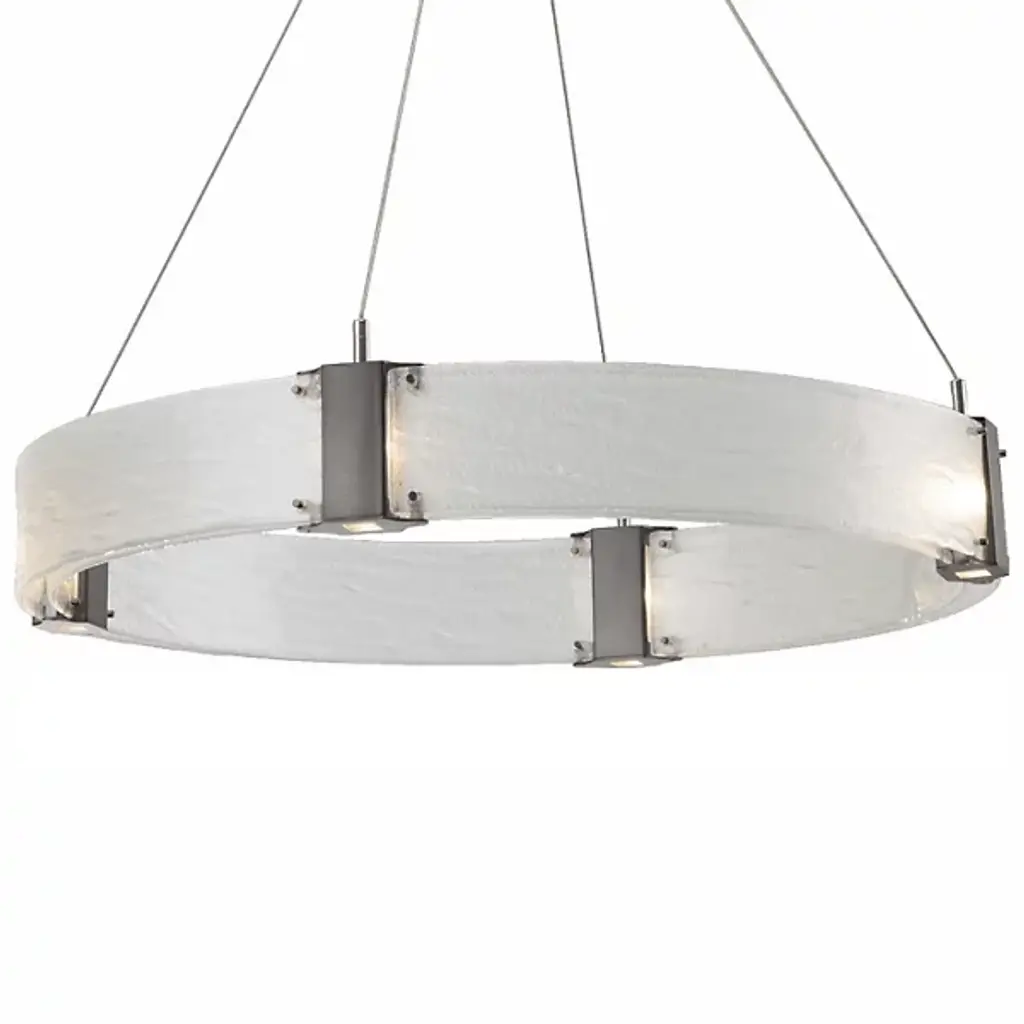 Artisanal luxury is paired with contemporary design in the Parallel Ring LED Chandelier by Hammerton Studio. Its ringed silhouette consists of parallel handcrafted, kiln-fused, textured glass panels that are joined by finished metal inserts. These metal inserts contain Cree brand integrated LEDs that sit flush behind Frosted Glass diffusers, pointed both down and sideways for a dazzling display once lit.