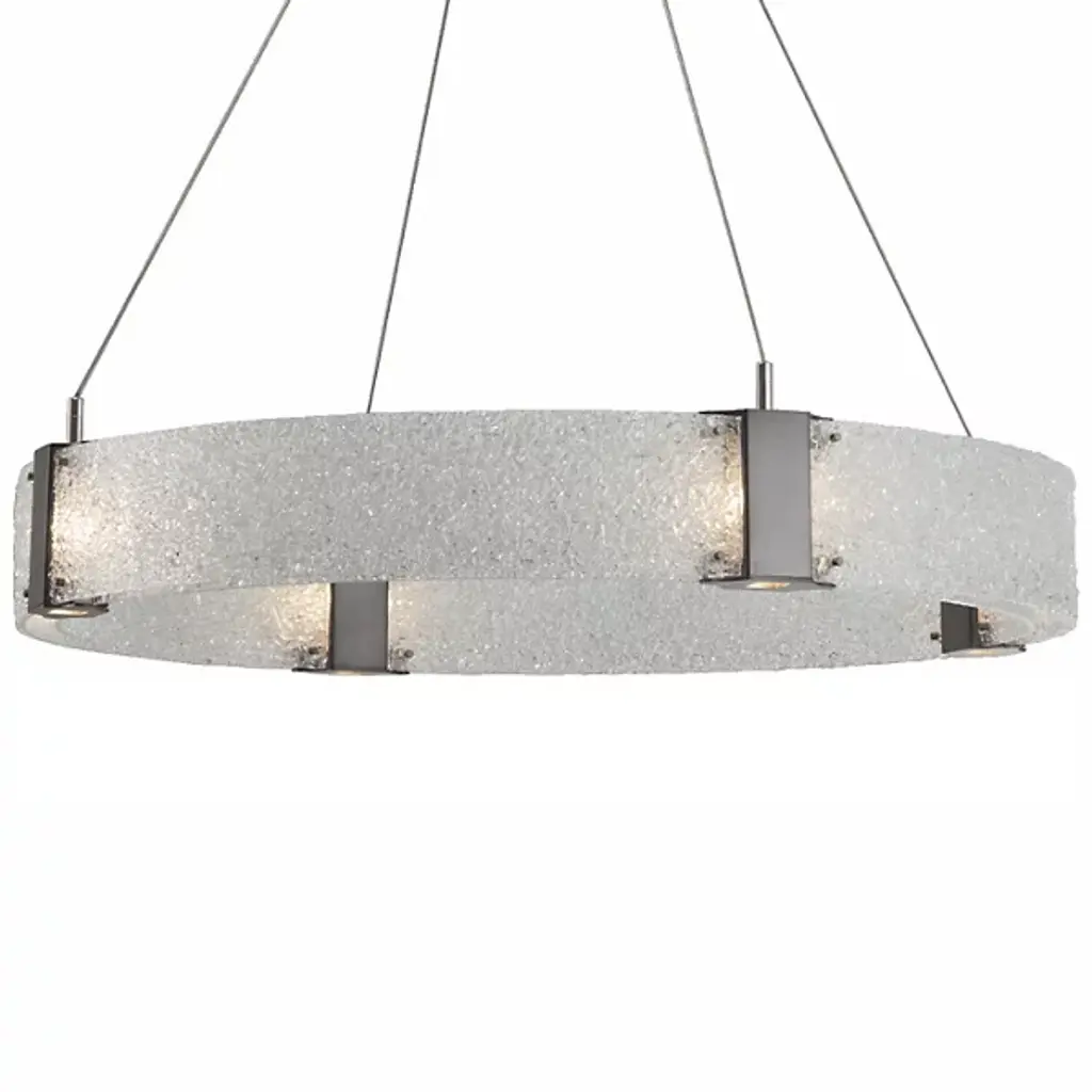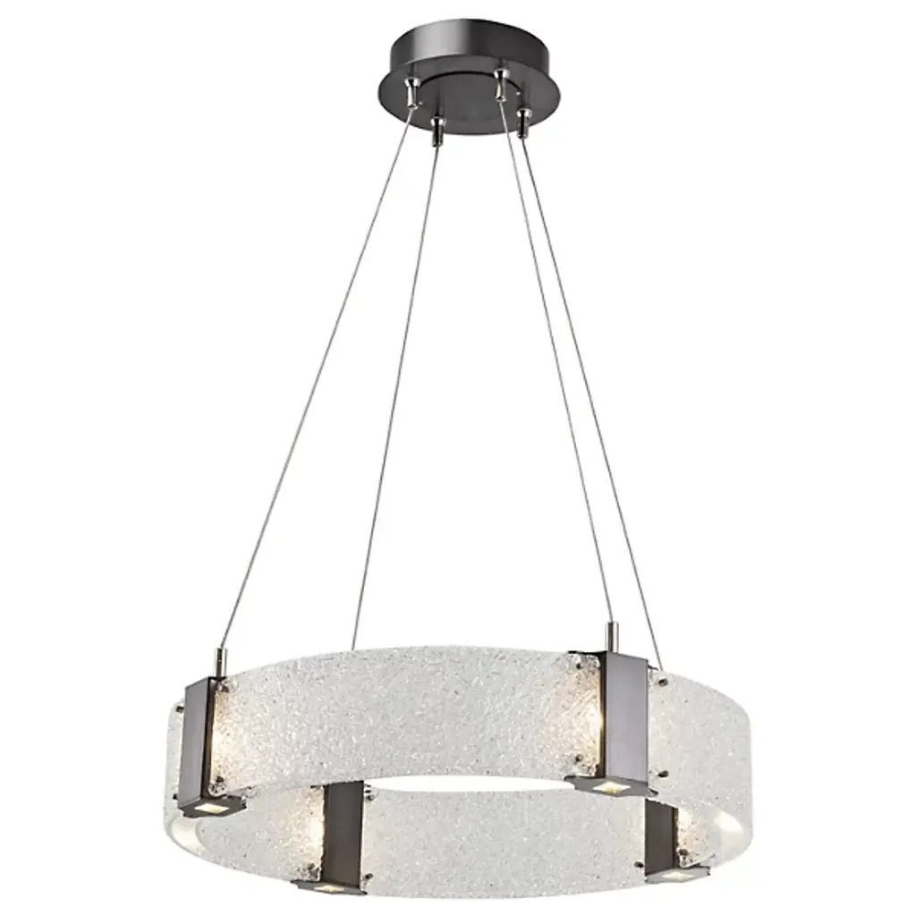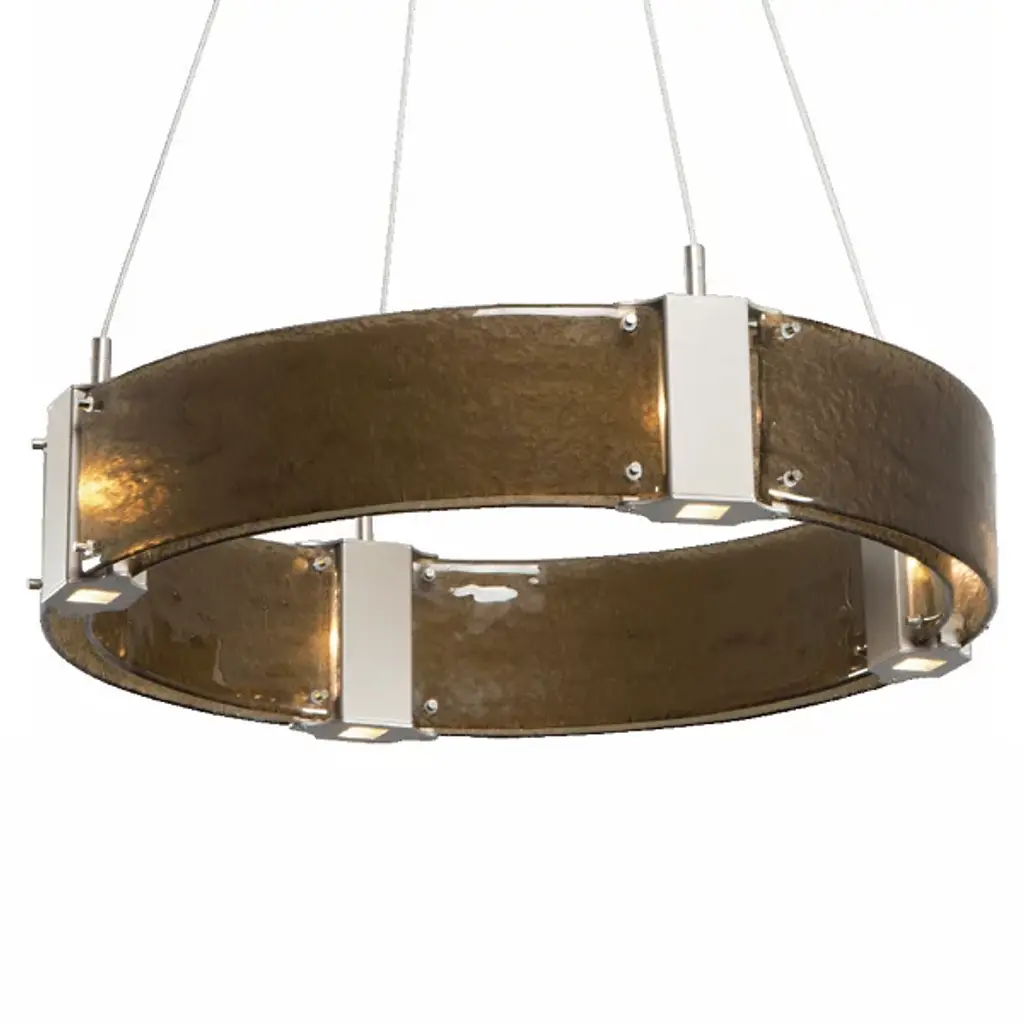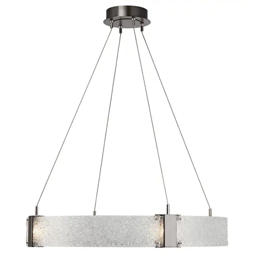 Artisanal luxury is paired with contemporary design in the Parallel Ring LED Chandelier by Hammerton Studio. Its ringed silhouette consists of parallel handcrafted, kiln-fused, textured glass panels that are joined by finished metal inserts. These metal inserts contain Cree brand integrated LEDs that sit flush behind Frosted Glass diffusers, pointed both down and sideways for a dazzling display once lit.