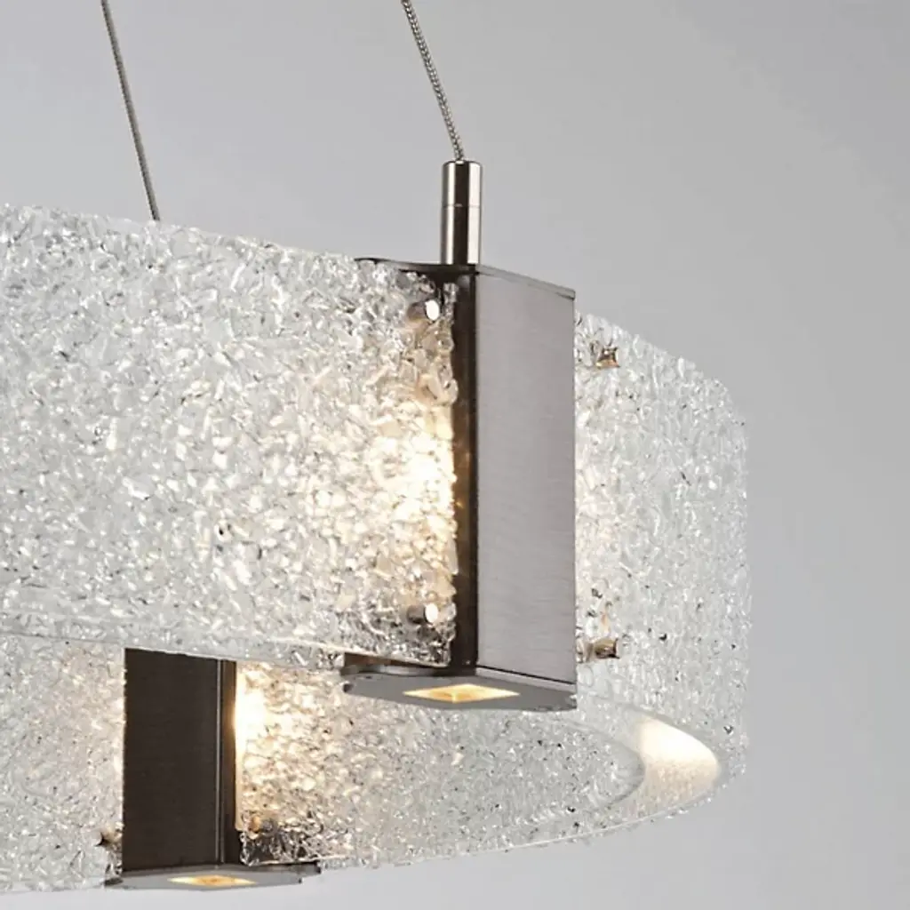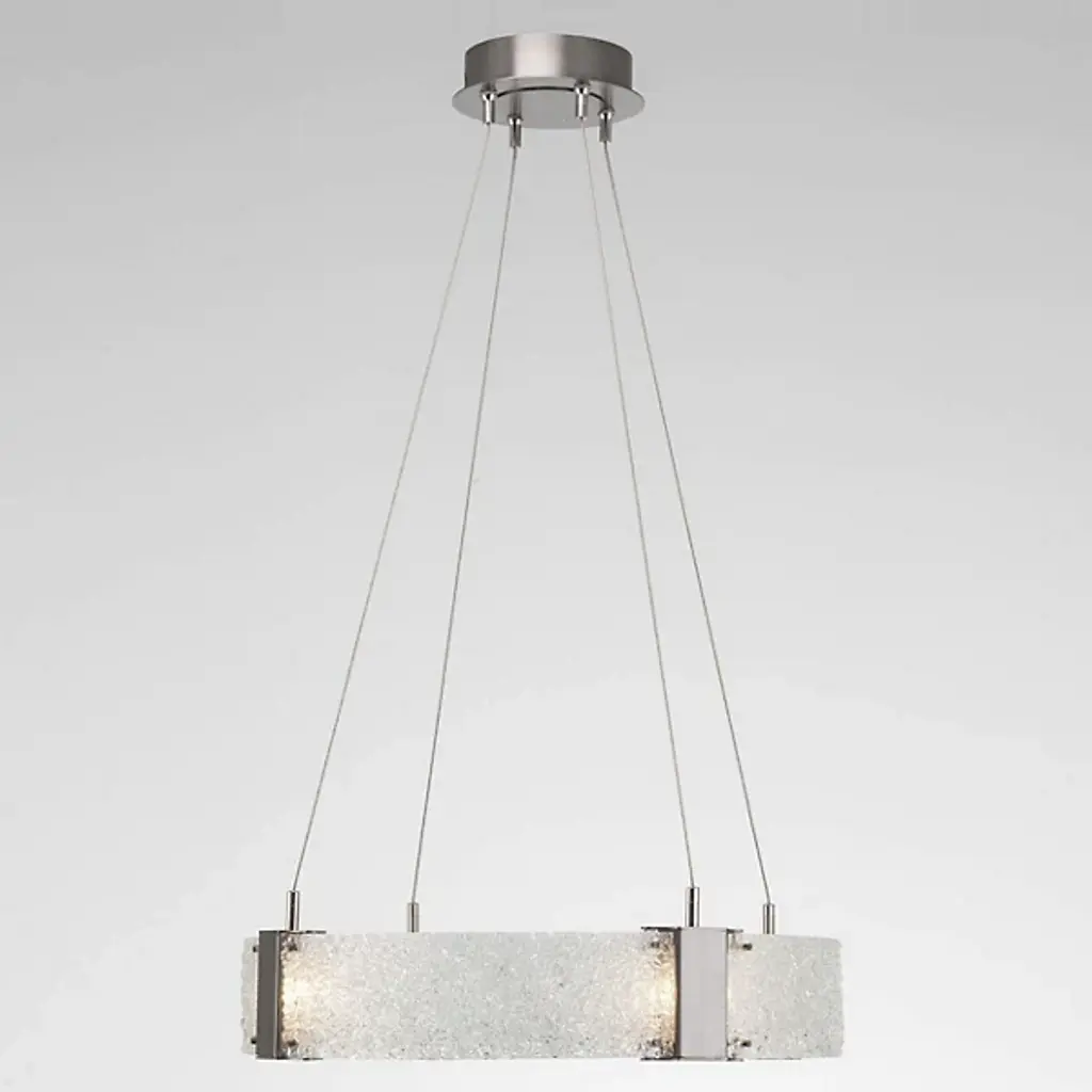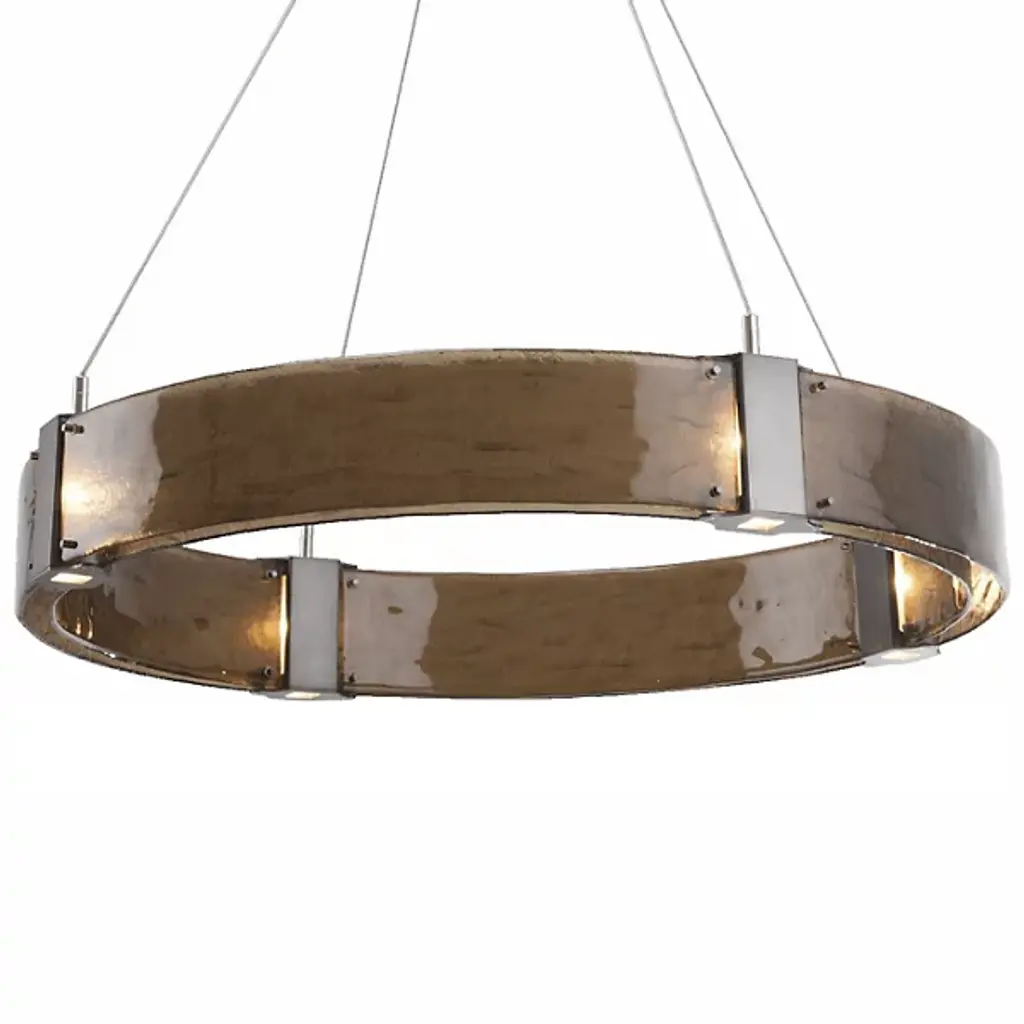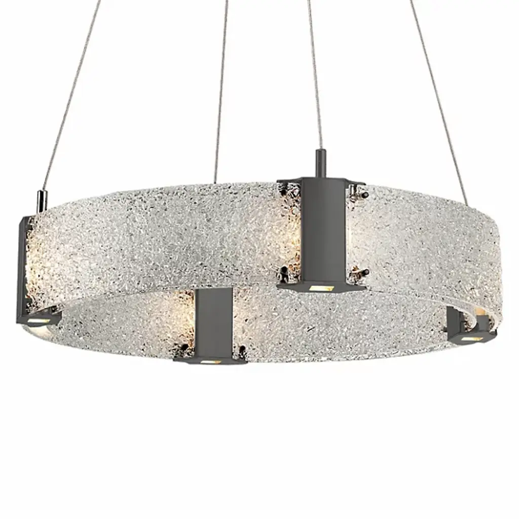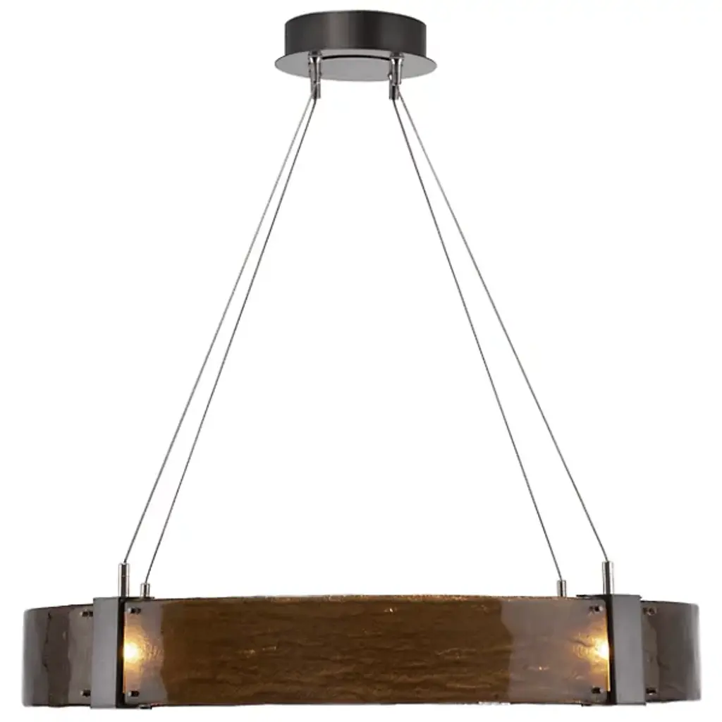 Artisanal luxury is paired with contemporary design in the Parallel Ring LED Chandelier by Hammerton Studio. Its ringed silhouette consists of parallel handcrafted, kiln-fused, textured glass panels that are joined by finished metal inserts. These metal inserts contain Cree brand integrated LEDs that sit flush behind Frosted Glass diffusers, pointed both down and sideways for a dazzling display once lit.