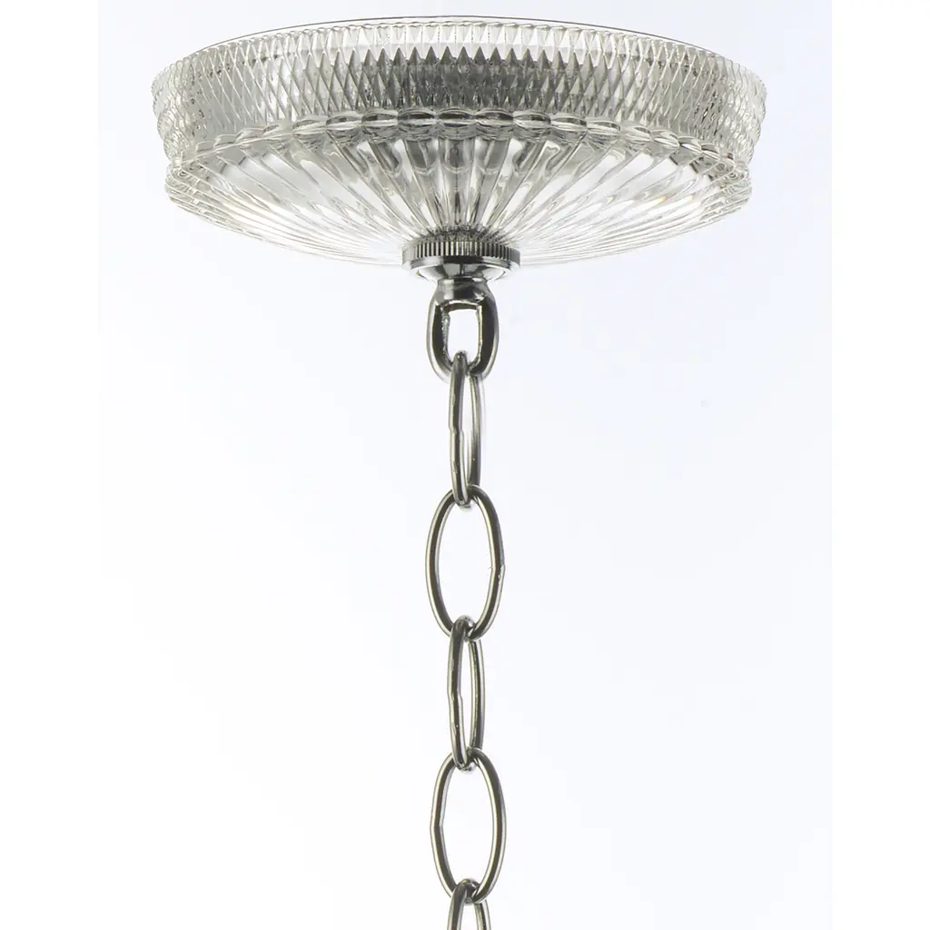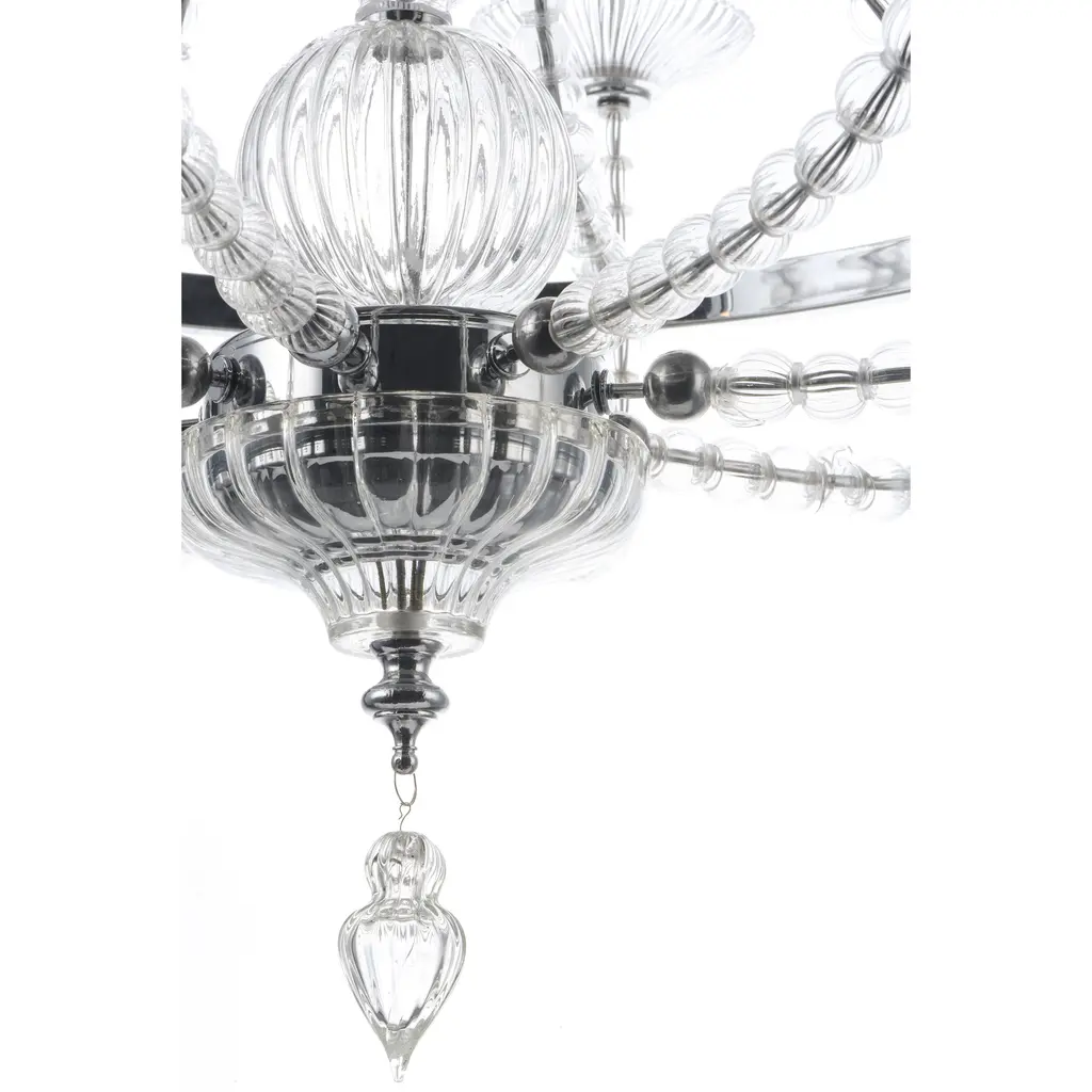This classic chandelier features frames of Polished Nickel adorned with hundreds of hand blown Clear glass balls and fonts. The ribbed design in the glass adds texture and shimmer to this classic and delicate design.